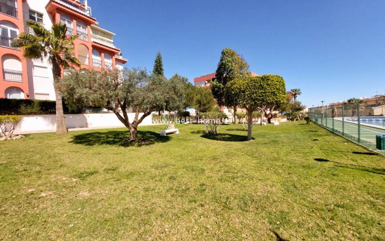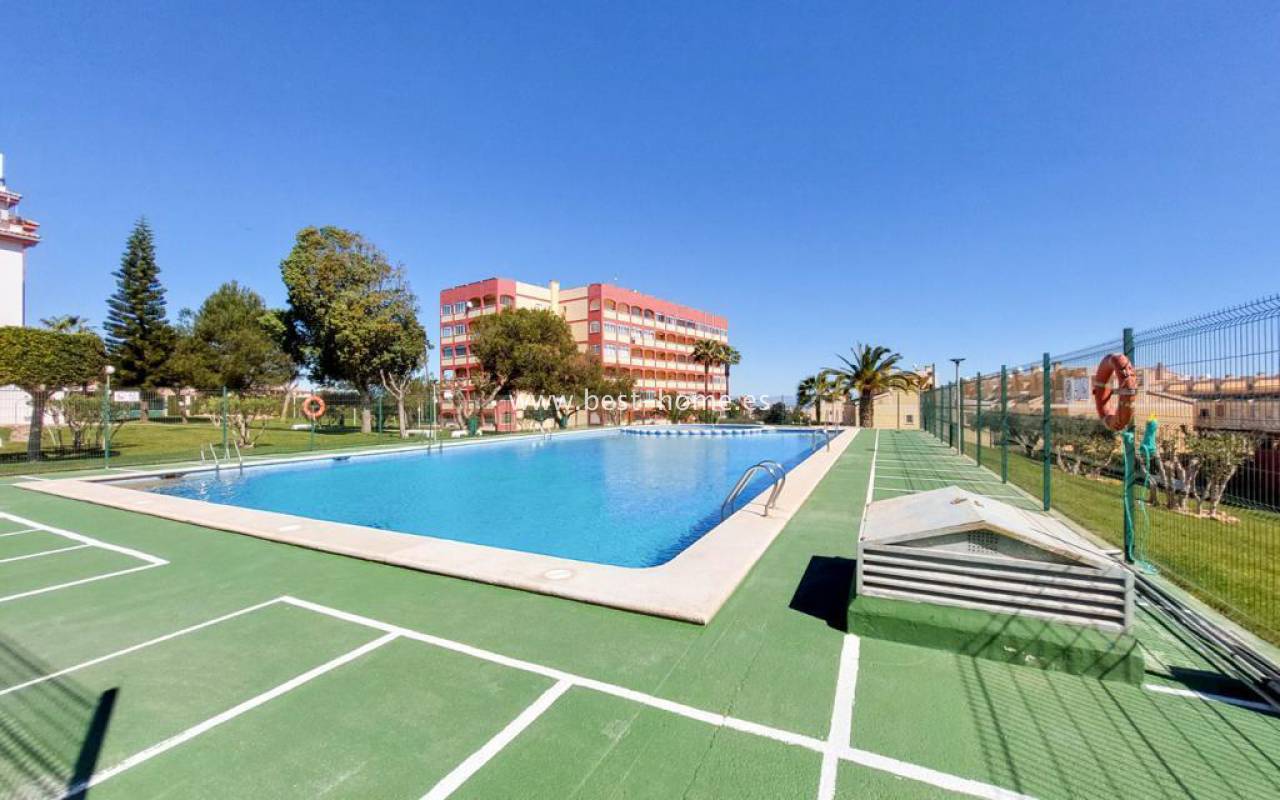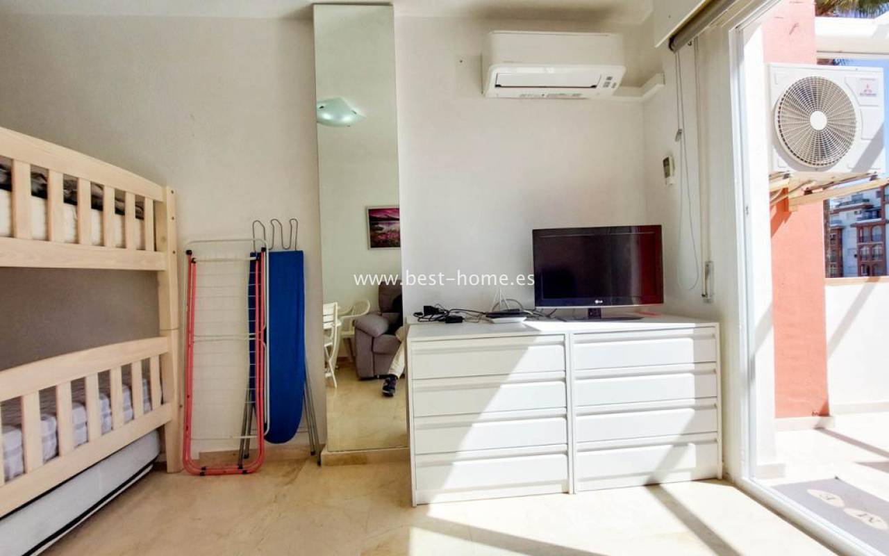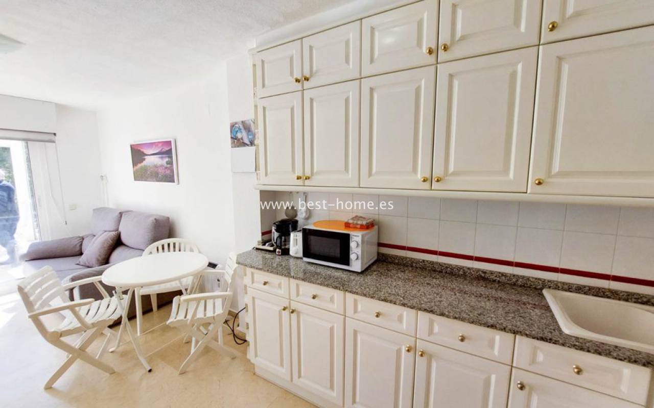 Studio in a beautiful green estate with a swimming pool for residents. The property has a room with kitchen, bathroom and a large sunny terrace overlooking the common areas. The studio is sold fully furnished.