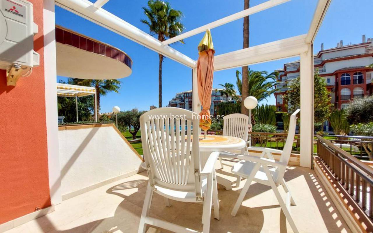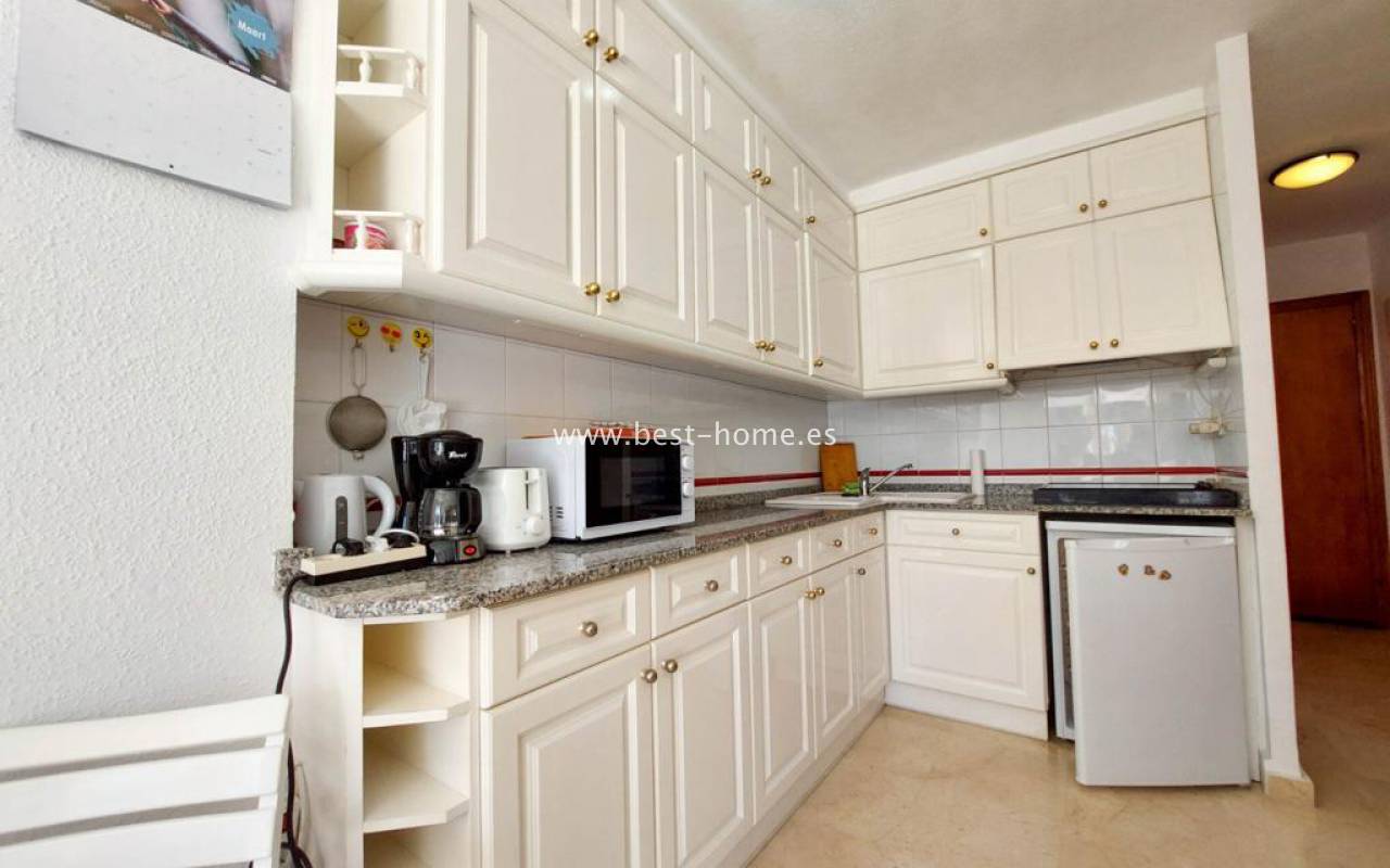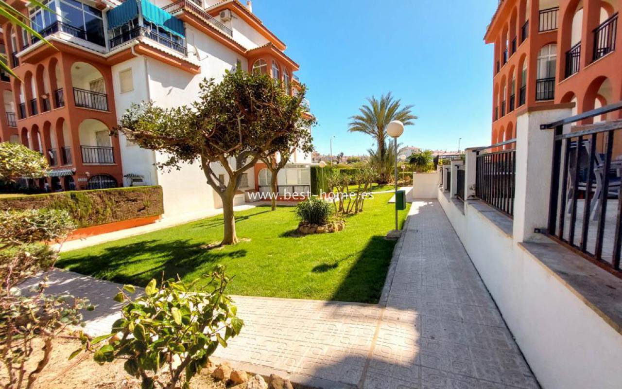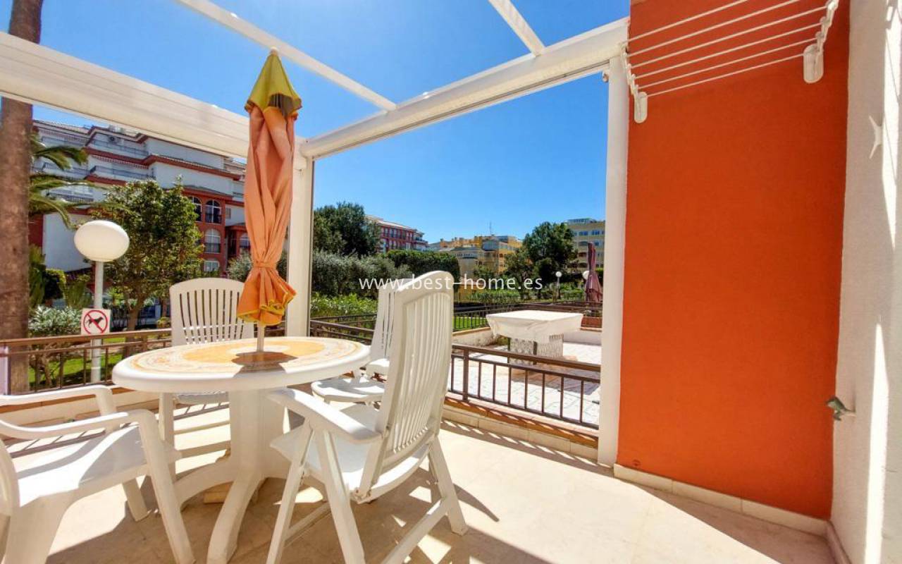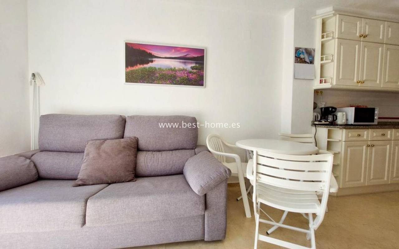 Studio in a beautiful green estate with a swimming pool for residents. The property has a room with kitchen, bathroom and a large sunny terrace overlooking the common areas. The studio is sold fully furnished.