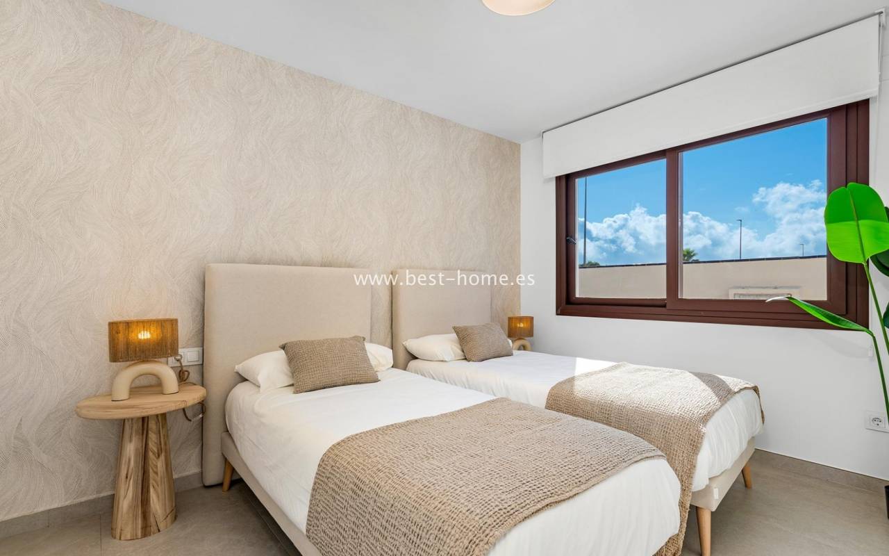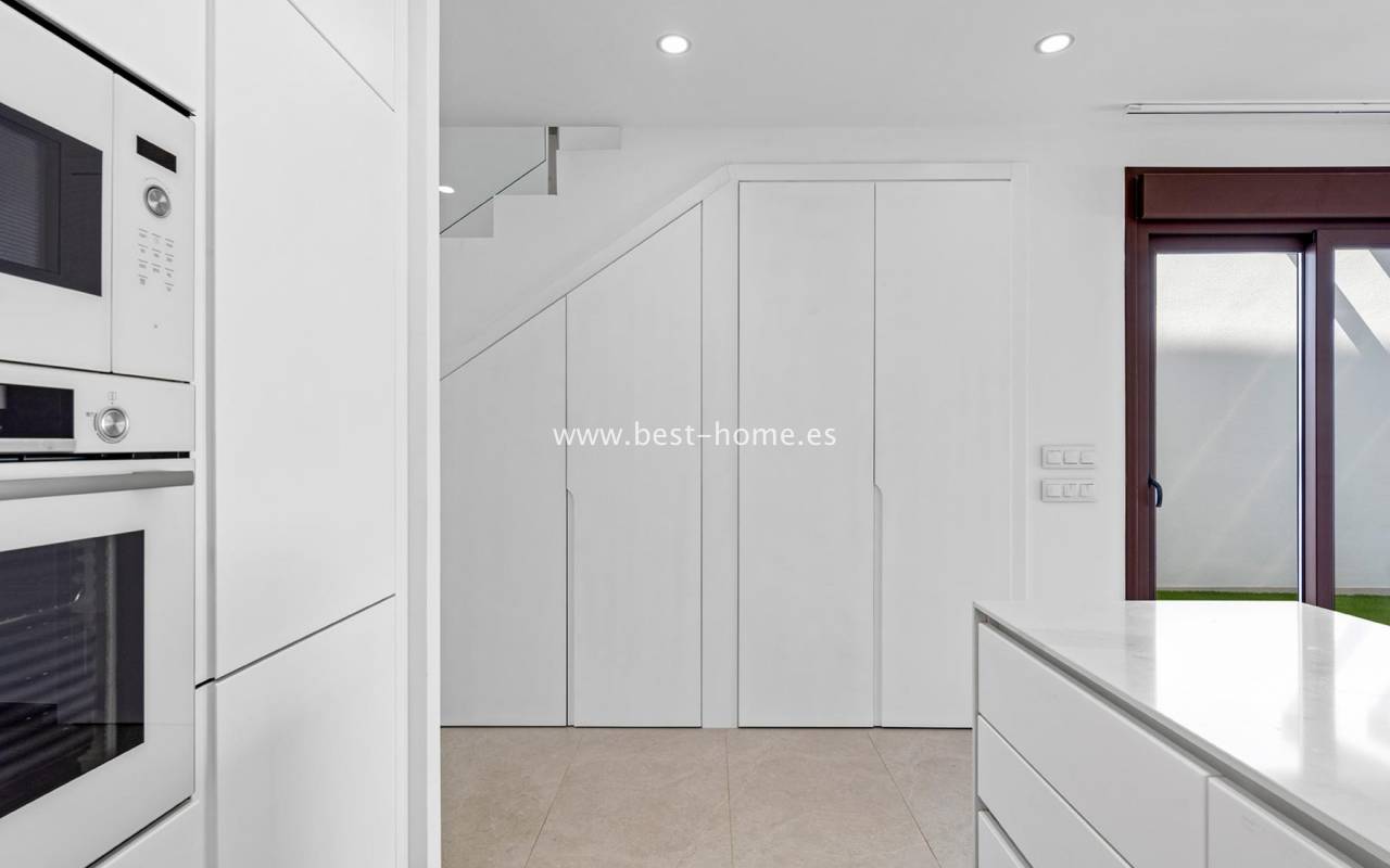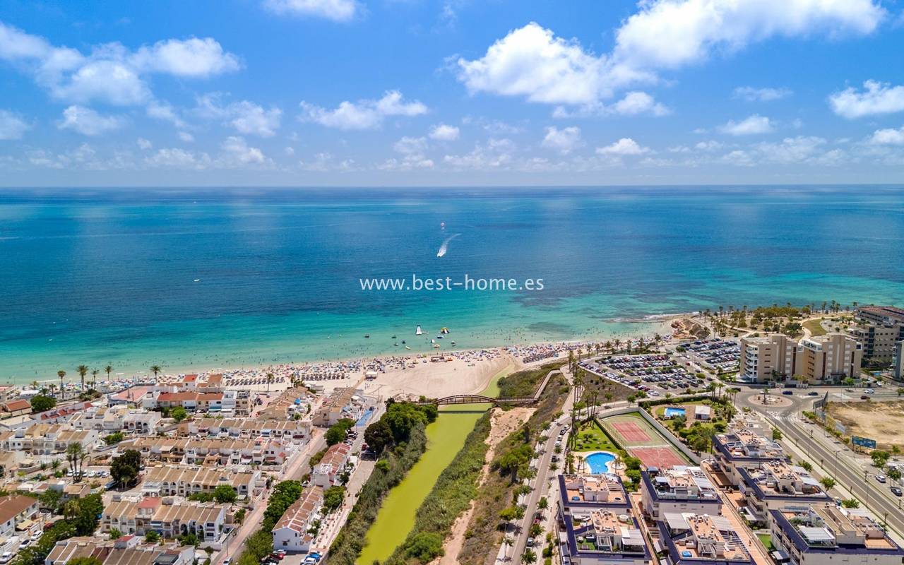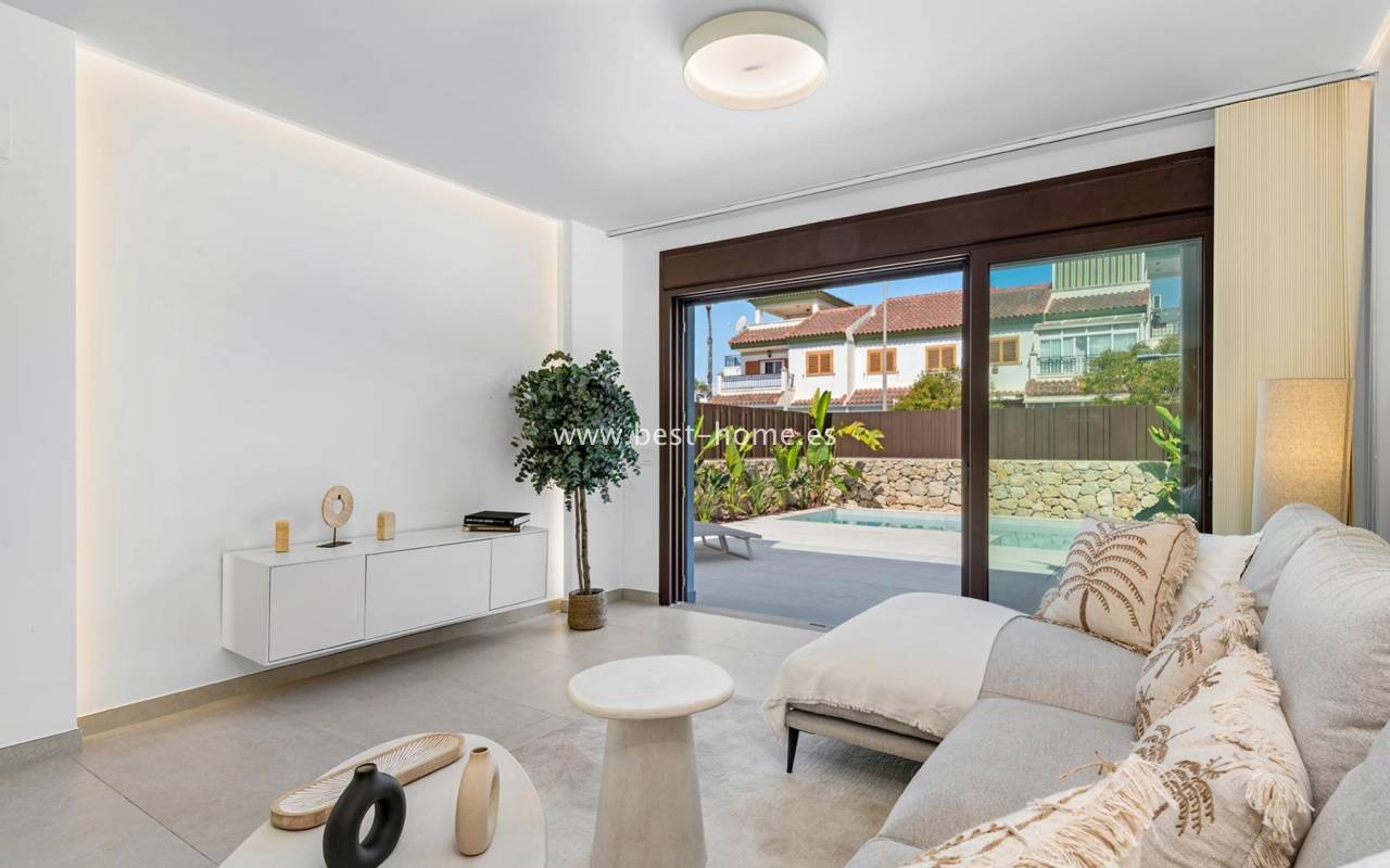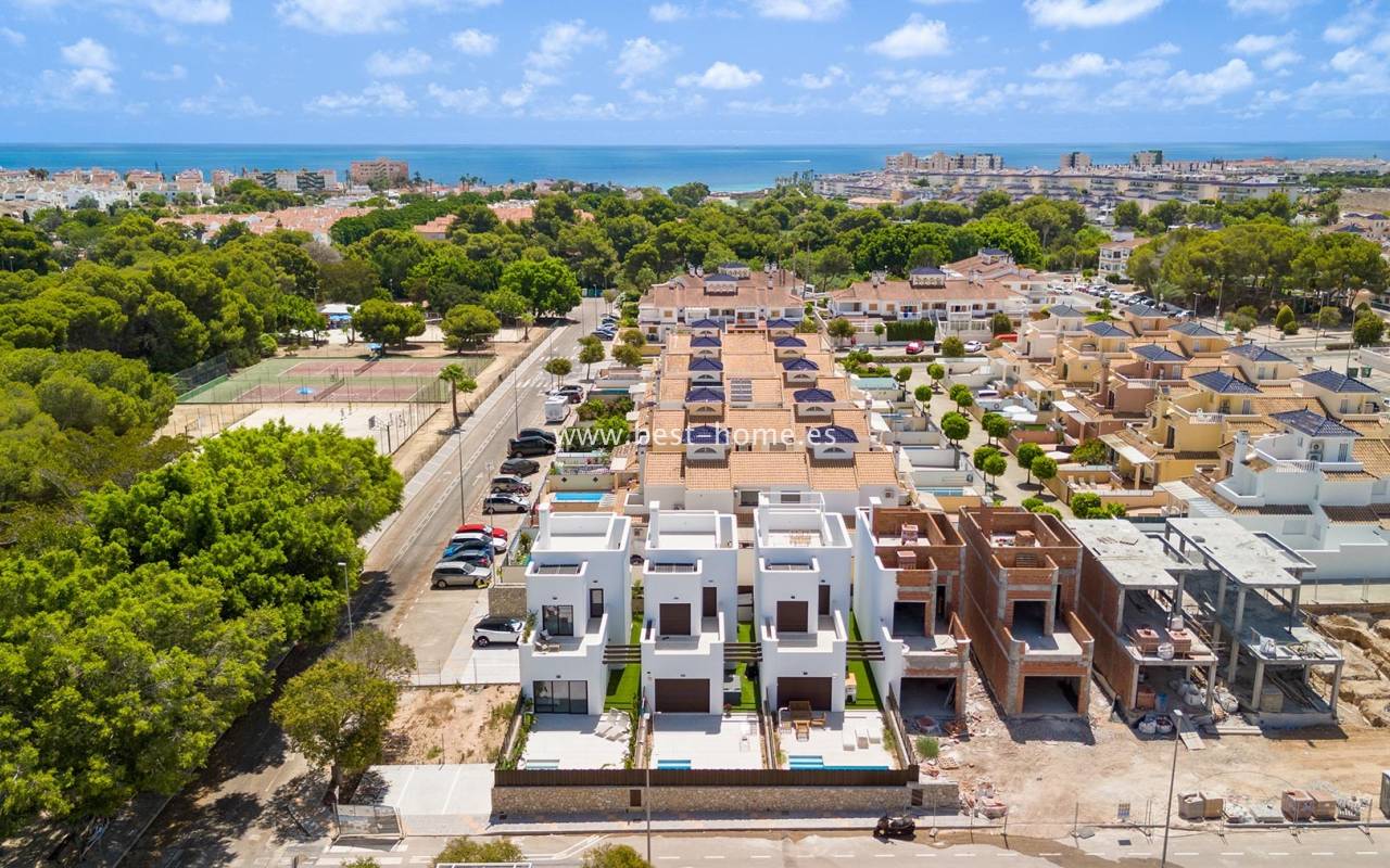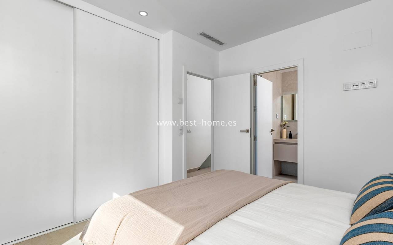 A new, housing estate consisting of beautiful Spanish villas in a Mediterranean style. The houses will be built in a great location, by the well-known, sandy beach of Mil Palmeras. On the ground floor, the house will have a spacious living room with dining area, a furnished kitchen, one bedroom and a bathroom. From the living room there will be an exit to the terrace and to the private swimming pool. On the first floor we will find two bedrooms and two bathrooms. There is access to the terrace from the master bedroom and hallway. On the second floor we will find a solarium/terrace on the roof with an area of 29 m2. The price includes kitchen furniture, finished bathrooms, pre-installation of air conditioning and a private swimming pool. Fantastic finish and great location.