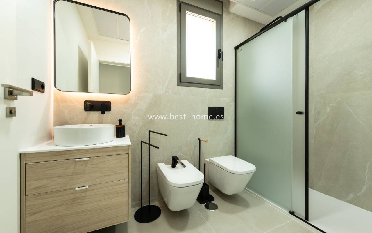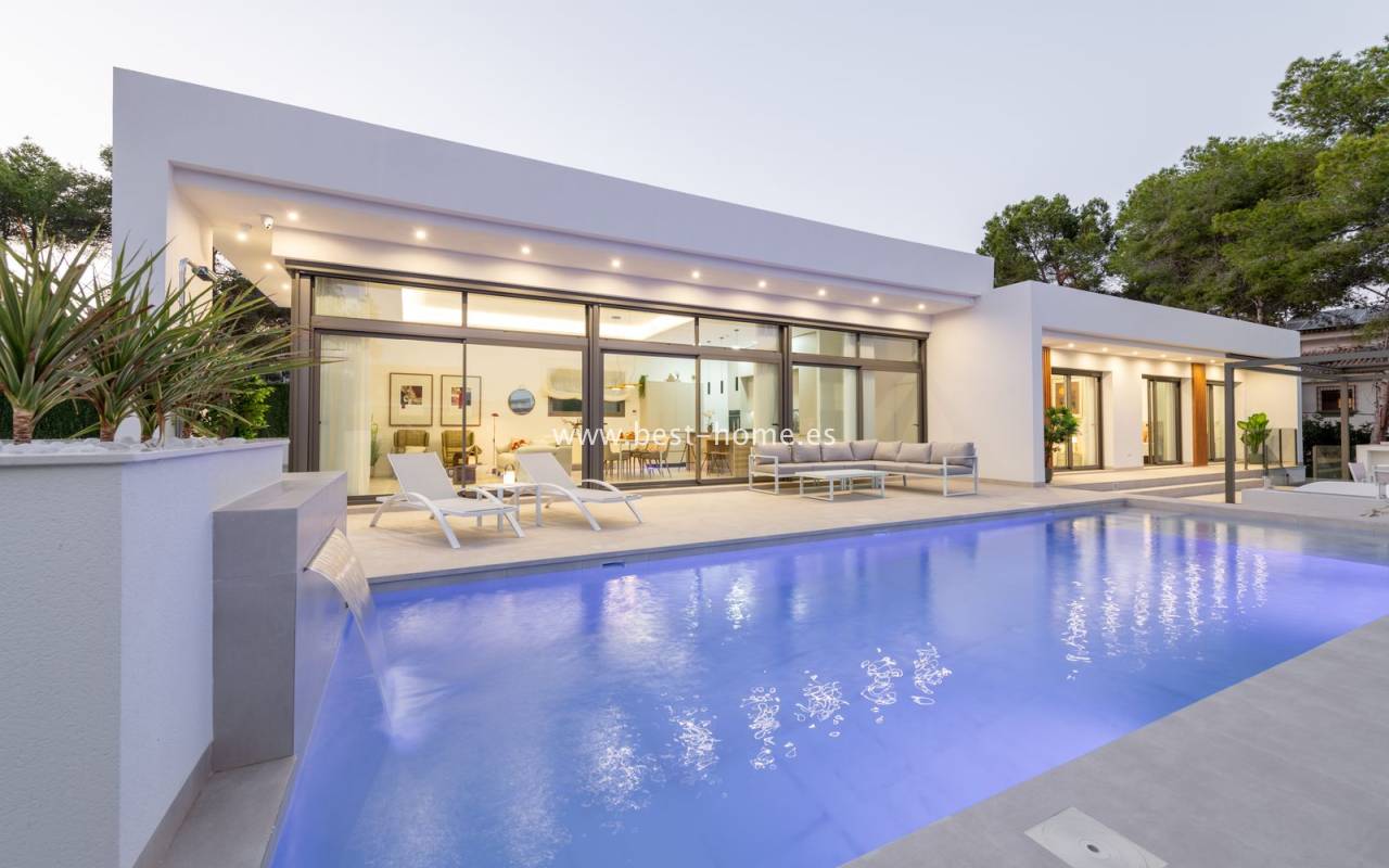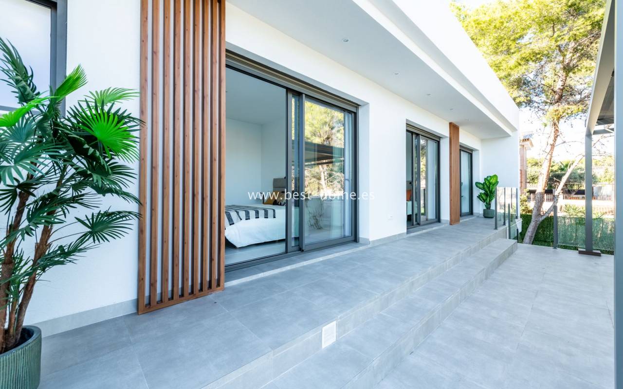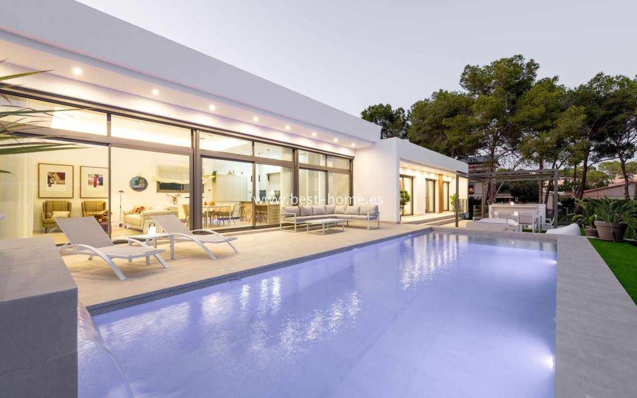 New, fantastic bungalows will be built in the very attractive, charming and green town of Pinar de Campoverde. The 140 m2 houses will consist of a large, bright and sunny living room with a dining area and a furnished kitchen with an island, a toilet, a master bedroom with a dressing room and a bathroom, two further bedrooms, a second bathroom and a laundry/utility room. From the living room, in front of large, sliding windows, there will be an exit to the terrace, private swimming pool and garden. By the pool we will find a chill-out zone and a summer kitchen. In addition, the house has a basement / garage with an area of 48 m2. The price includes kitchen furniture with household appliances, external and internal lighting, built-in wardrobes, complete bathrooms, electric blinds,