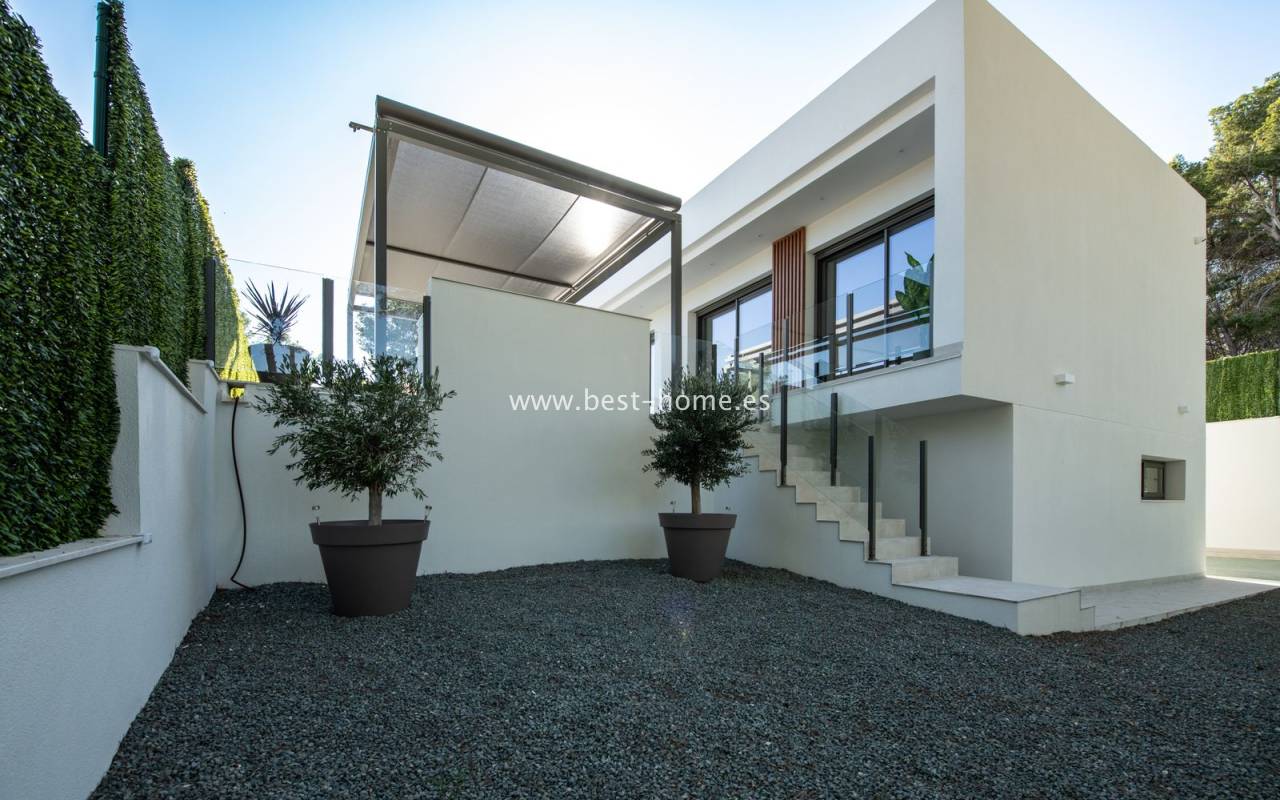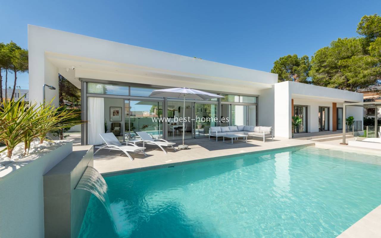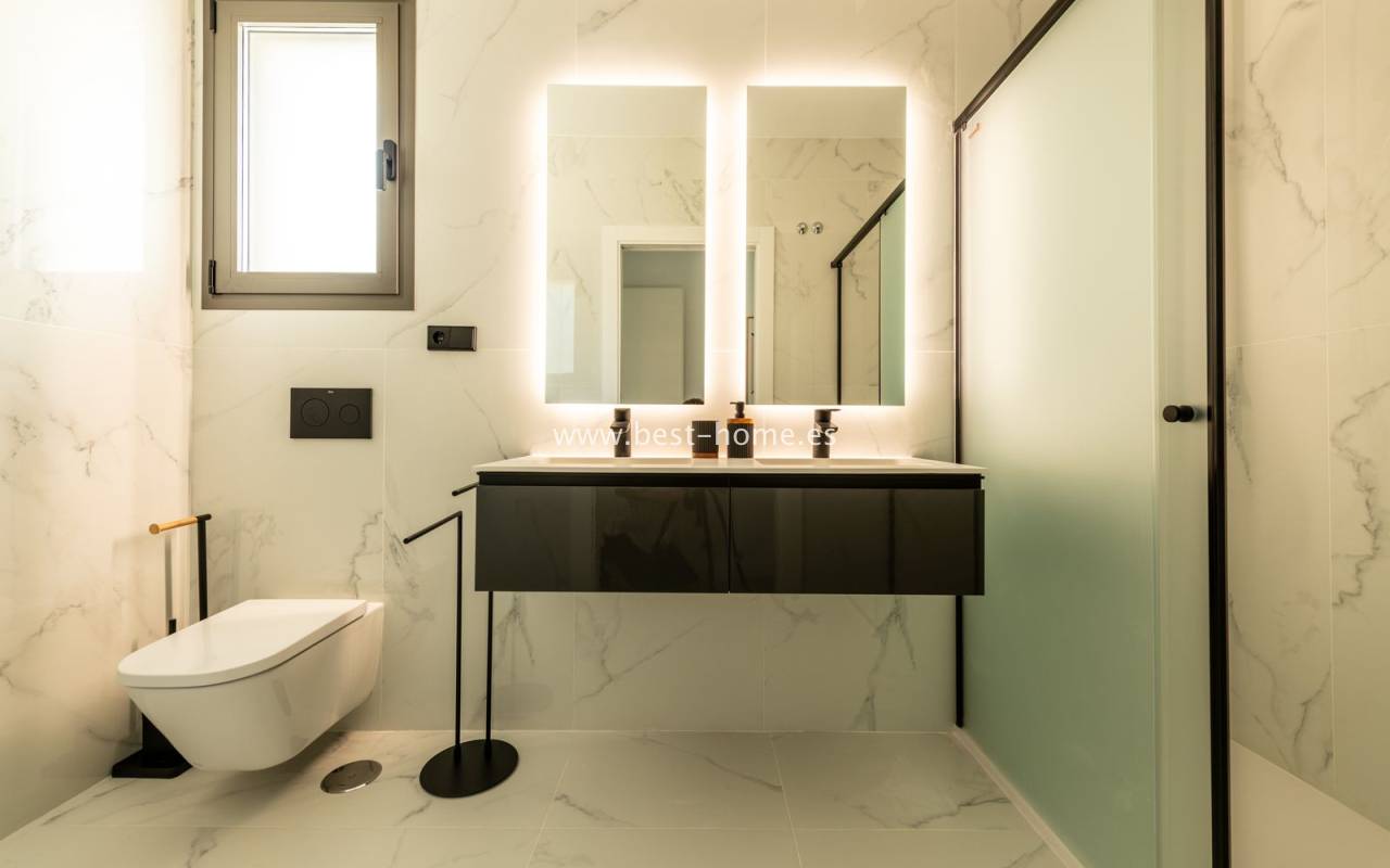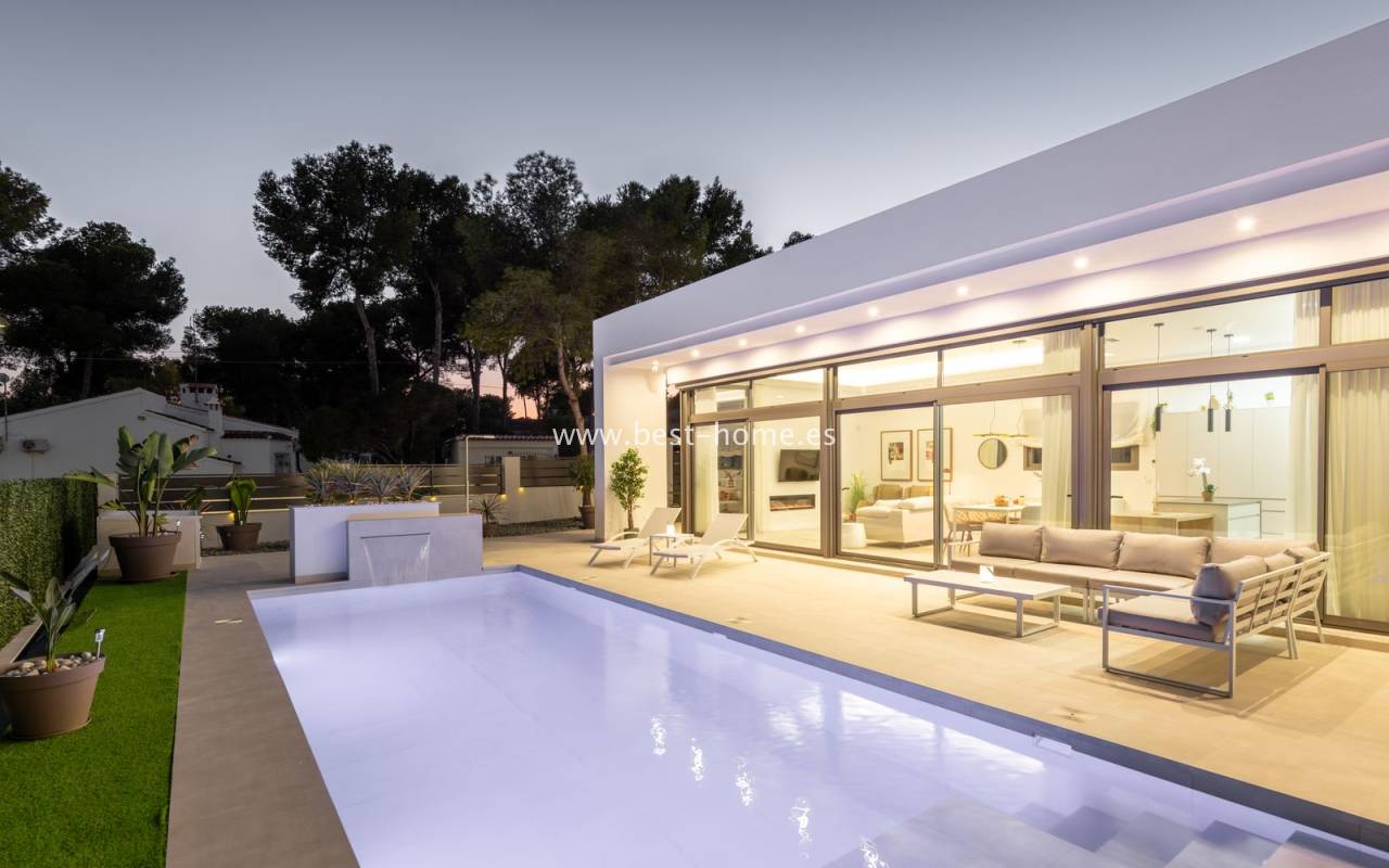 New, fantastic bungalows will be built in the very attractive, charming and green town of Pinar de Campoverde. The 140 m2 houses will consist of a large, bright and sunny living room with a dining area and a furnished kitchen with an island, a toilet, a master bedroom with a dressing room and a bathroom, two further bedrooms, a second bathroom and a laundry/utility room. From the living room, in front of large, sliding windows, there will be an exit to the terrace, private swimming pool and garden. By the pool we will find a chill-out zone and a summer kitchen. In addition, the house has a basement / garage with an area of 48 m2. The price includes kitchen furniture with household appliances, external and internal lighting, built-in wardrobes, complete bathrooms, electric blinds,