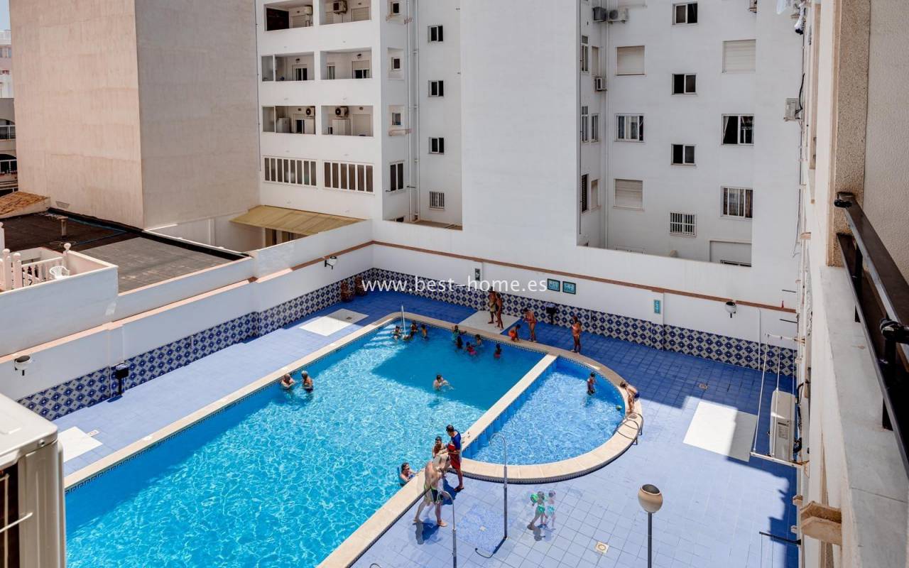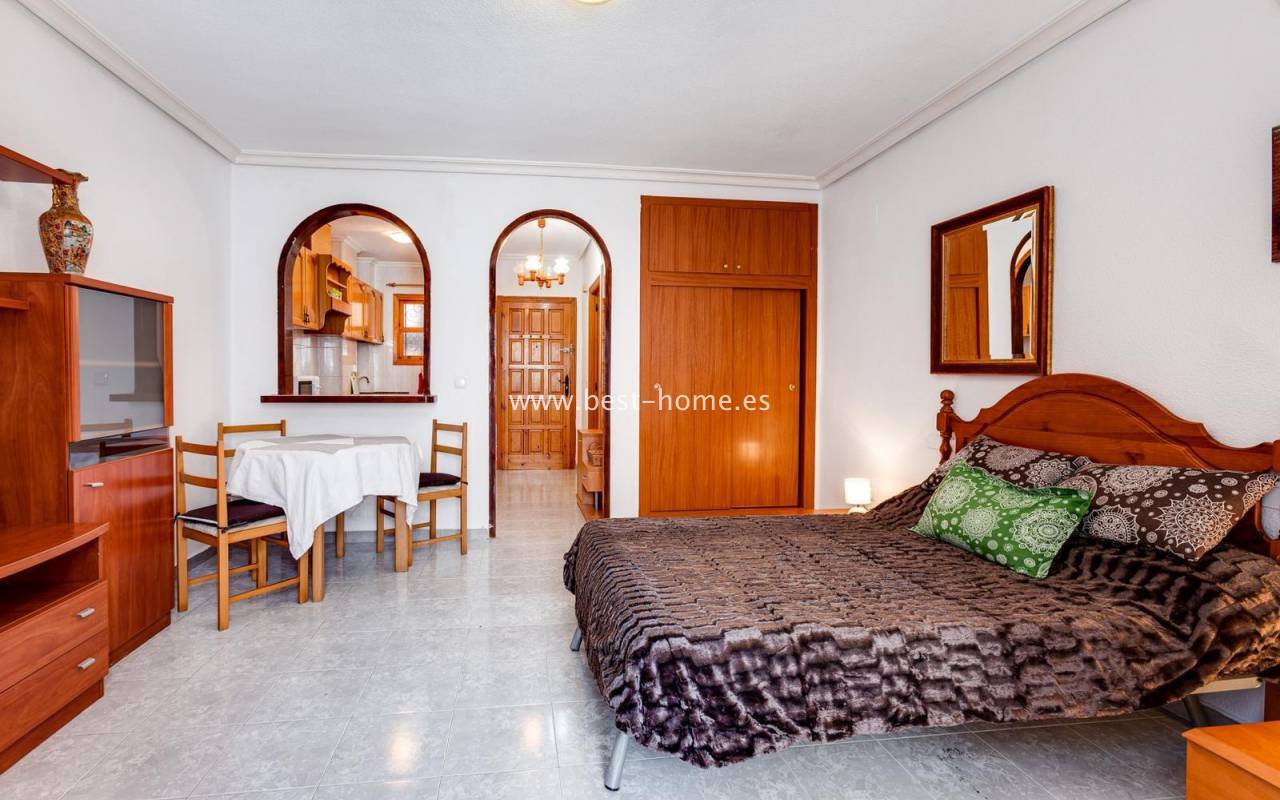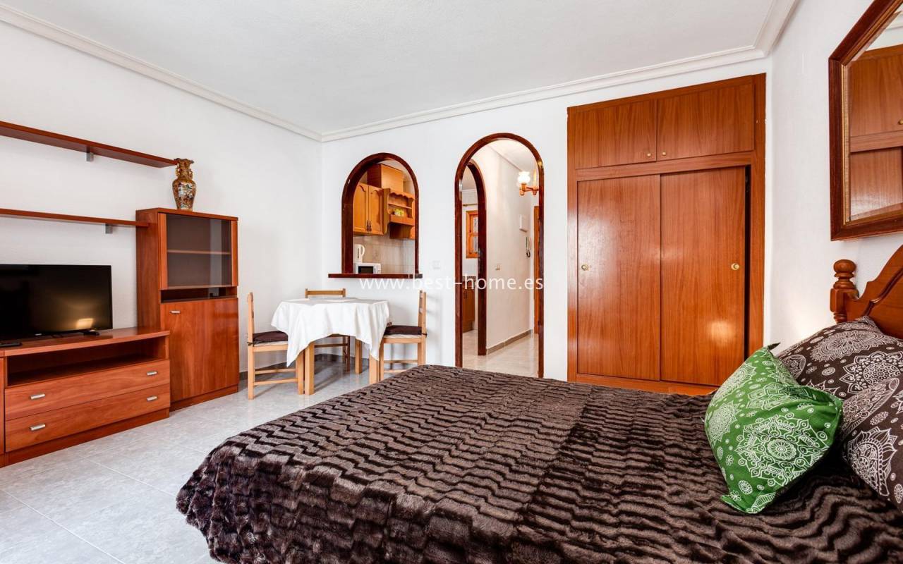 Studio with community pool close to Playa del Cura beach in Torrevieja. It has a living room with an open kitchen and access to the terrace overlooking the swimming pool, and a bathroom. Perfect apartment for holiday rental or permanent residence. Equipped with air conditioning and sold with furniture. There are many shops, pubs and restaurants nearby.