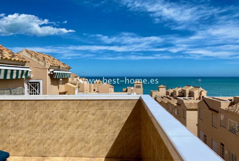 Sunny penthouse in the first line with a fantastic view of the Mediterranean Sea. After a general renovation, the property has a bright, spacious living room with access to a huge, built-in glass terrace overlooking the tennis court, swimming pool, park and sea, a French-style kitchen equipped with good quality household appliances, 2 bedrooms and a modern bathroom. The apartment is equipped with air conditioning and is sold with furniture. The property is located close to the Cabo Cervera beach in La Mata. In the vicinity we will find an affordable tennis court, swimming pool and park, restaurants, pubs and a beautiful promenade along the sea.