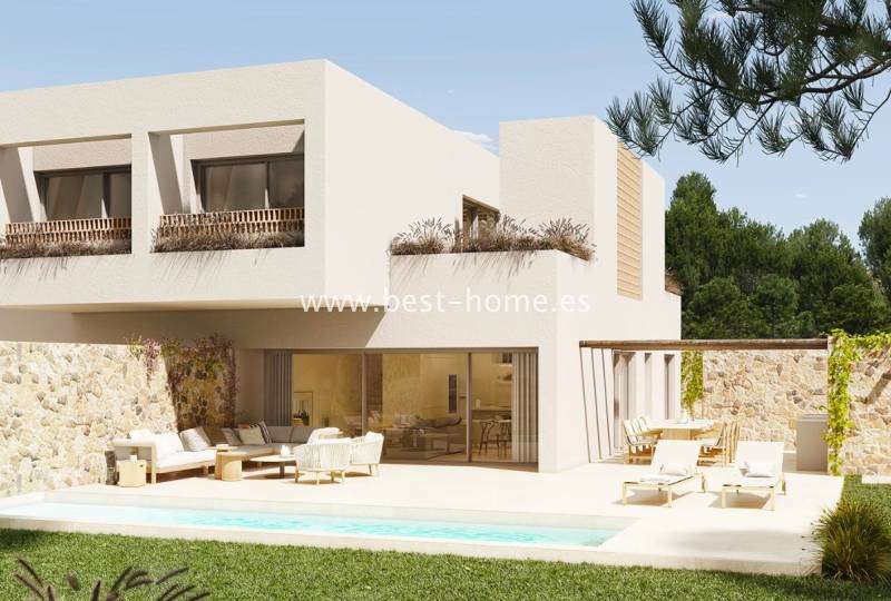 The house has an entrance hall, living room with dining room, open kitchen with utility room, three bedrooms and two bathrooms. Outside we have plenty of terraces, a parking space and a large private pool. The house has central air conditioning, underfloor heating in the bathrooms and is for sale with furniture.