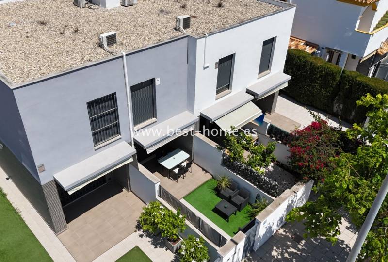 For sale apartment in a gated community with a swimming pool for residents just 400 m from the beach. The property is on the ground floor, has a front garden with direct access to the pool, a living room with an open, modern kitchen, two bedrooms, two bathrooms, a utility room and a rear terrace (near the kitchen). The property is equipped with air conditioning, for sale with furniture.