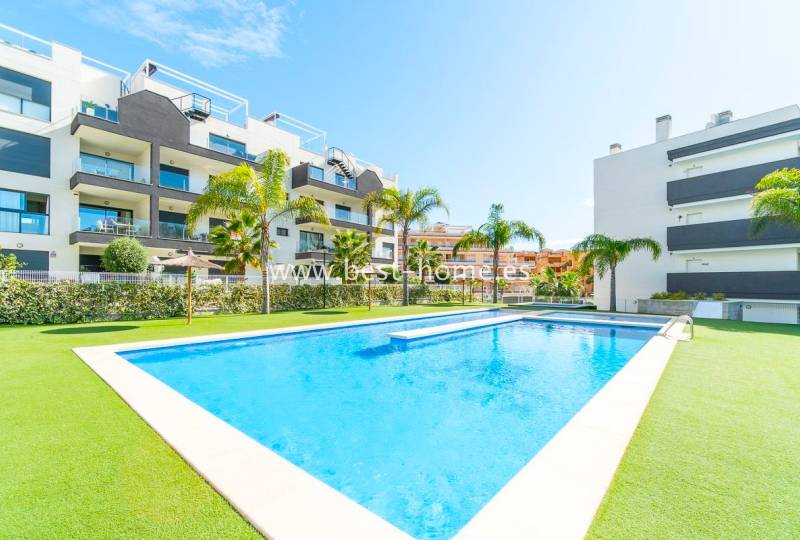 Beautiful, spacious apartment in a gated community in the Villamartin district. The property has a large terrace with south-west exposure and views of the tropical garden and swimming pool, inside we find a living room with dining room, kitchen with utility room, two bedrooms and two bathrooms. The apartment has beautiful marble floors and is equipped with air conditioning. The price includes a parking space in the underground garage and a storage room. The apartment is sold partially furnished.