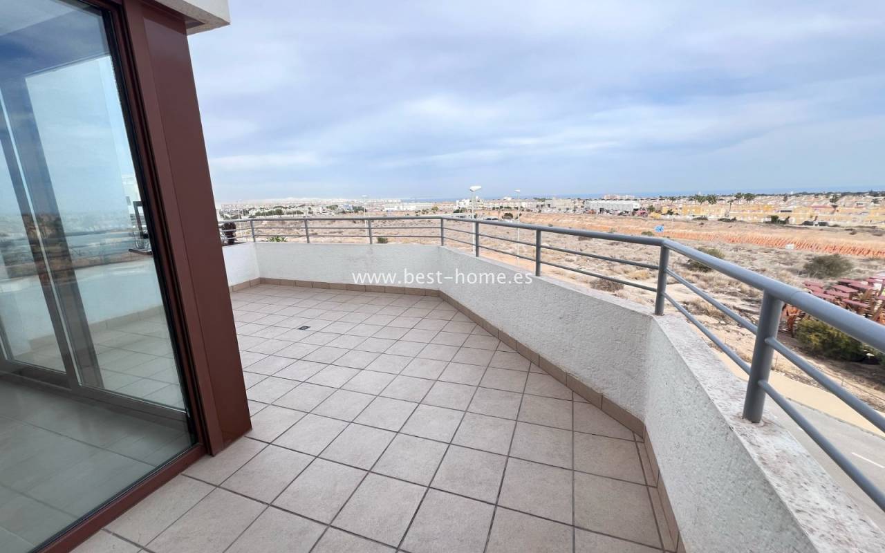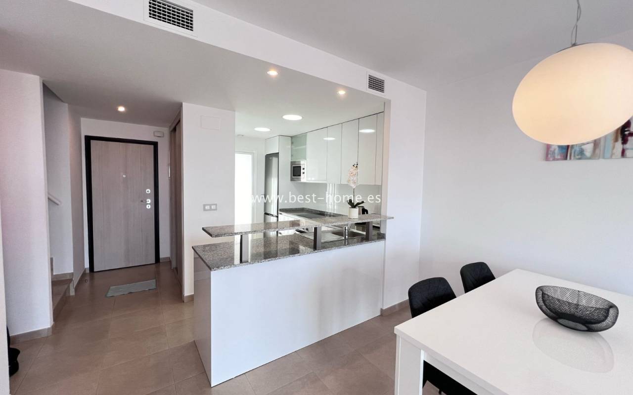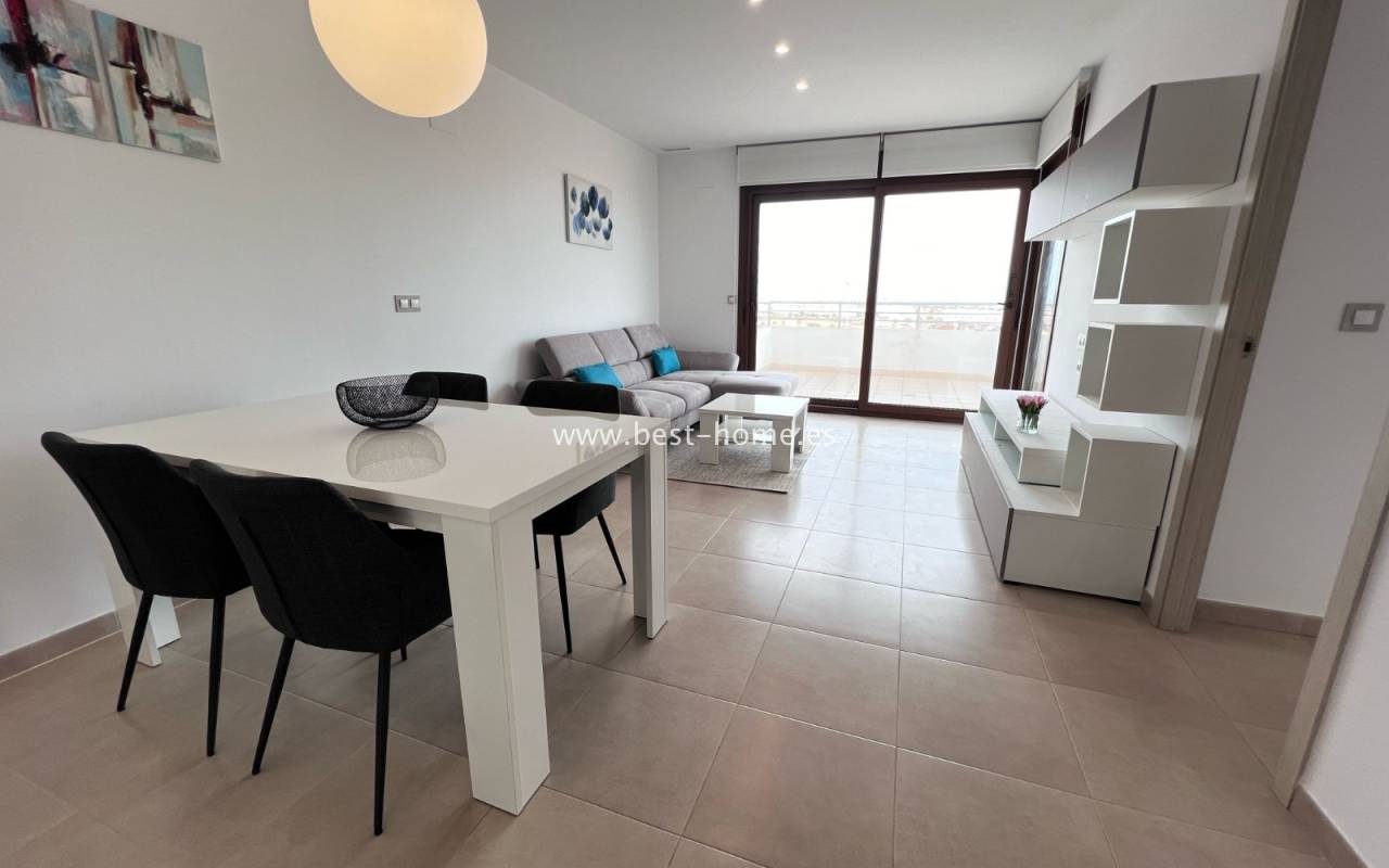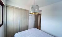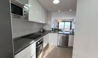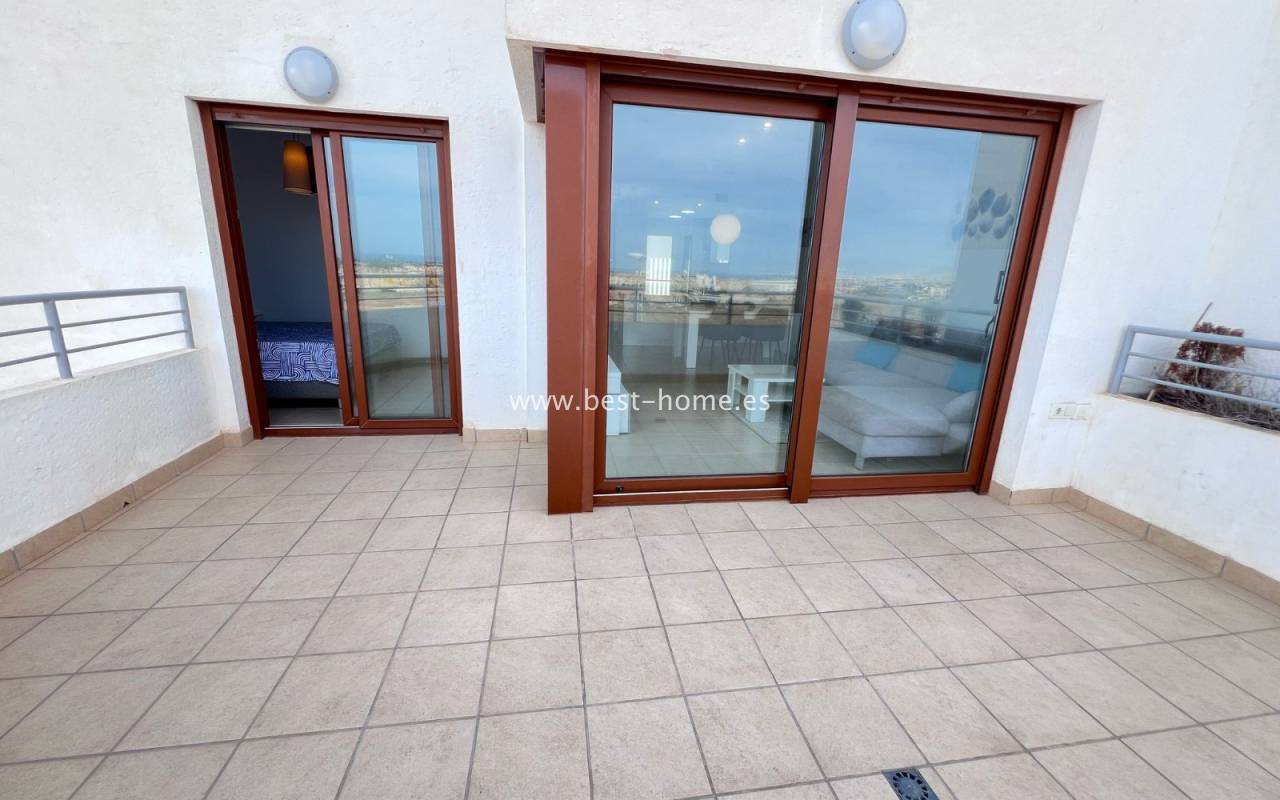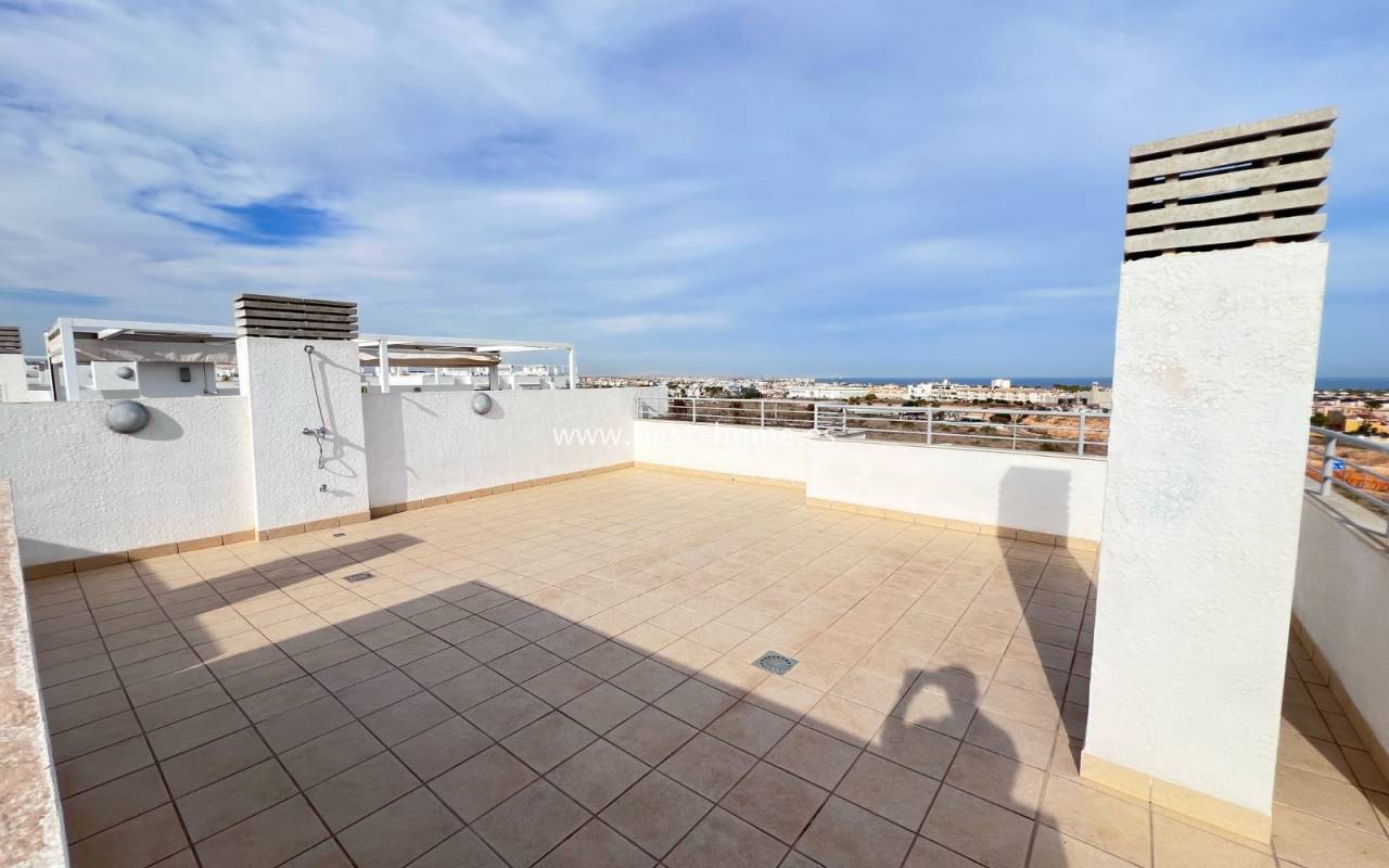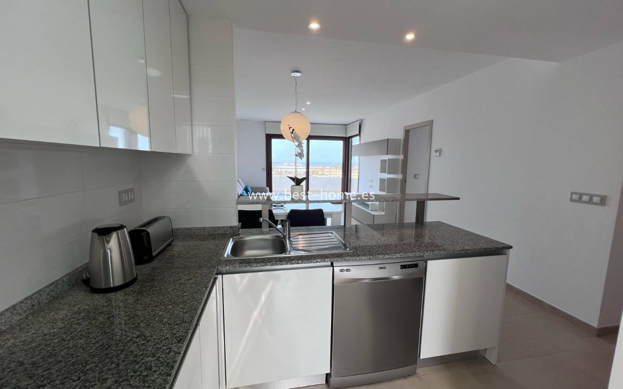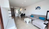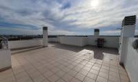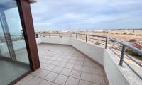 Corner penthouse in a gated community with two swimming pools and well-kept gardens for residents. The property has a living room with open kitchen and access to a large terrace overlooking the sea, three bedrooms with fitted wardrobes, two bathrooms and a large private solarium with beautiful sea views. The property has air conditioning, a parking space in the garage and is for sale furnished.