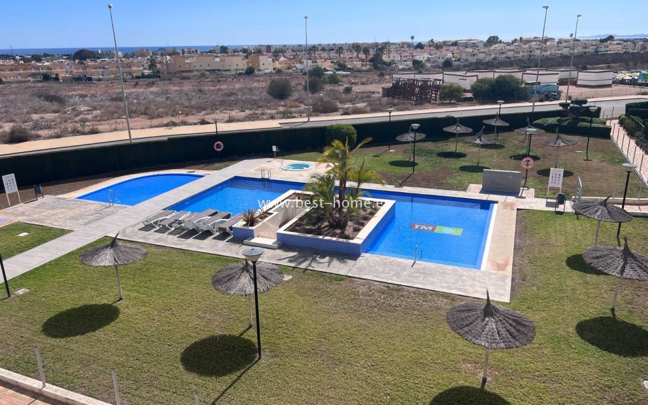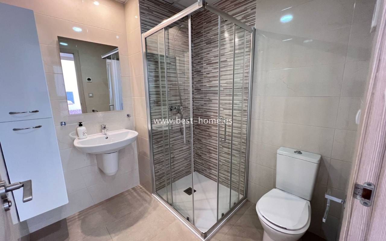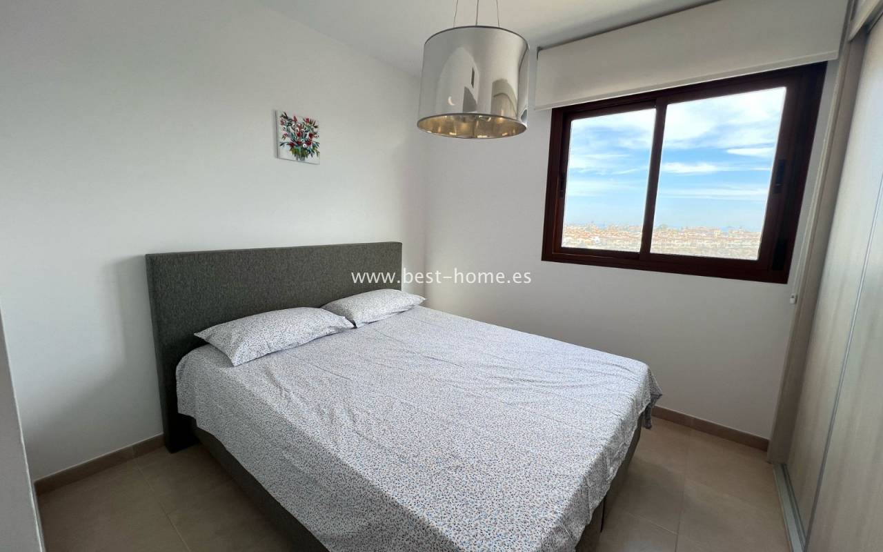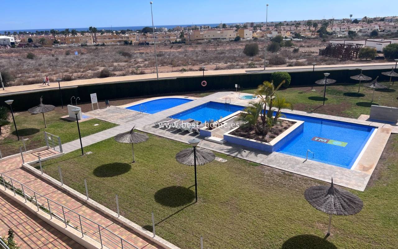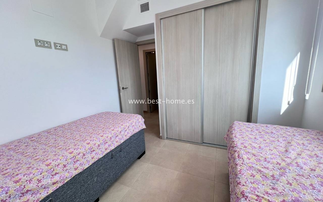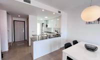 Corner penthouse in a gated community with two swimming pools and well-kept gardens for residents. The property has a living room with open kitchen and access to a large terrace overlooking the sea, three bedrooms with fitted wardrobes, two bathrooms and a large private solarium with beautiful sea views. The property has air conditioning, a parking space in the garage and is for sale furnished.
