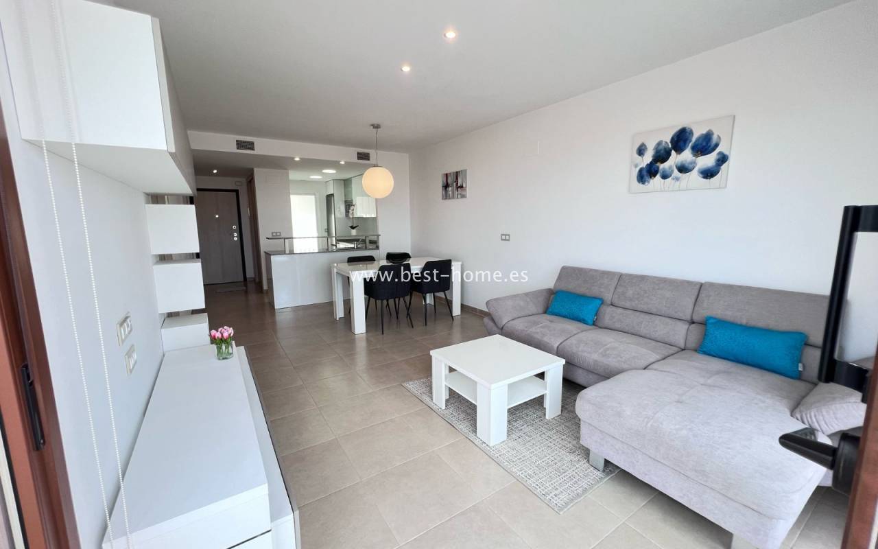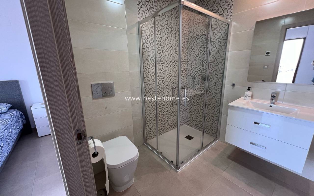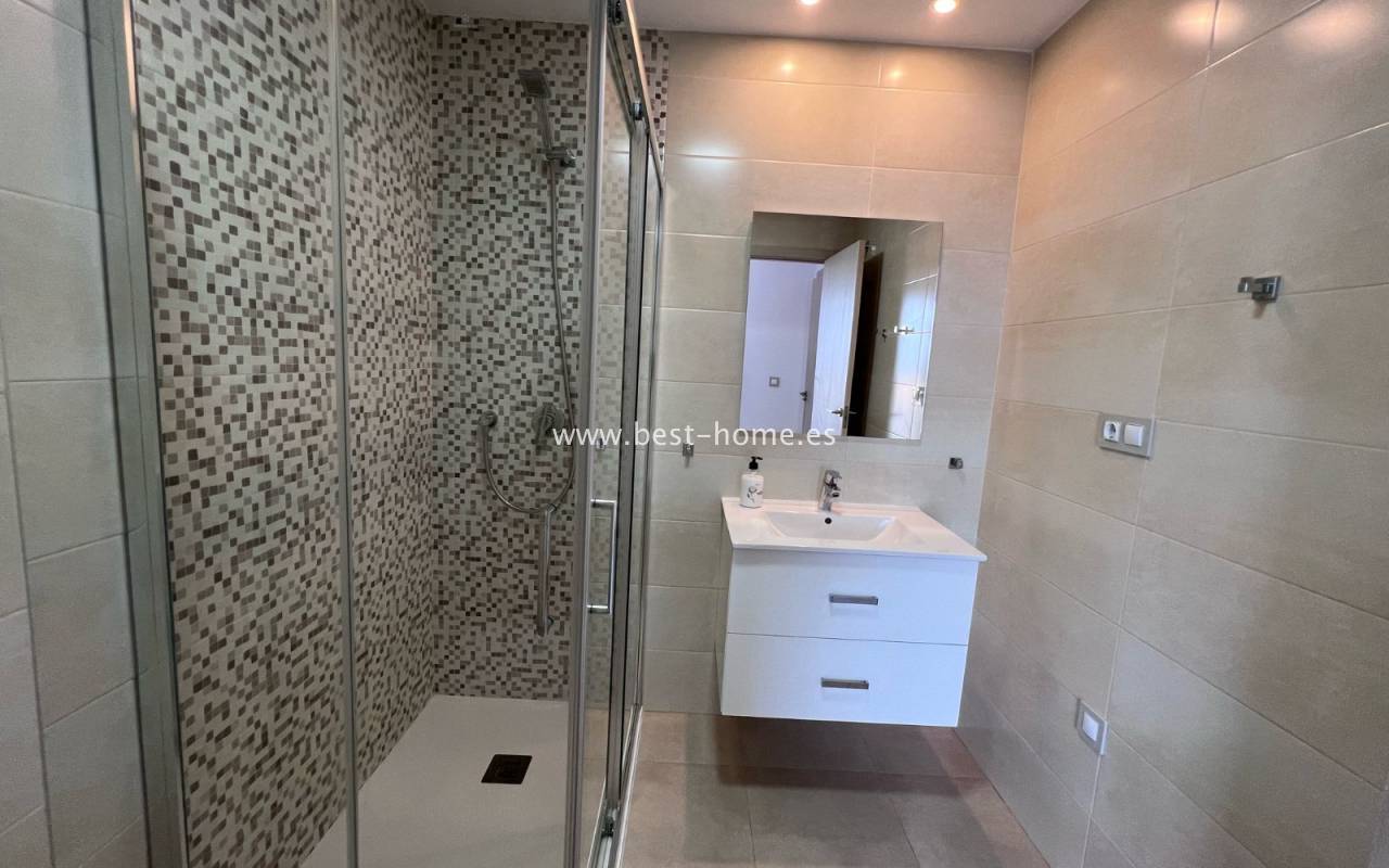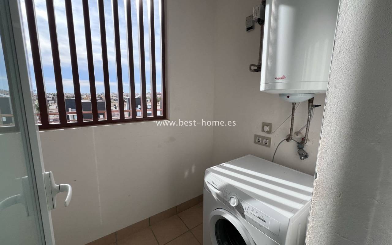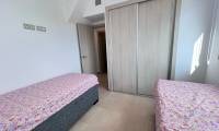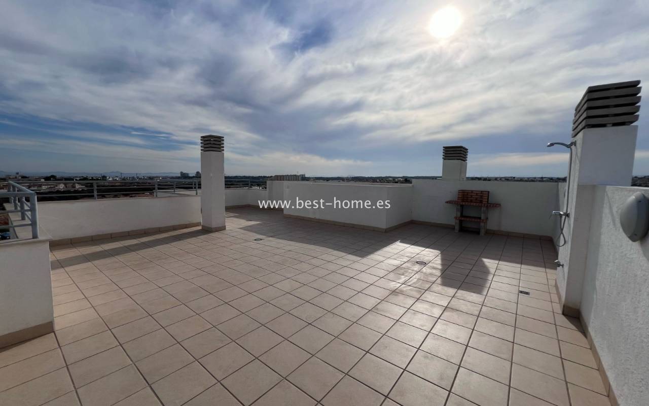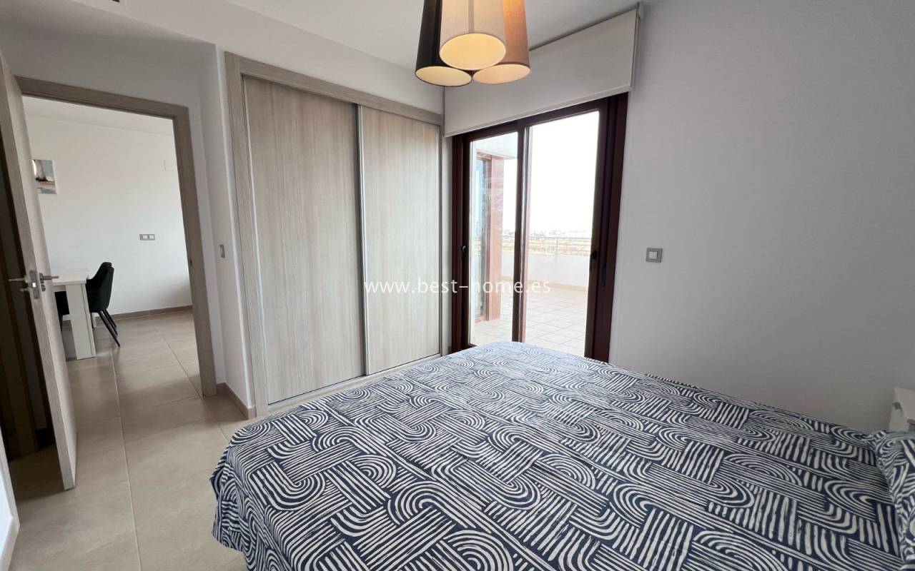 Corner penthouse in a gated community with two swimming pools and well-kept gardens for residents. The property has a living room with open kitchen and access to a large terrace overlooking the sea, three bedrooms with fitted wardrobes, two bathrooms and a large private solarium with beautiful sea views. The property has air conditioning, a parking space in the garage and is for sale furnished.