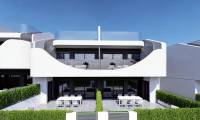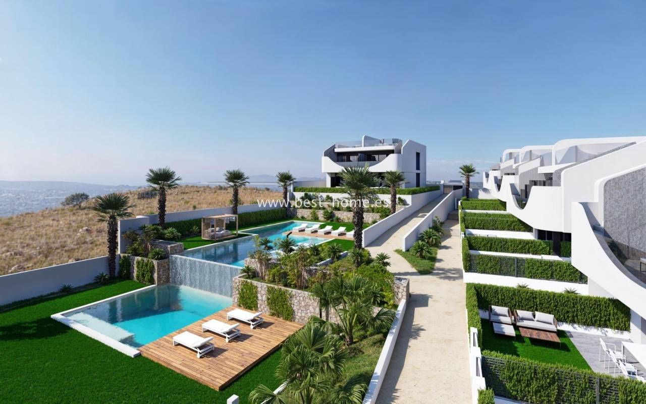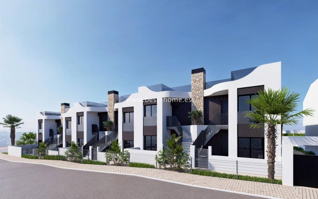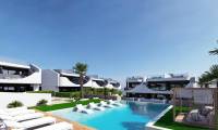 An attractive and intimate estate consisting of 34 bungalows is being built on the outskirts of the Spanish town of San Miguel de Salinas. There are properties available on the ground floor with 2 bedrooms, 2 bathrooms, a furnished kitchen with an island, connected to the dining room and living room. From the master bedroom and living room there will be an exit to the terrace (21 m2) to the garden (21 m2), from which we will get to the common areas and the swimming pool. In front of the entrance to the apartment there is a rear terrace (15 m2).