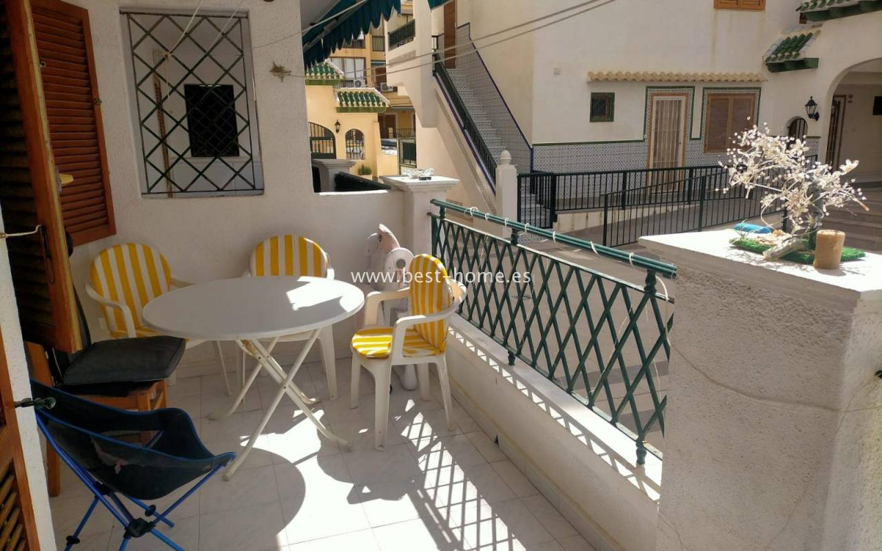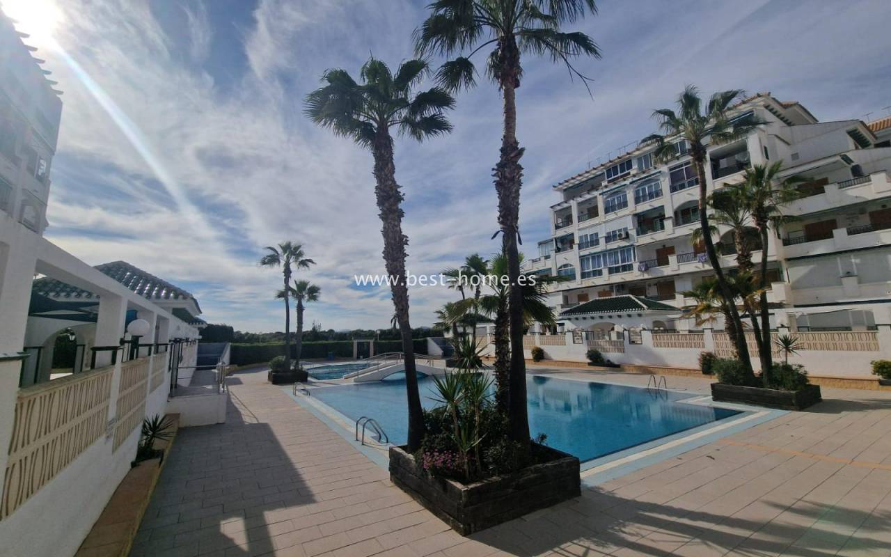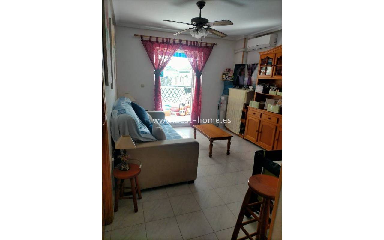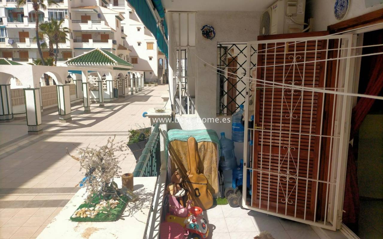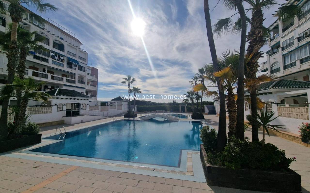 For sale: ground floor apartment in La Mata, near Torrevieja. The property consists of one bedroom, a living room with an open kitchen, and a bathroom. The bedroom has direct access to the pool area.