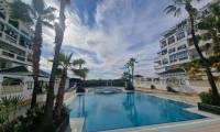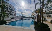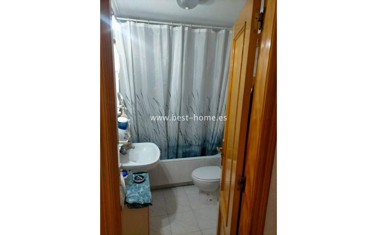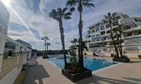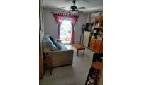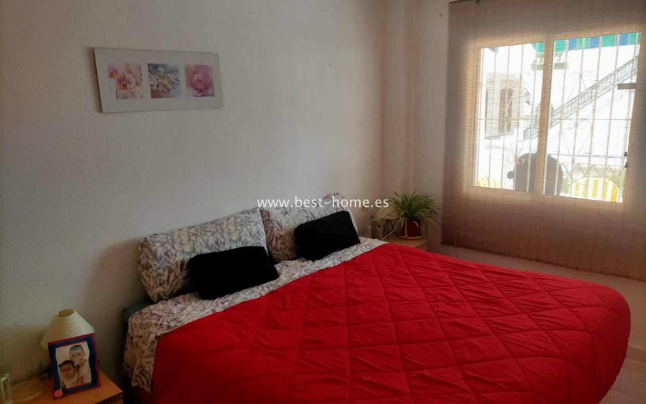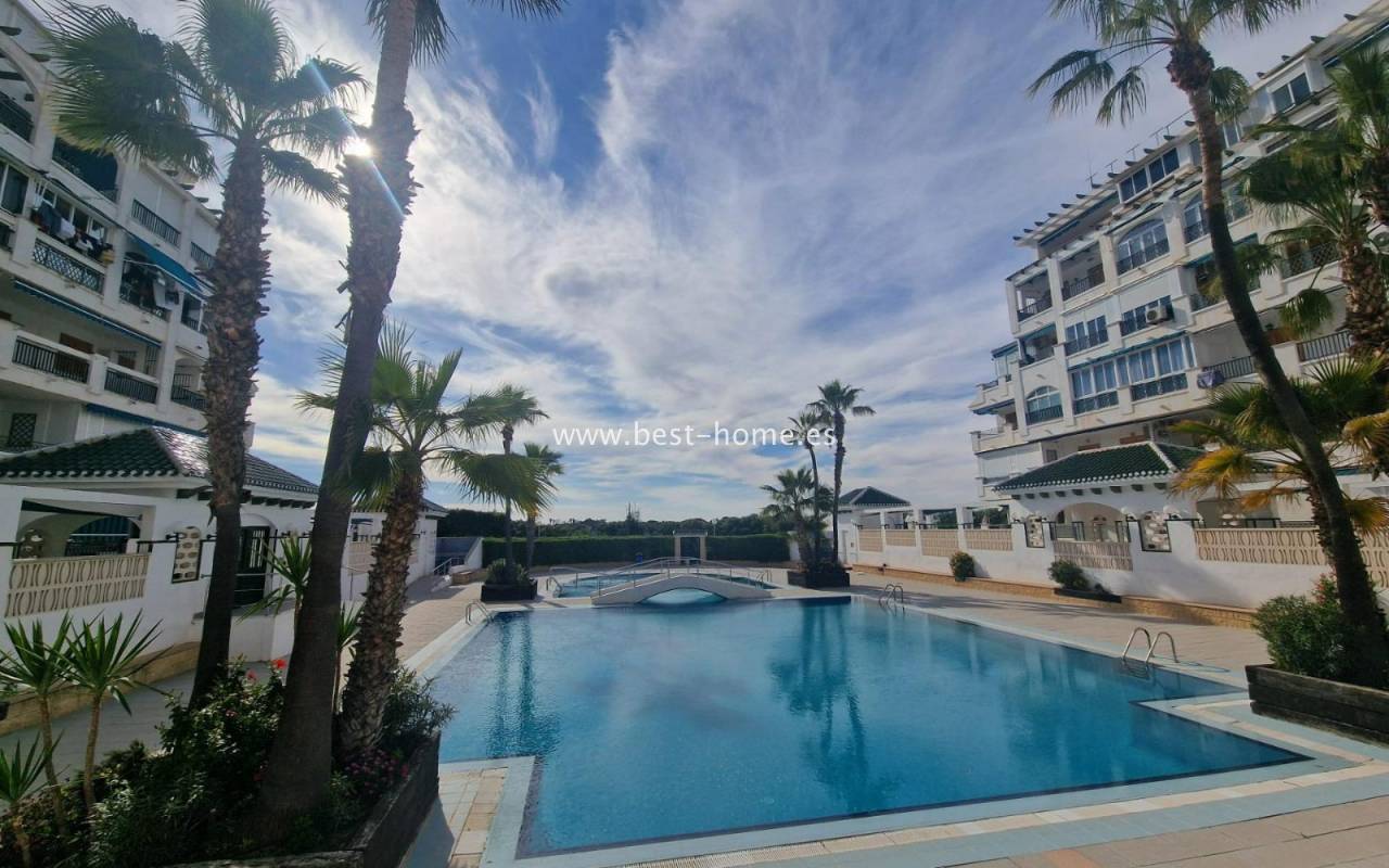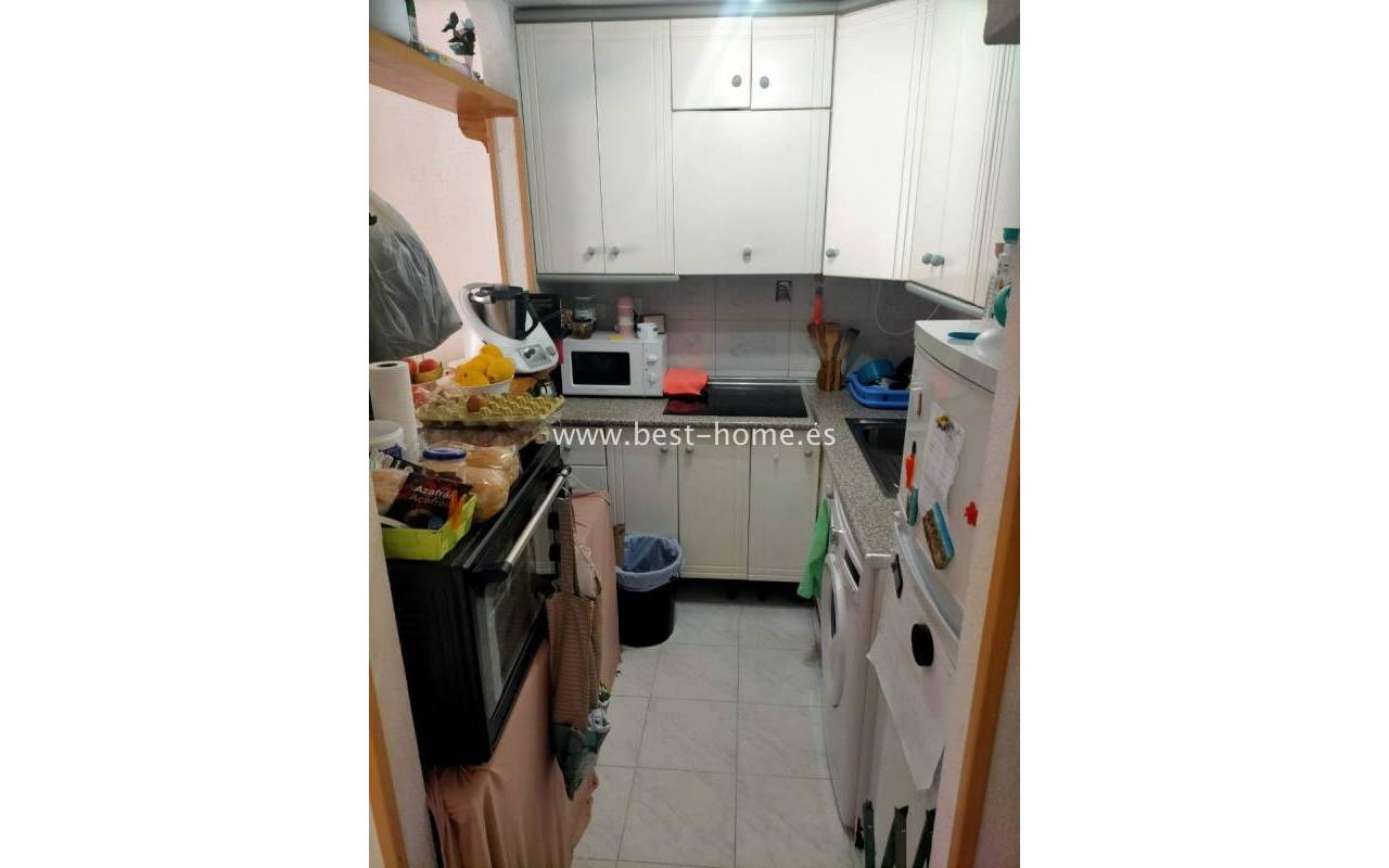 For sale: ground floor apartment in La Mata, near Torrevieja. The property consists of one bedroom, a living room with an open kitchen, and a bathroom. The bedroom has direct access to the pool area.