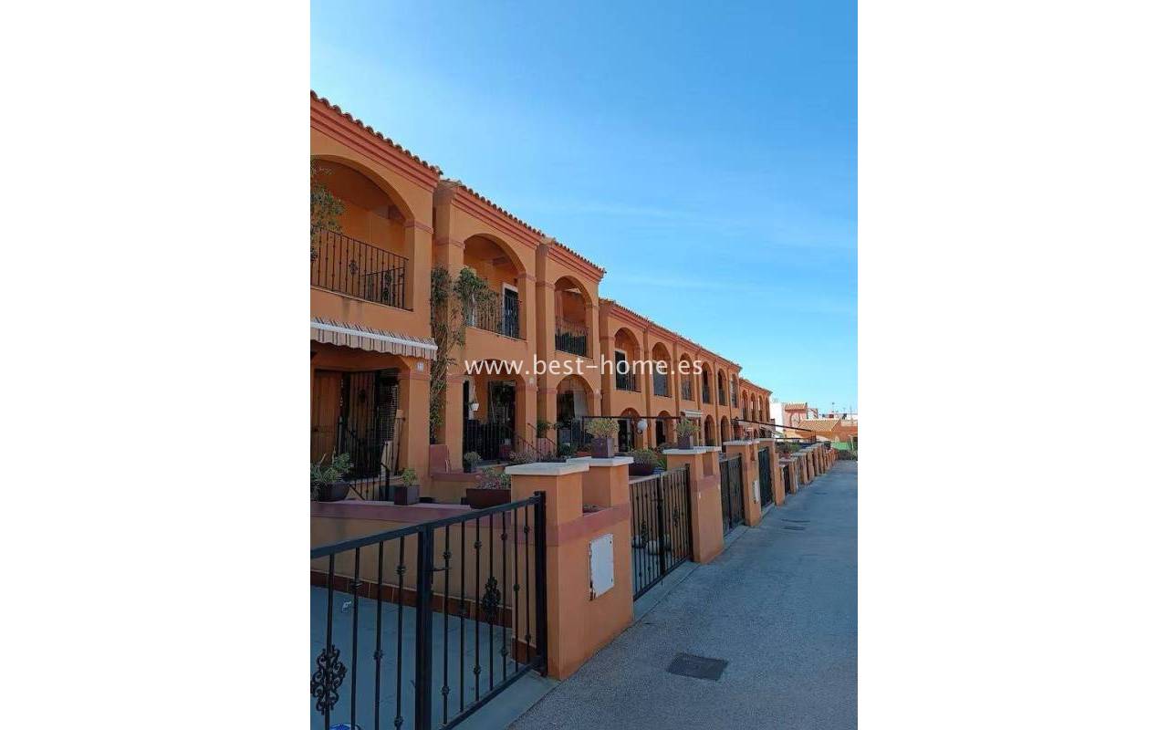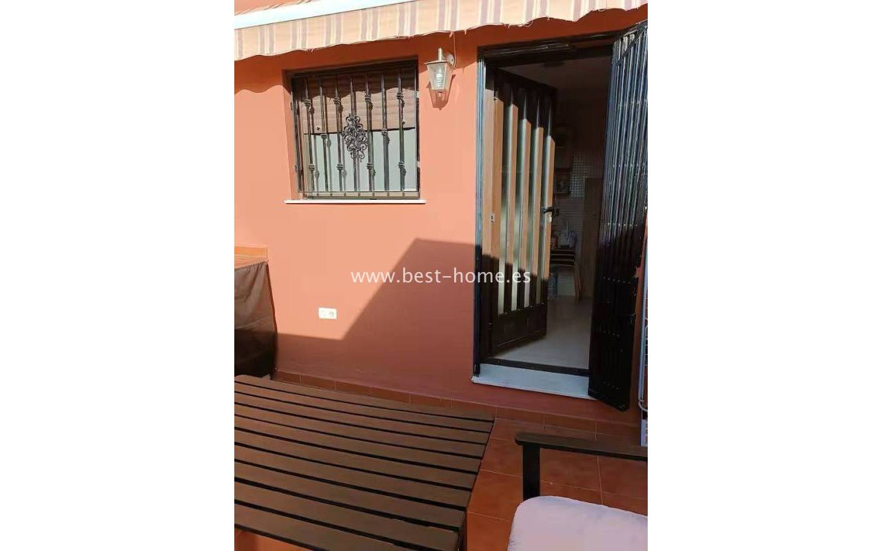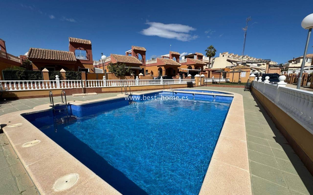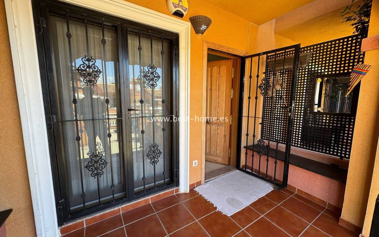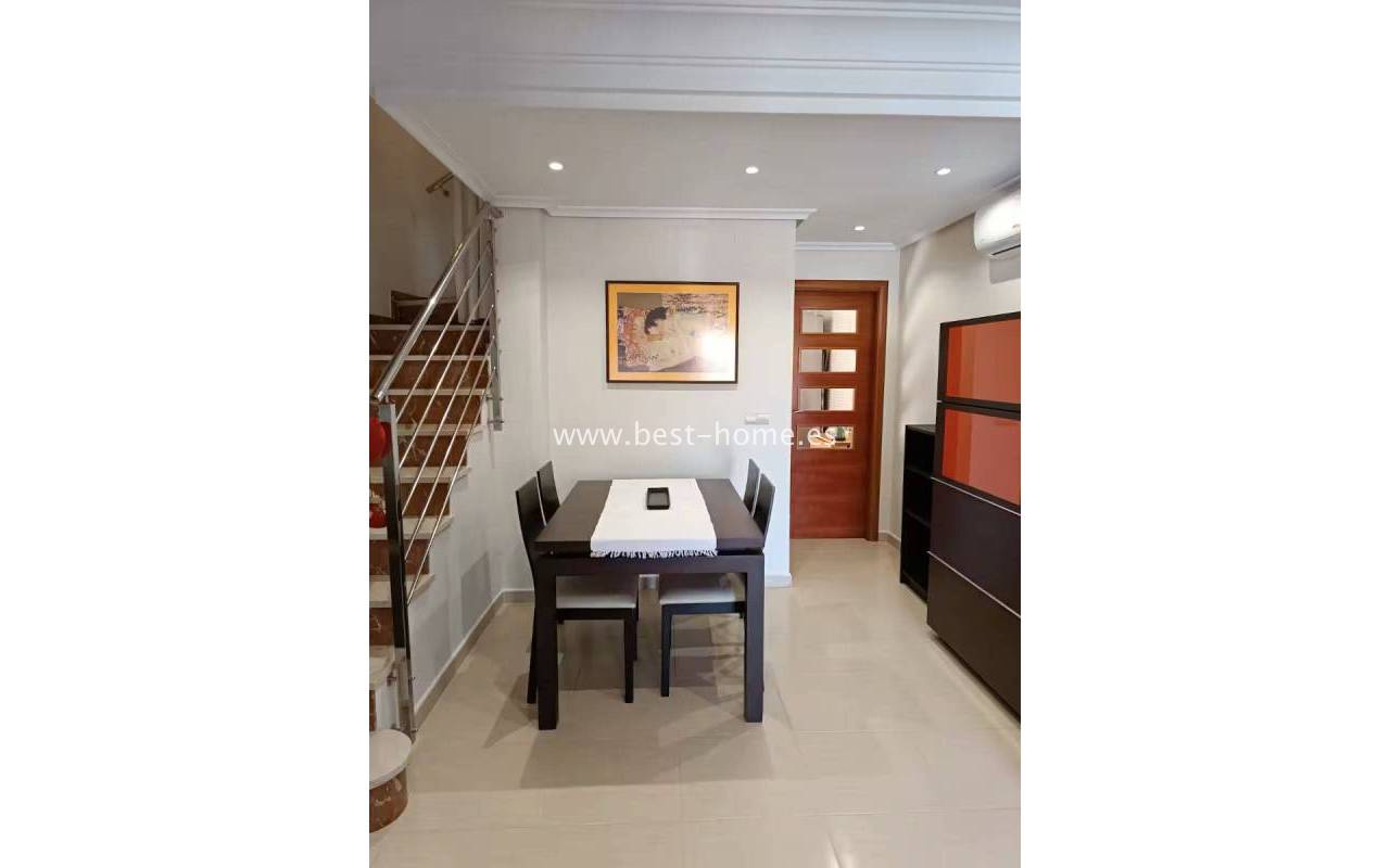 Terraced semi-detached house with private garden, solarium, fireplace and community pool in the quiet area of Aguas Nuevas in Torrevieja. Through the garden we enter the property, where we will find a living room with fireplace, separate kitchen equipped with household appliances and pantry. On the first floor we will find 2 bedrooms, bathroom and toilet. The apartment is equipped with air conditioning and is sold with furniture. On the estate there is a swimming pool intended for residents. The price of the property includes a parking space on the property. The property is full of peace and quiet, ideal for permanent residence.