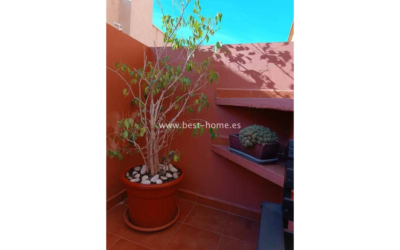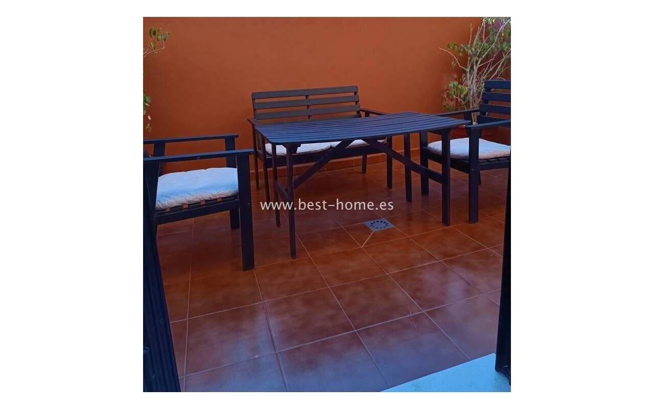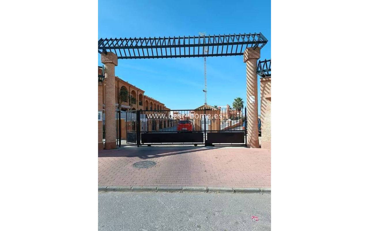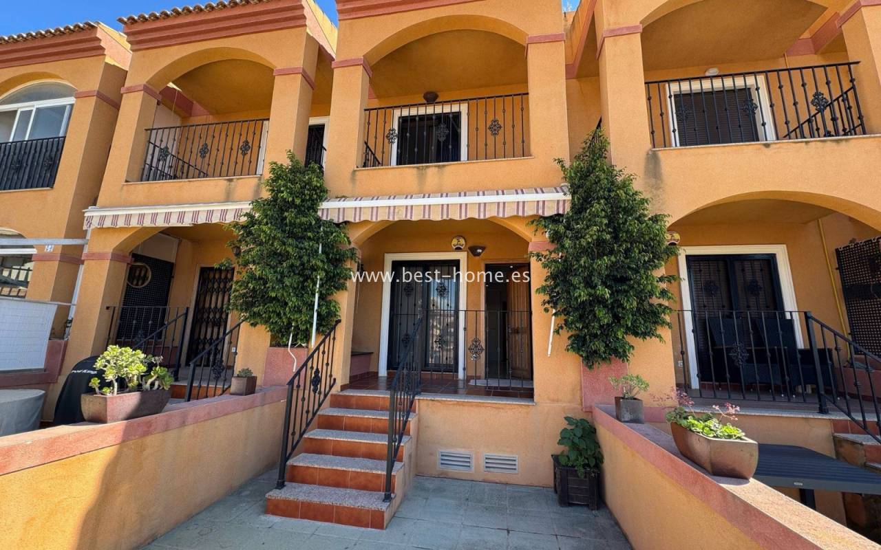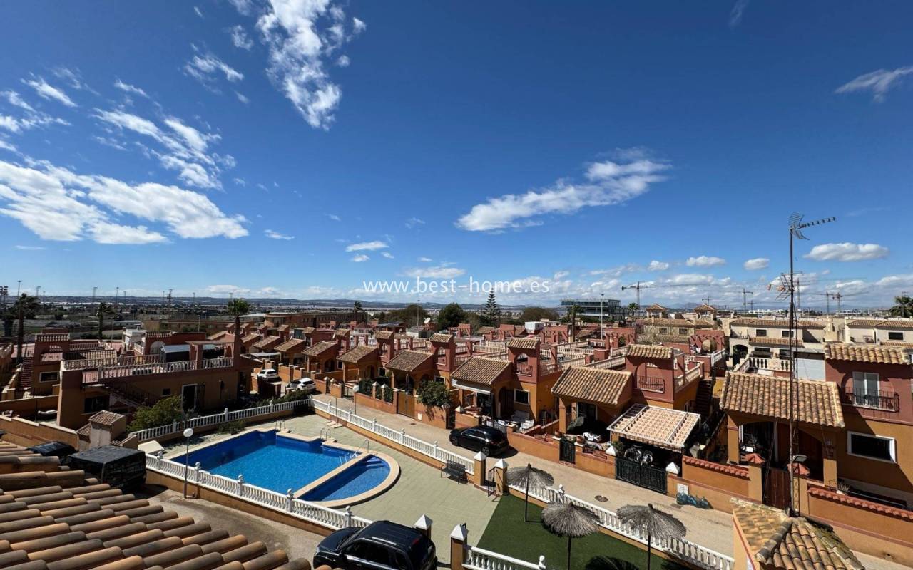 Terraced semi-detached house with private garden, solarium, fireplace and community pool in the quiet area of Aguas Nuevas in Torrevieja. Through the garden we enter the property, where we will find a living room with fireplace, separate kitchen equipped with household appliances and pantry. On the first floor we will find 2 bedrooms, bathroom and toilet. The apartment is equipped with air conditioning and is sold with furniture. On the estate there is a swimming pool intended for residents. The price of the property includes a parking space on the property. The property is full of peace and quiet, ideal for permanent residence.