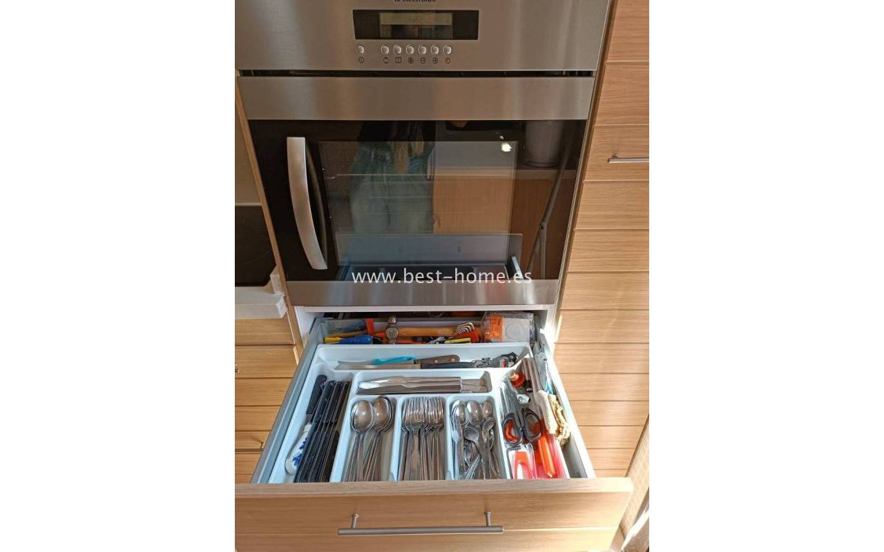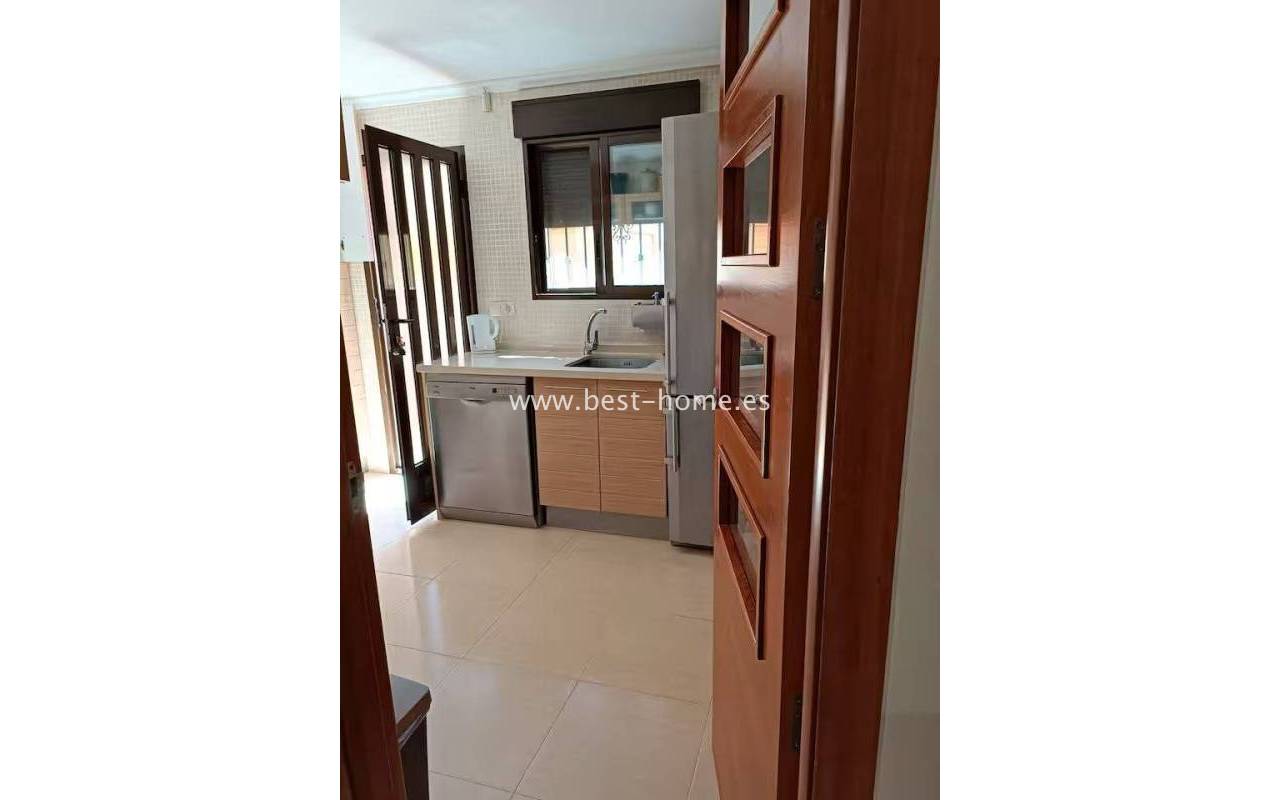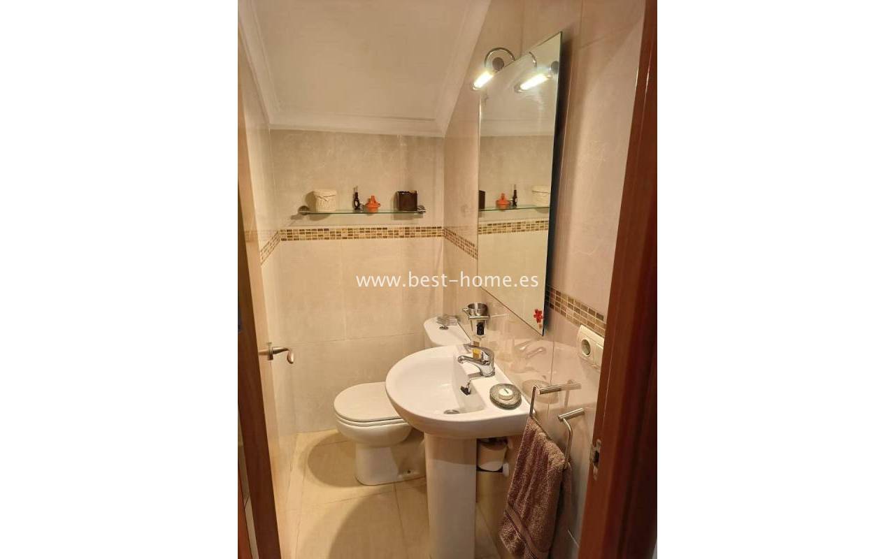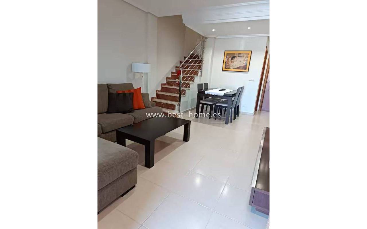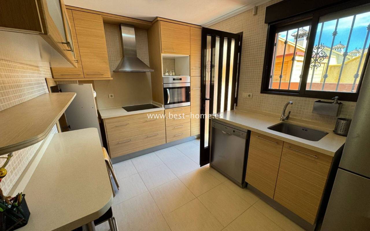 Terraced semi-detached house with private garden, solarium, fireplace and community pool in the quiet area of Aguas Nuevas in Torrevieja. Through the garden we enter the property, where we will find a living room with fireplace, separate kitchen equipped with household appliances and pantry. On the first floor we will find 2 bedrooms, bathroom and toilet. The apartment is equipped with air conditioning and is sold with furniture. On the estate there is a swimming pool intended for residents. The price of the property includes a parking space on the property. The property is full of peace and quiet, ideal for permanent residence.