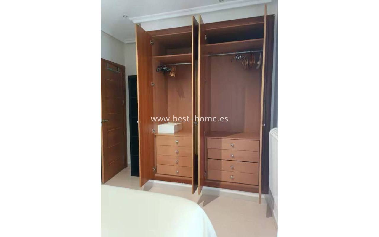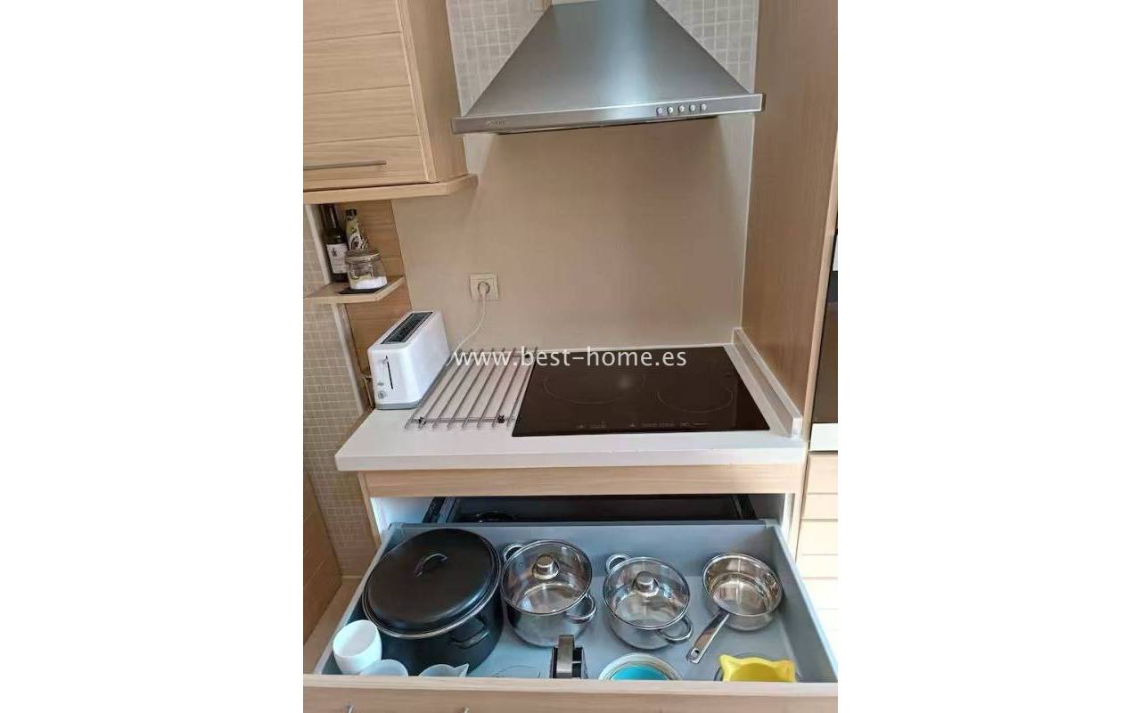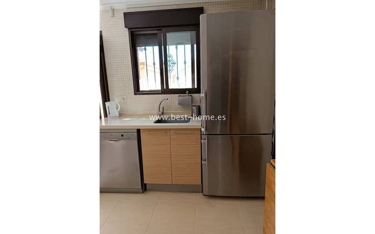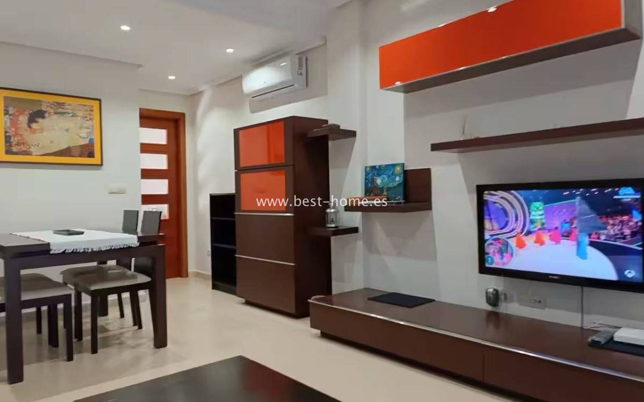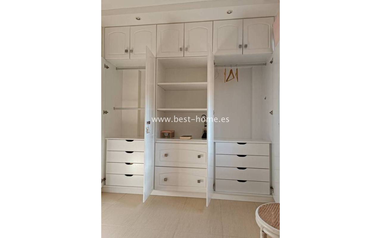 Terraced semi-detached house with private garden, solarium, fireplace and community pool in the quiet area of Aguas Nuevas in Torrevieja. Through the garden we enter the property, where we will find a living room with fireplace, separate kitchen equipped with household appliances and pantry. On the first floor we will find 2 bedrooms, bathroom and toilet. The apartment is equipped with air conditioning and is sold with furniture. On the estate there is a swimming pool intended for residents. The price of the property includes a parking space on the property. The property is full of peace and quiet, ideal for permanent residence.