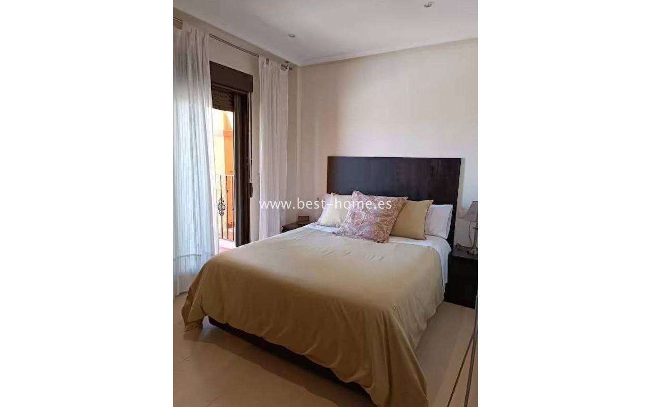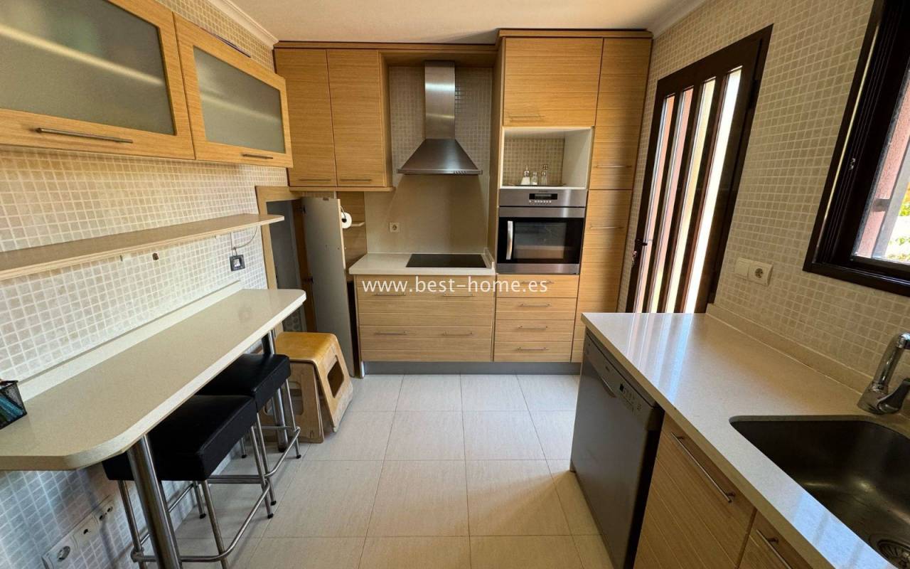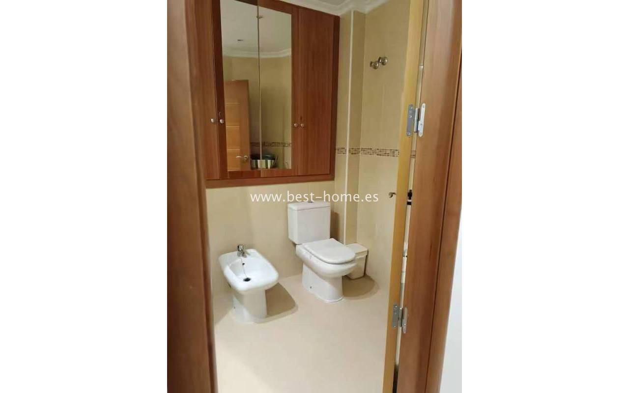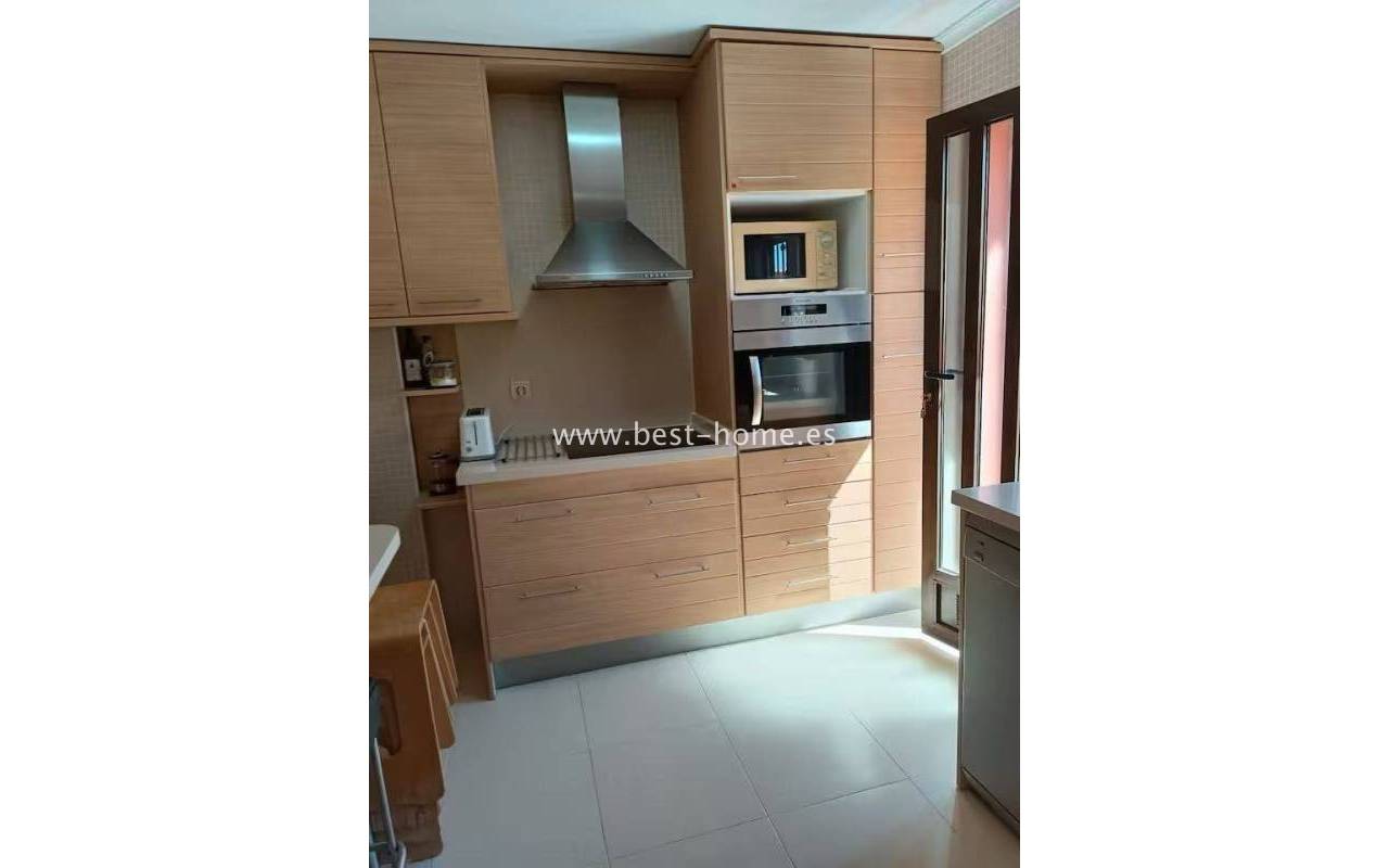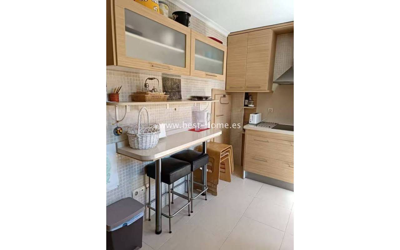 Terraced semi-detached house with private garden, solarium, fireplace and community pool in the quiet area of Aguas Nuevas in Torrevieja. Through the garden we enter the property, where we will find a living room with fireplace, separate kitchen equipped with household appliances and pantry. On the first floor we will find 2 bedrooms, bathroom and toilet. The apartment is equipped with air conditioning and is sold with furniture. On the estate there is a swimming pool intended for residents. The price of the property includes a parking space on the property. The property is full of peace and quiet, ideal for permanent residence.