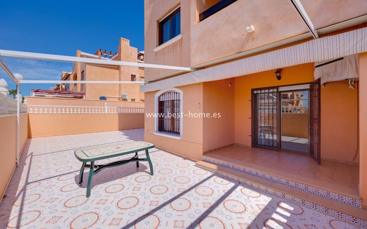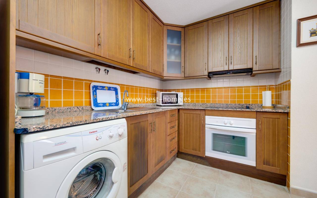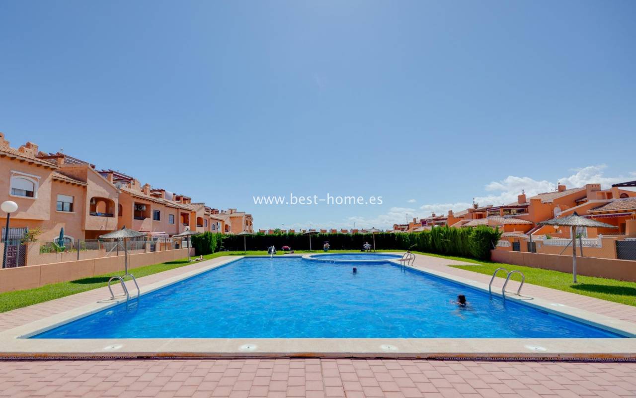 A ground floor bungalow in a Mediterranean style with a private garden of 125 m2, a community pool and a parking space. It has a living room with access to the garden, an open kitchen to the living room equipped with household appliances and an exit to the laundry and utility room, 2 double bedrooms with built-in wardrobes, a bathroom. The apartment is furnished and equipped with air conditioning. The price of the property includes a parking space in a gated community. Additionally, the community has a swimming pool for residents.