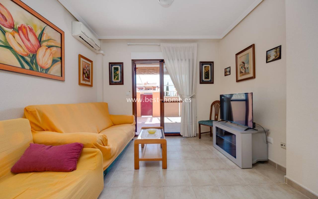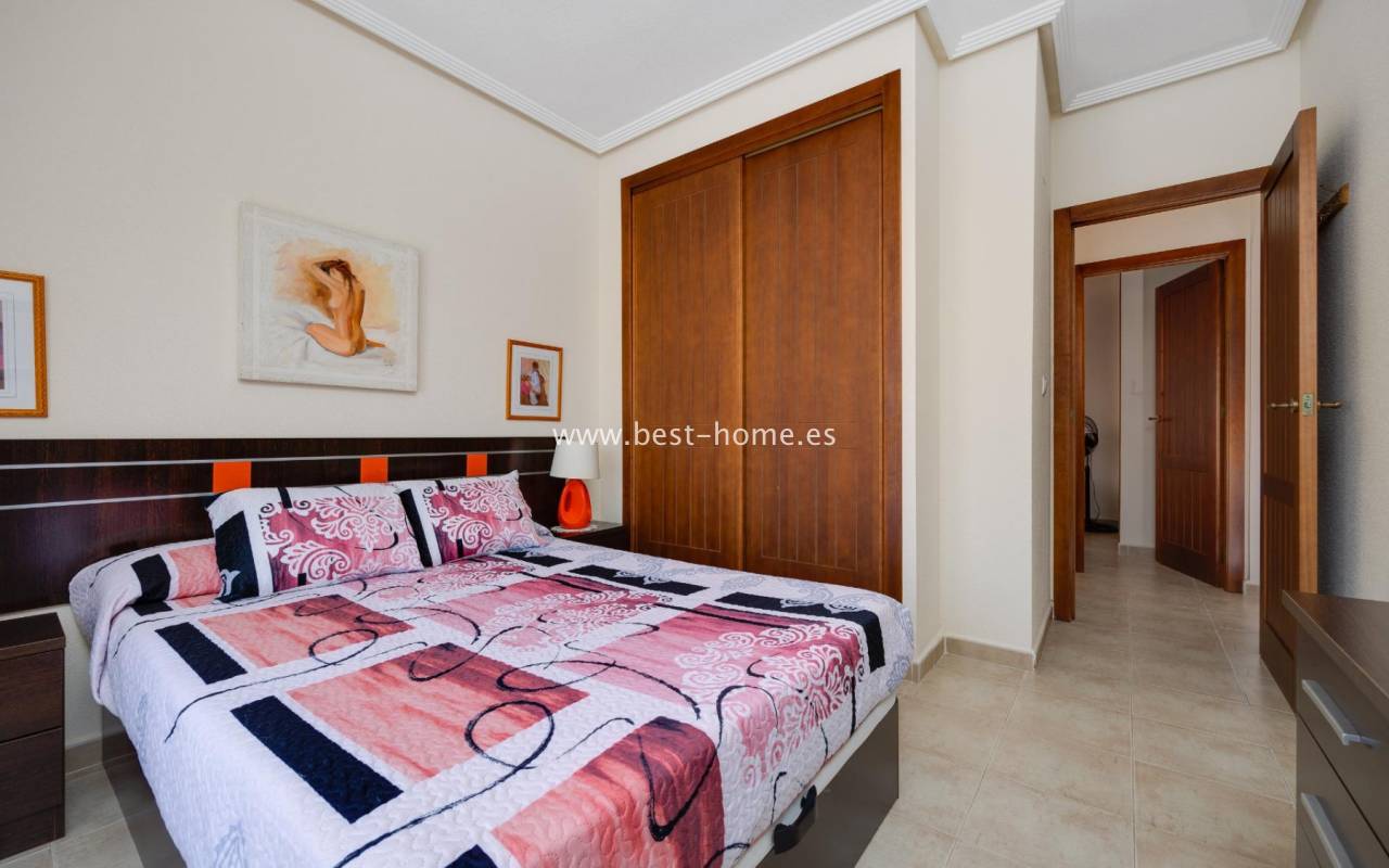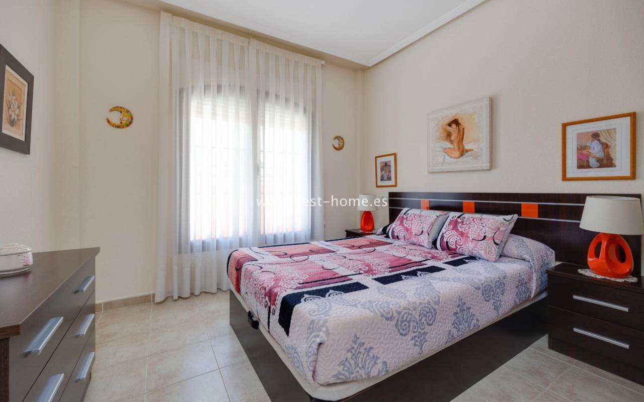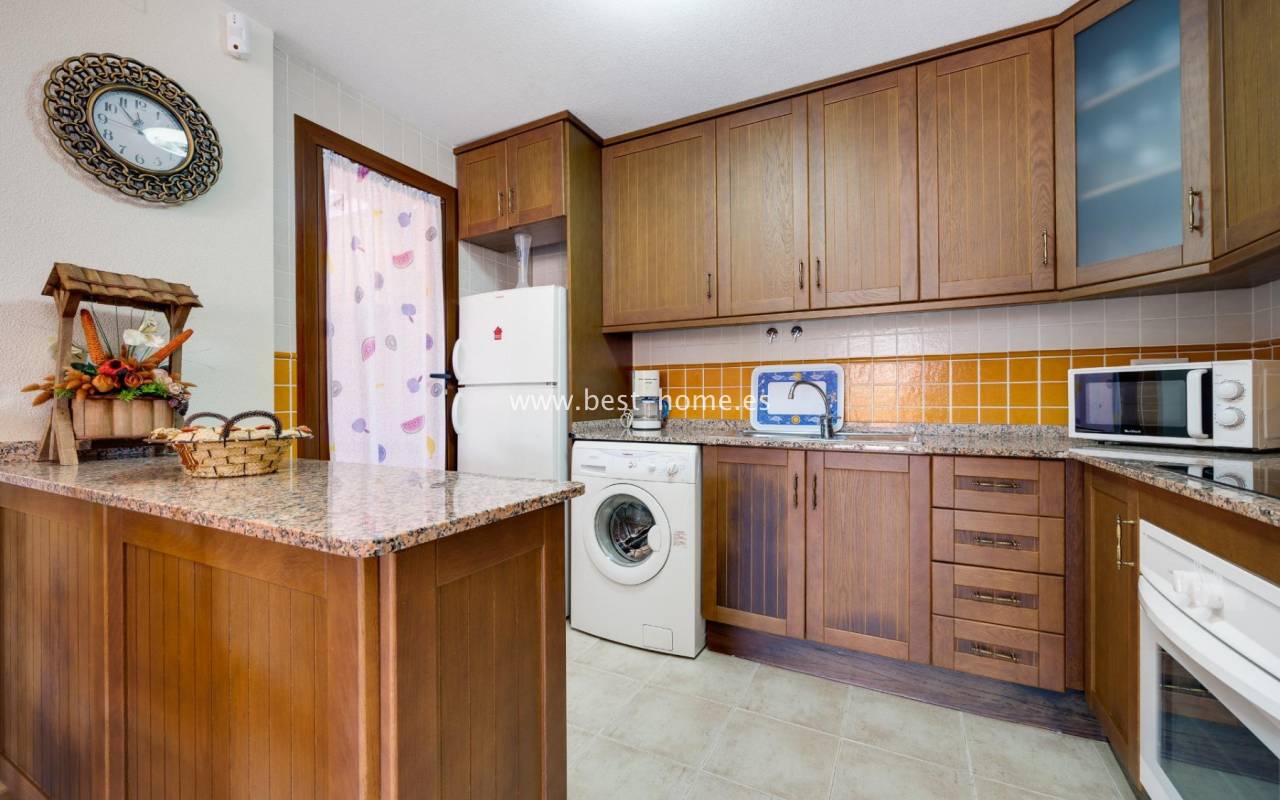 A ground floor bungalow in a Mediterranean style with a private garden of 125 m2, a community pool and a parking space. It has a living room with access to the garden, an open kitchen to the living room equipped with household appliances and an exit to the laundry and utility room, 2 double bedrooms with built-in wardrobes, a bathroom. The apartment is furnished and equipped with air conditioning. The price of the property includes a parking space in a gated community. Additionally, the community has a swimming pool for residents.