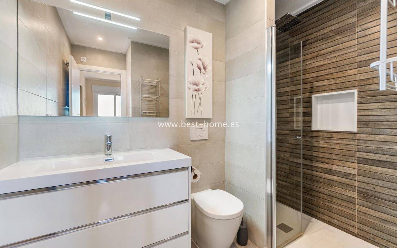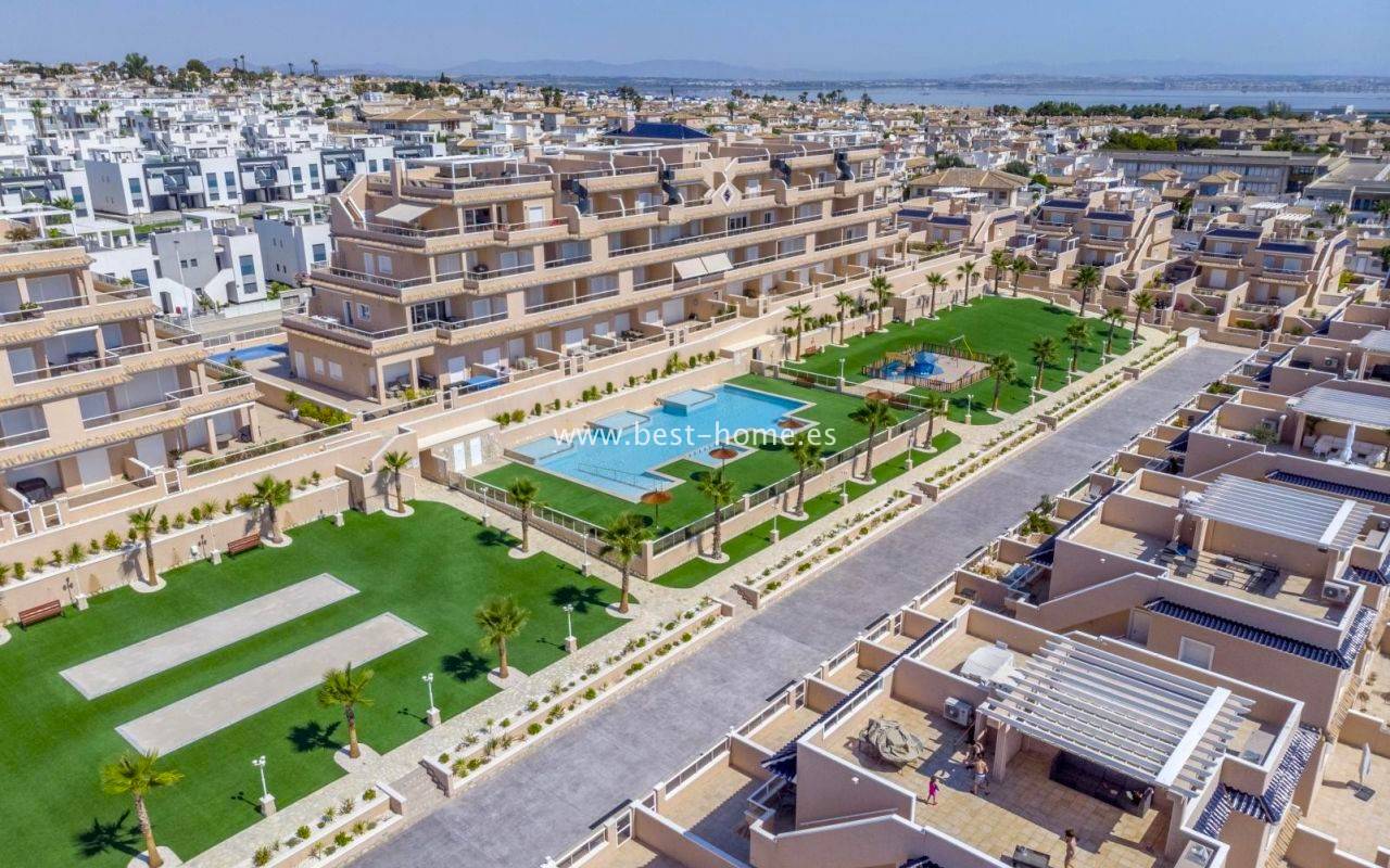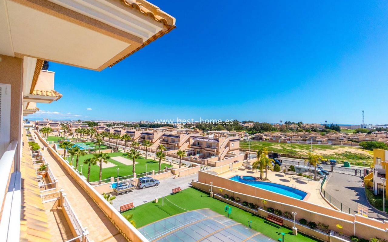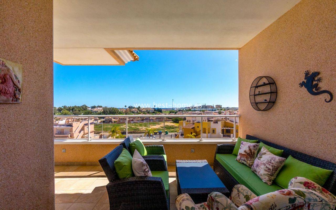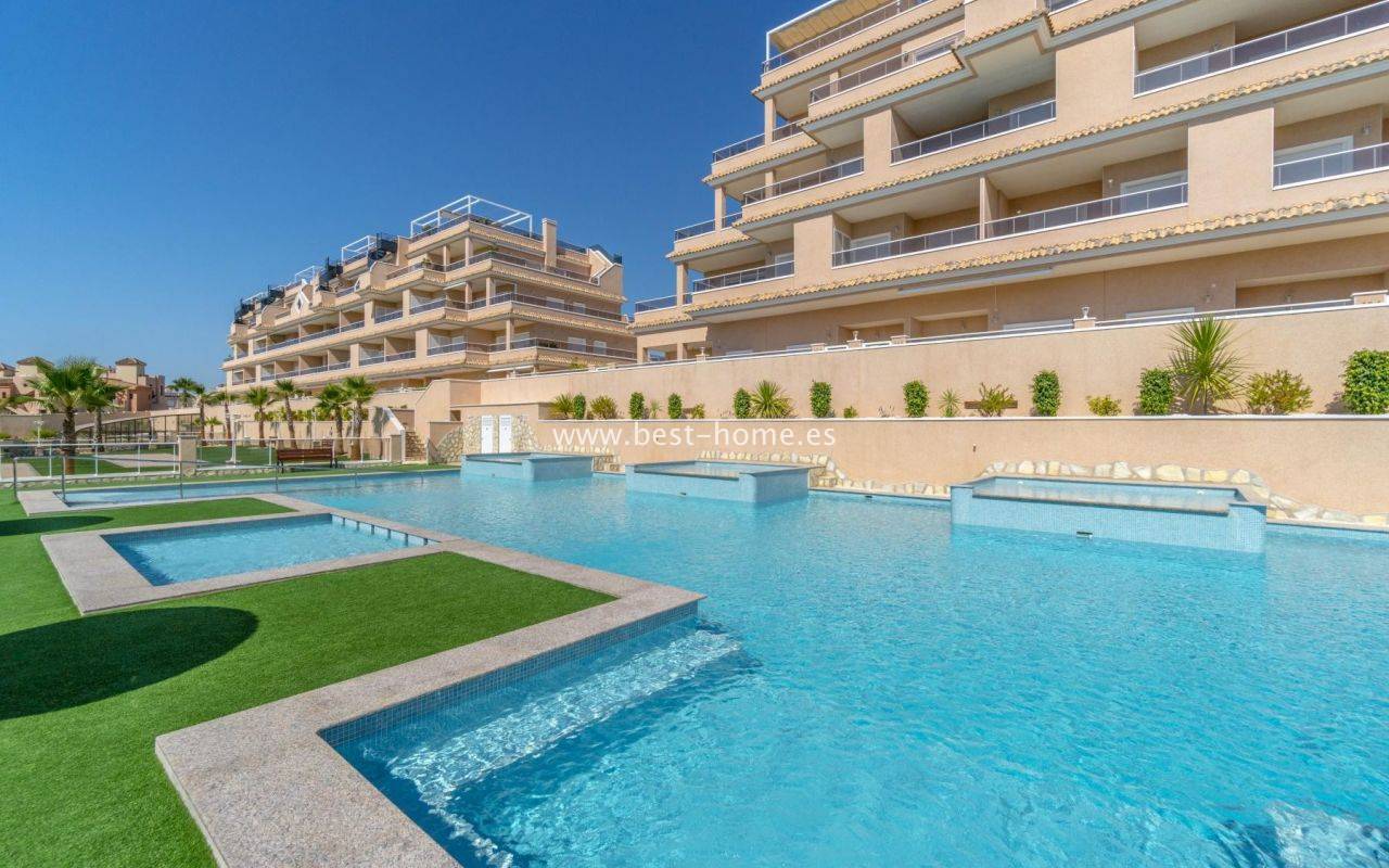 Attractive apartment located in a gated community in Punta Prima. The property is on the 2nd floor, consists of two bedrooms, two bathrooms, a furnished kitchen combined with a dining room and living room. From the living room and the master bedroom there is an exit to the terrace, from which there is an open view of the estate and the sea. The price includes furniture, household appliances, central air conditioning, heated floors in the bathrooms and a parking space. On the estate there are two swimming pools, one of which is heated, a sauna, a playground for children and a bocce court.