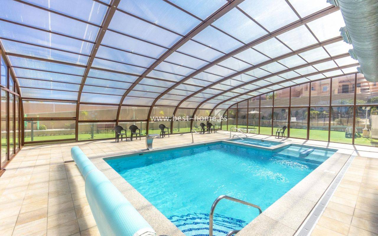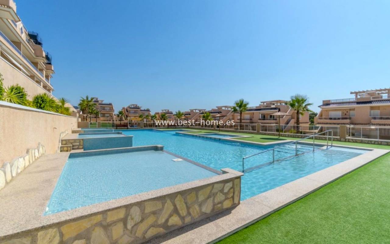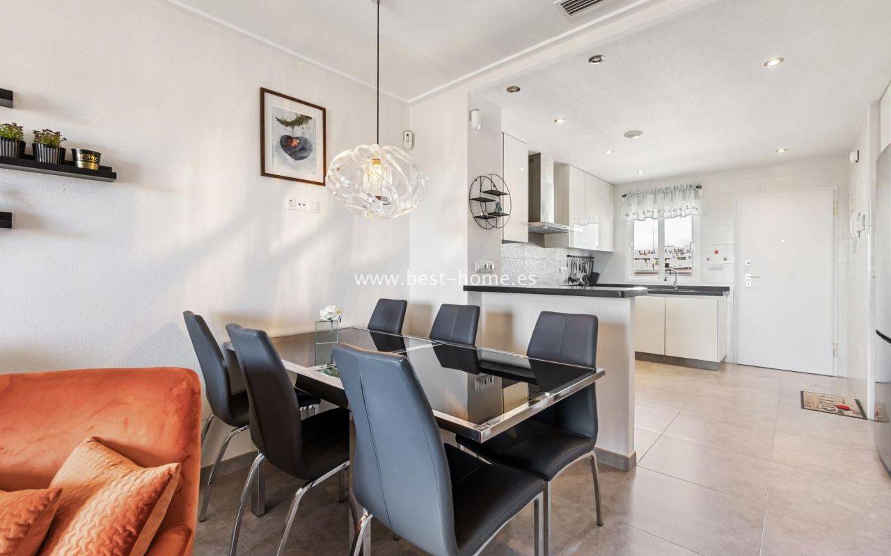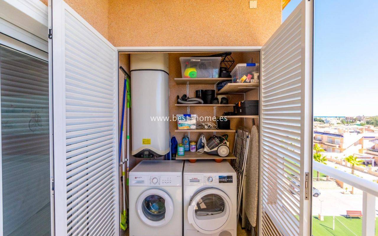 Attractive apartment located in a gated community in Punta Prima. The property is on the 2nd floor, consists of two bedrooms, two bathrooms, a furnished kitchen combined with a dining room and living room. From the living room and the master bedroom there is an exit to the terrace, from which there is an open view of the estate and the sea. The price includes furniture, household appliances, central air conditioning, heated floors in the bathrooms and a parking space. On the estate there are two swimming pools, one of which is heated, a sauna, a playground for children and a bocce court.