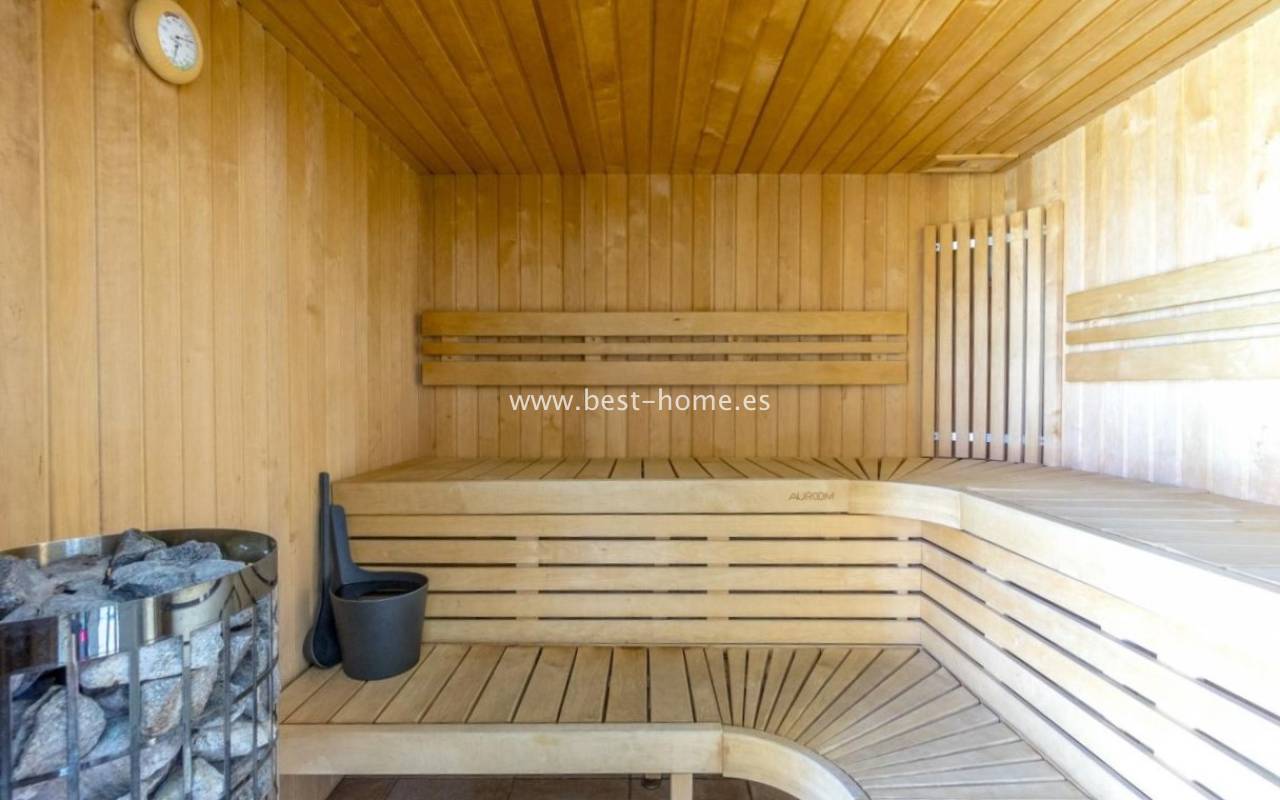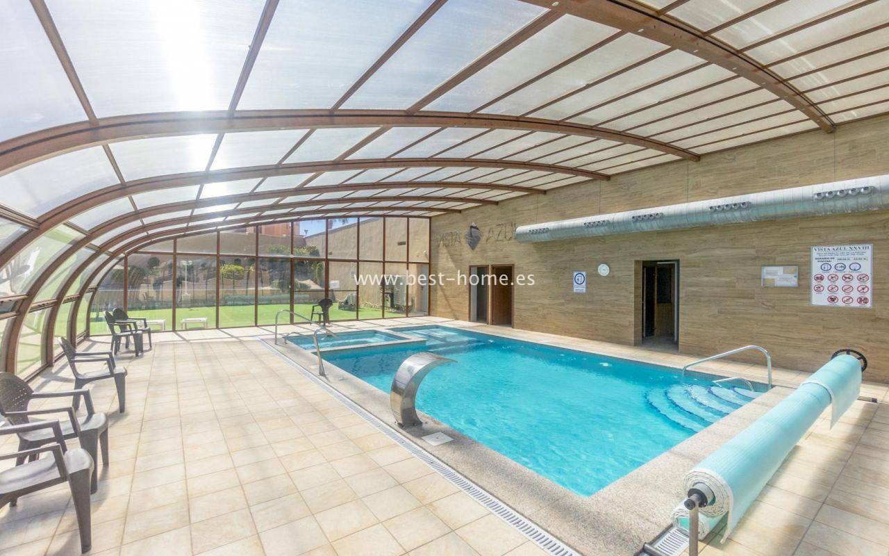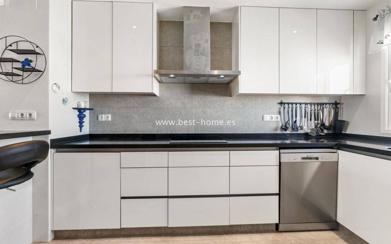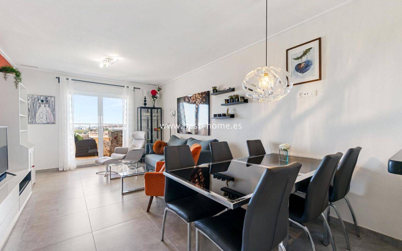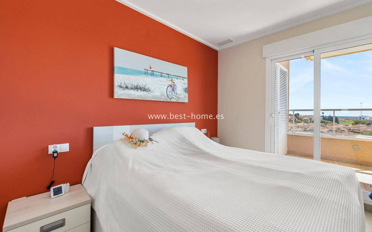 Attractive apartment located in a gated community in Punta Prima. The property is on the 2nd floor, consists of two bedrooms, two bathrooms, a furnished kitchen combined with a dining room and living room. From the living room and the master bedroom there is an exit to the terrace, from which there is an open view of the estate and the sea. The price includes furniture, household appliances, central air conditioning, heated floors in the bathrooms and a parking space. On the estate there are two swimming pools, one of which is heated, a sauna, a playground for children and a bocce court.