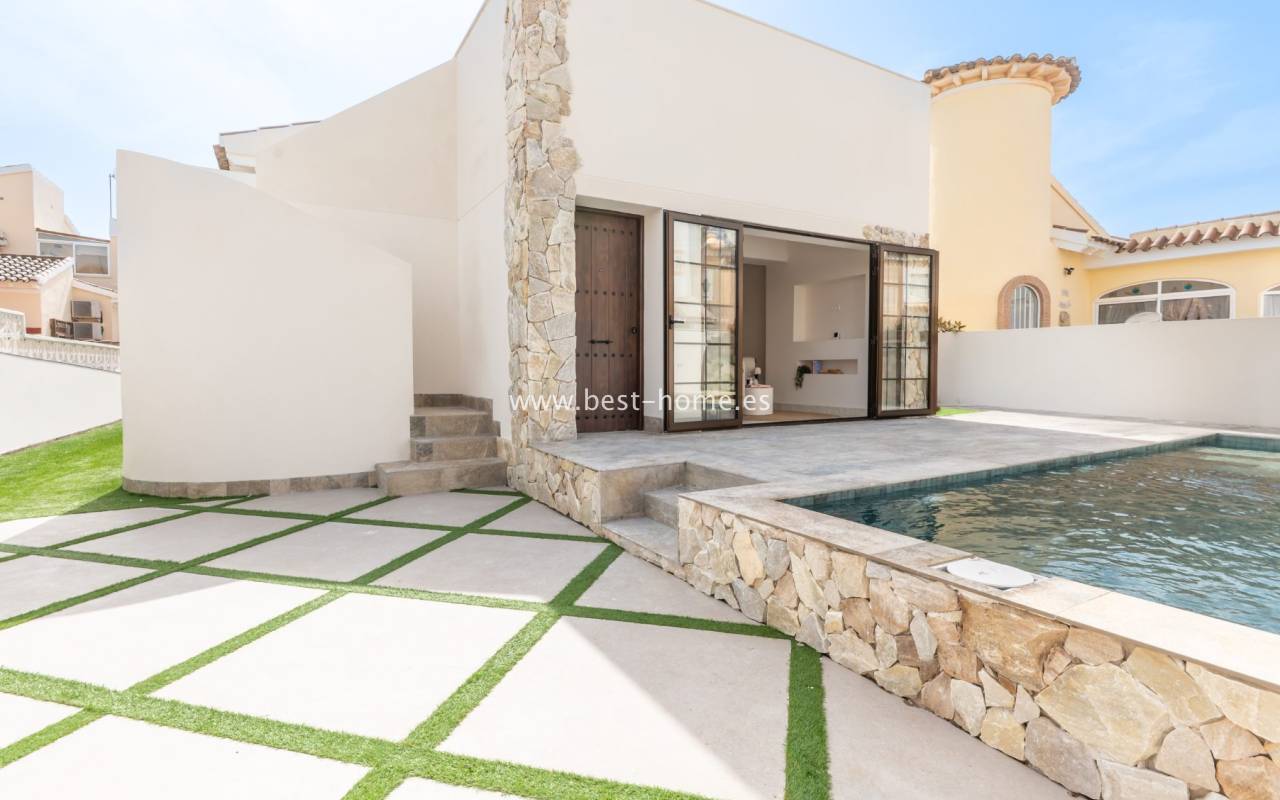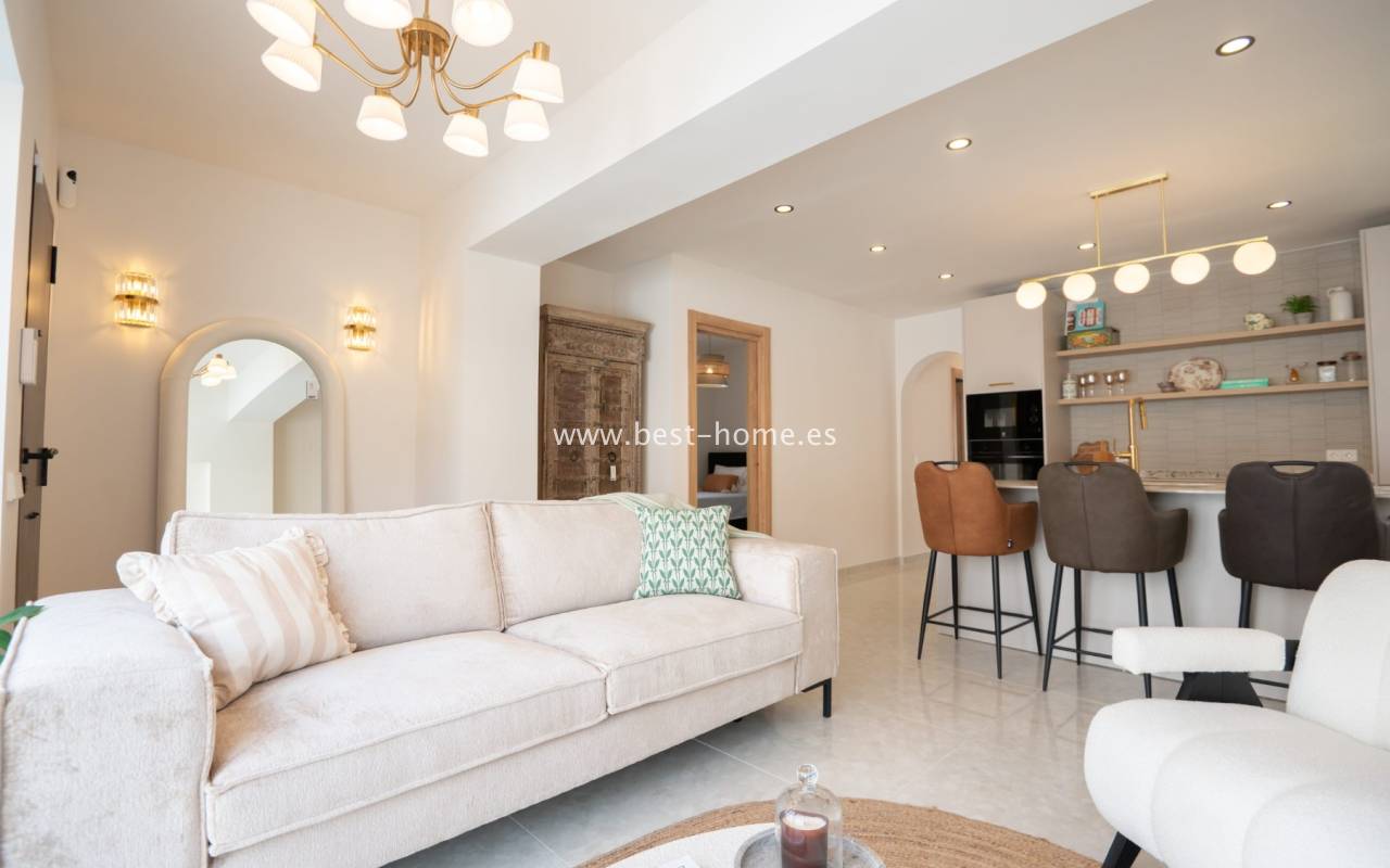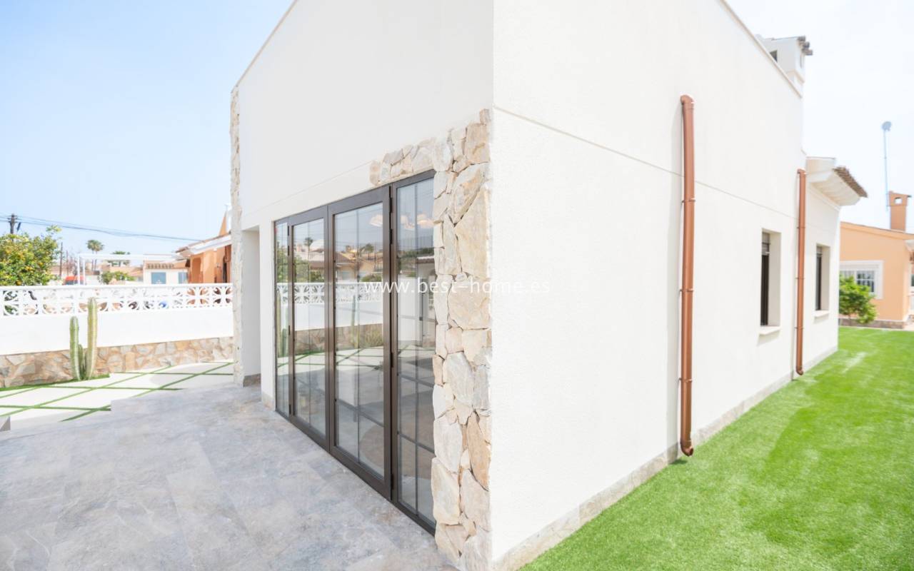 We invite you to discover this remarkable detached villa located in one of the most sought-after areas of Playa Flamenca. This beautifully renovated property is a true gem on the market. Designed with meticulous attention to detail by the renowned House of Murray, it combines elegance, comfort, and contemporary Mediterranean living.