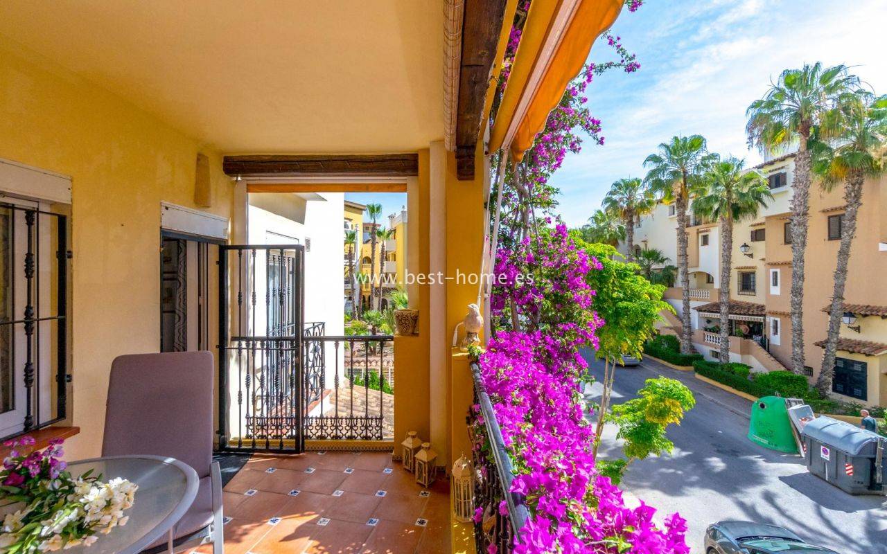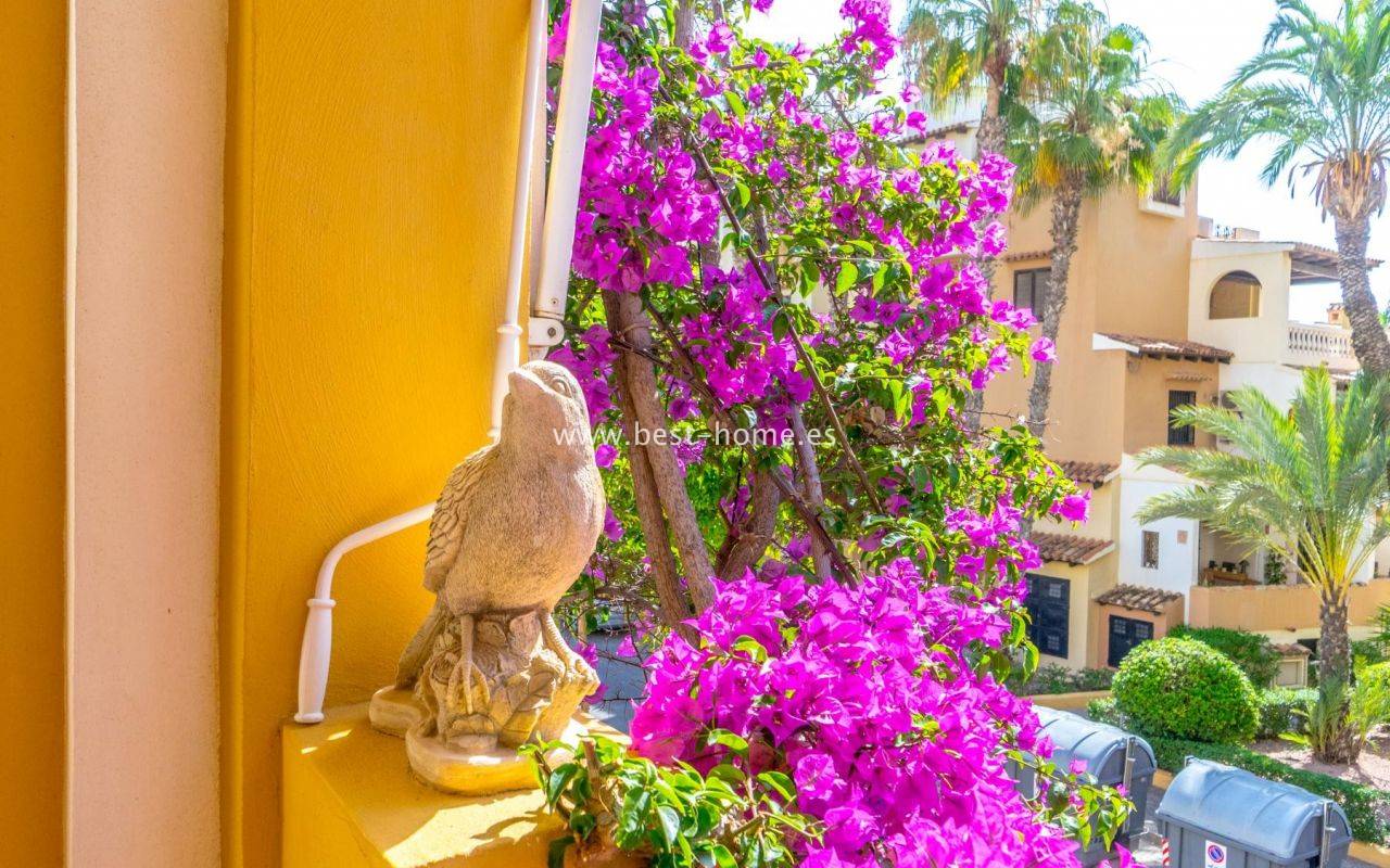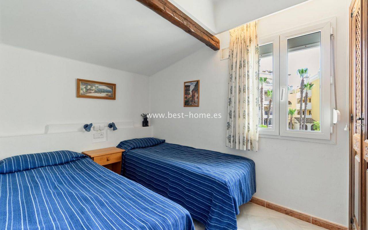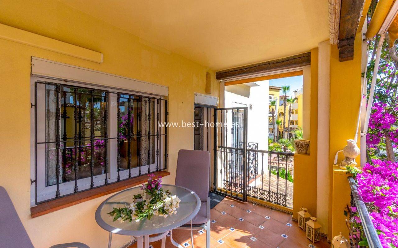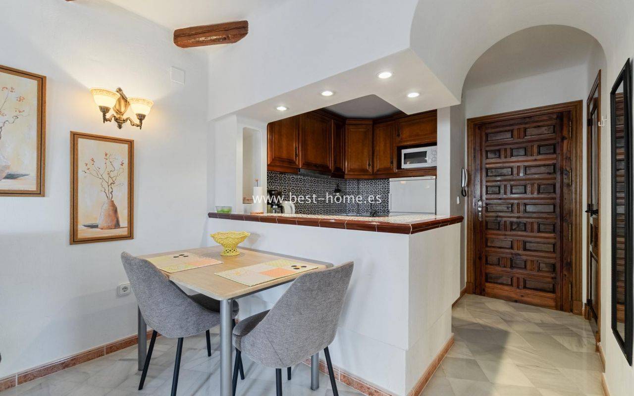 This amazing apartment is located in the beautiful Spanish estate of Aldea del Mar. The property is on the 1st floor, consists of two bedrooms, a bathroom, a furnished kitchen connected to the living room. From the living room there is an exit to the terrace, from which there is a wonderful view of the charming estate full of greenery. The price includes furniture, household appliances and air conditioning.