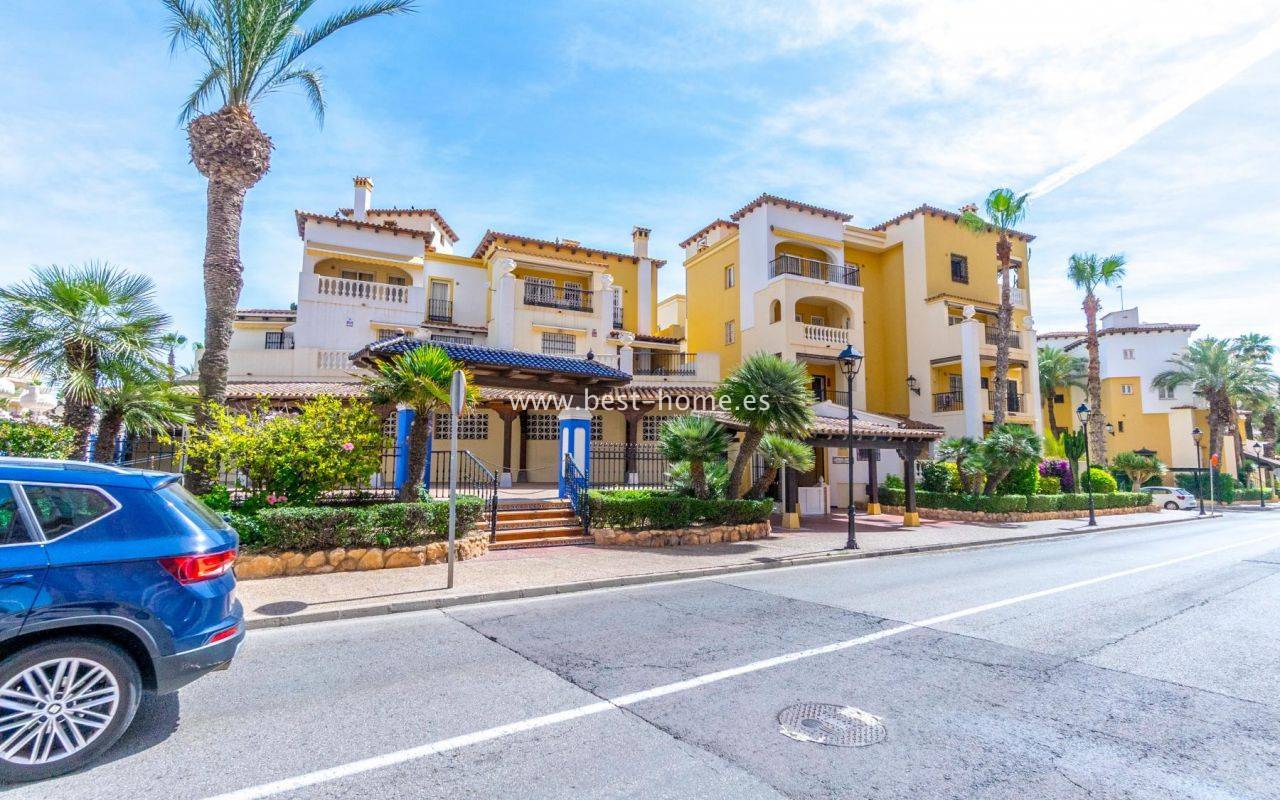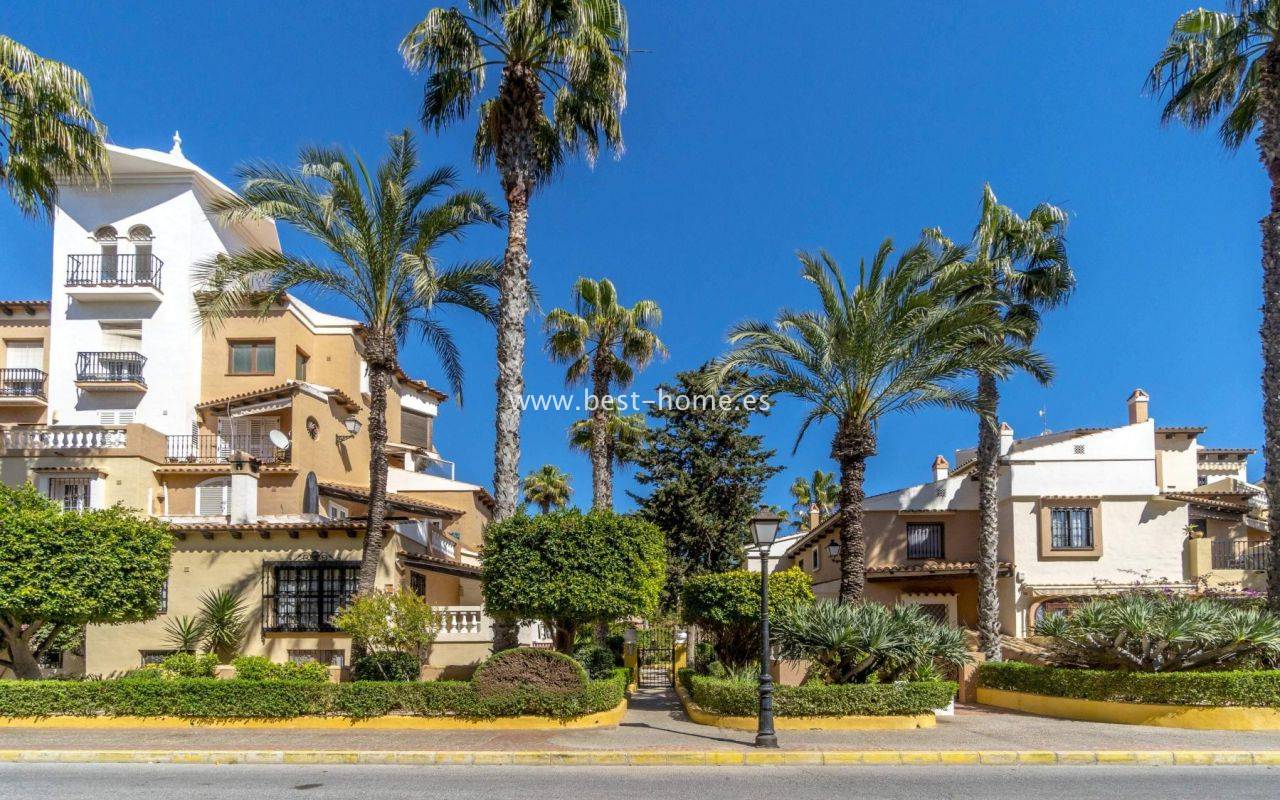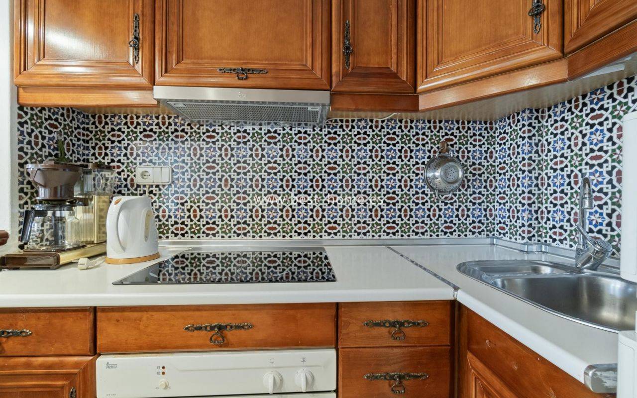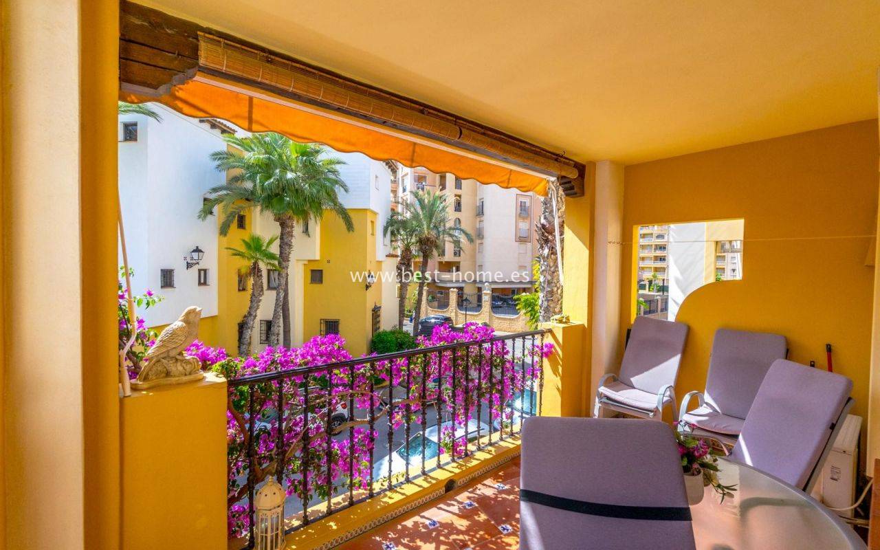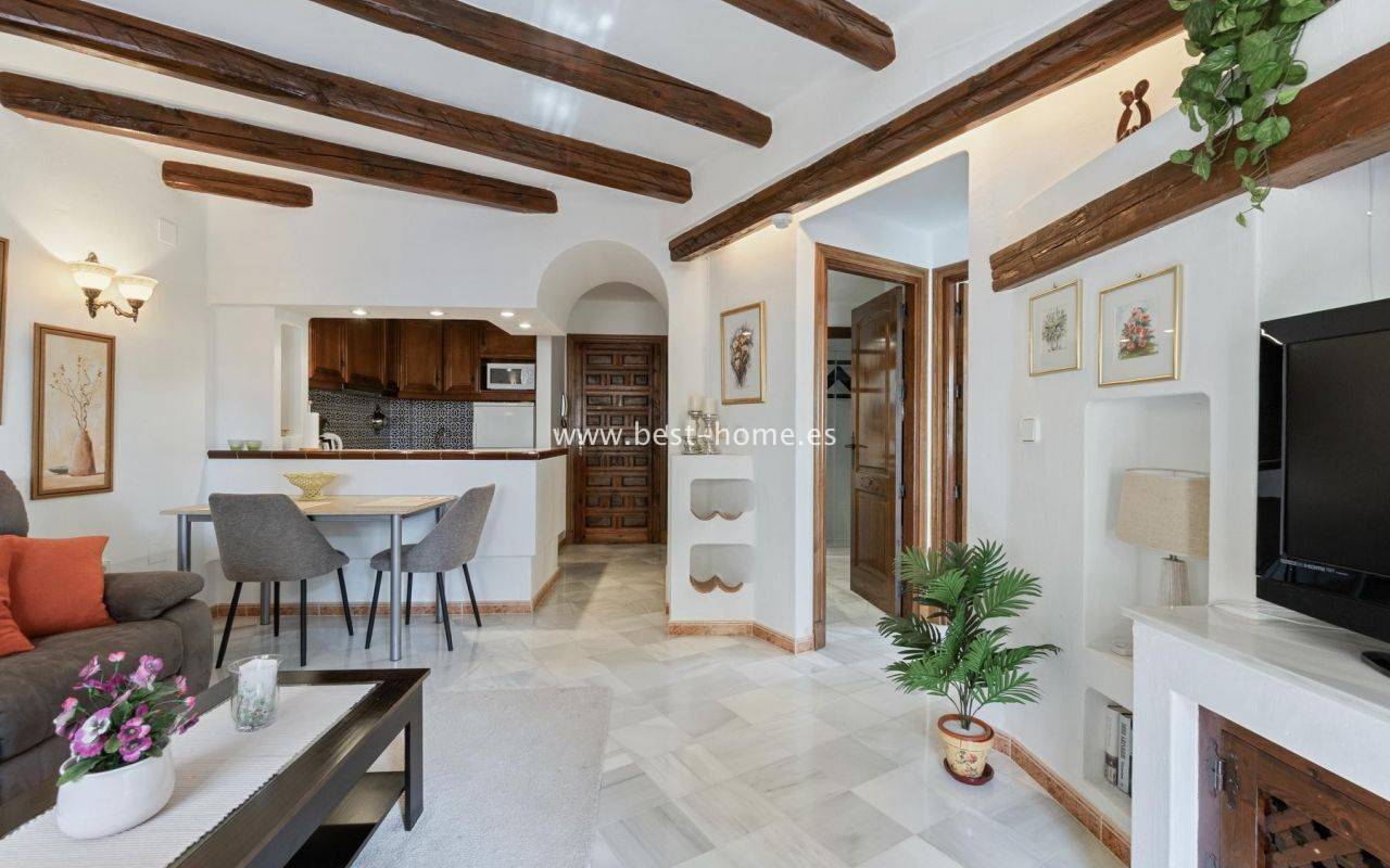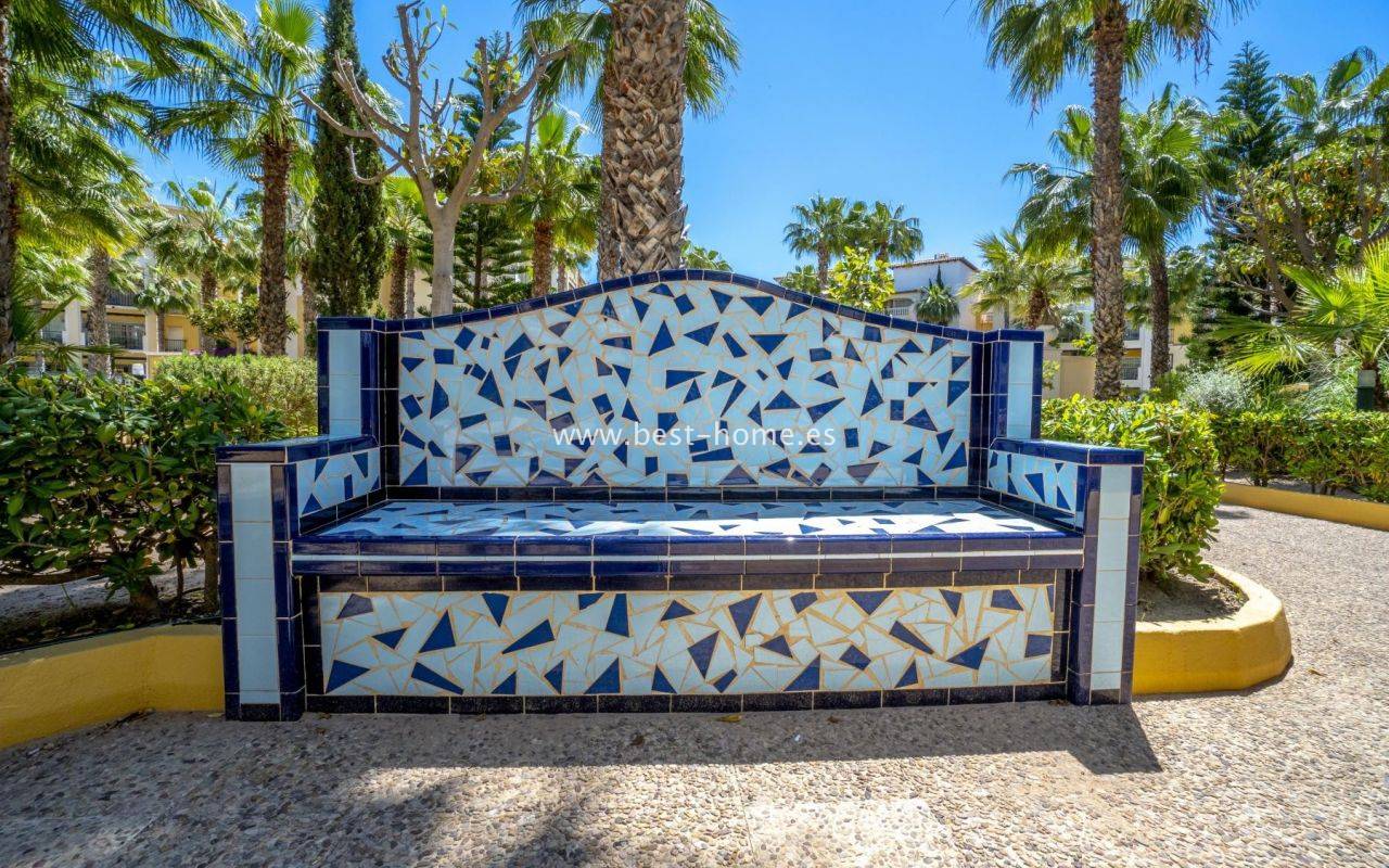 This amazing apartment is located in the beautiful Spanish estate of Aldea del Mar. The property is on the 1st floor, consists of two bedrooms, a bathroom, a furnished kitchen connected to the living room. From the living room there is an exit to the terrace, from which there is a wonderful view of the charming estate full of greenery. The price includes furniture, household appliances and air conditioning.