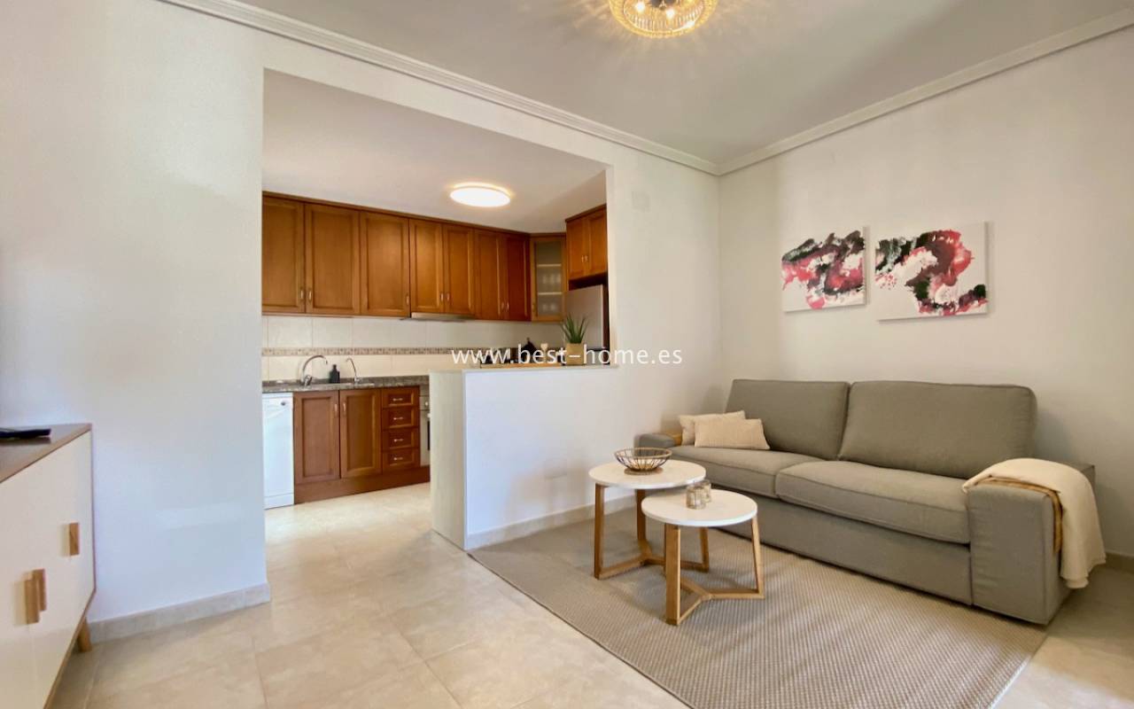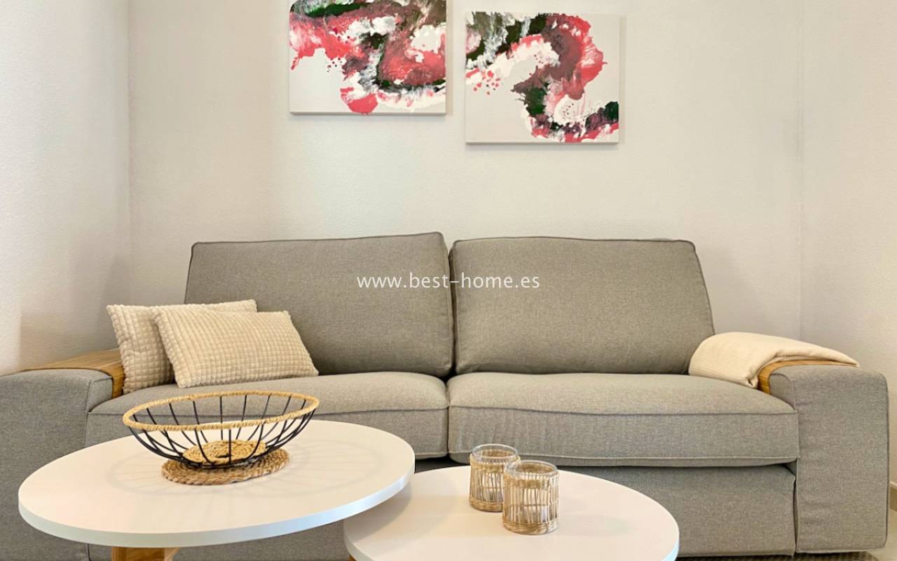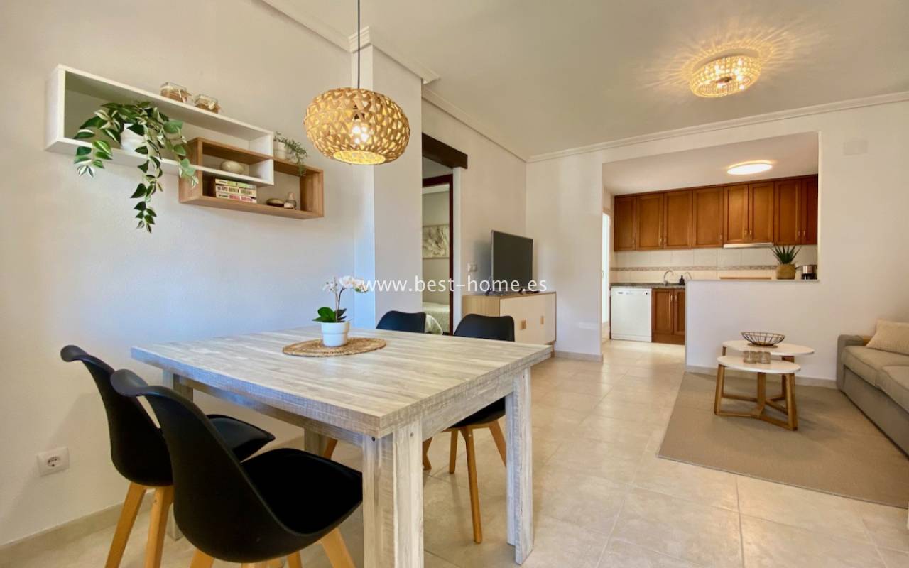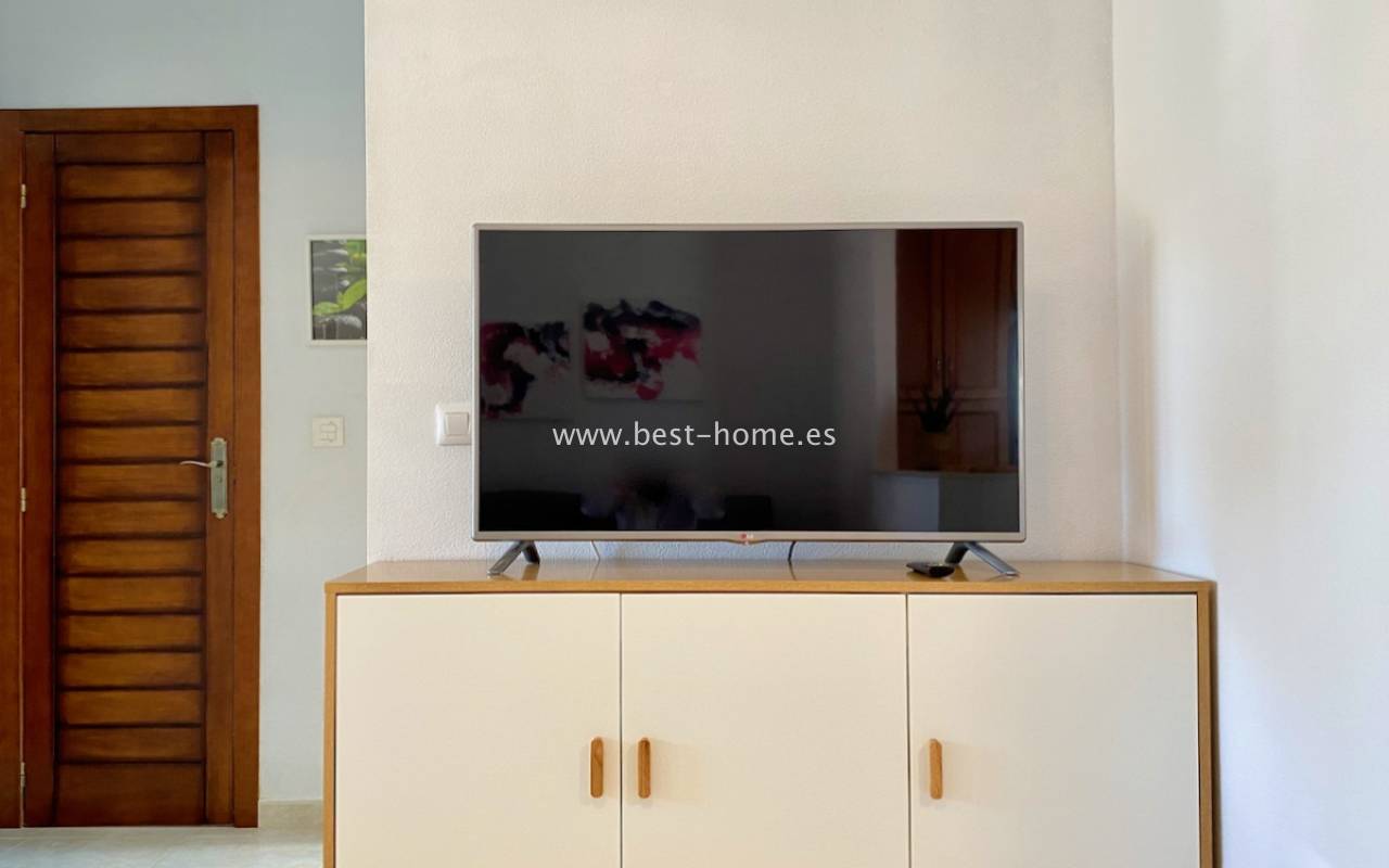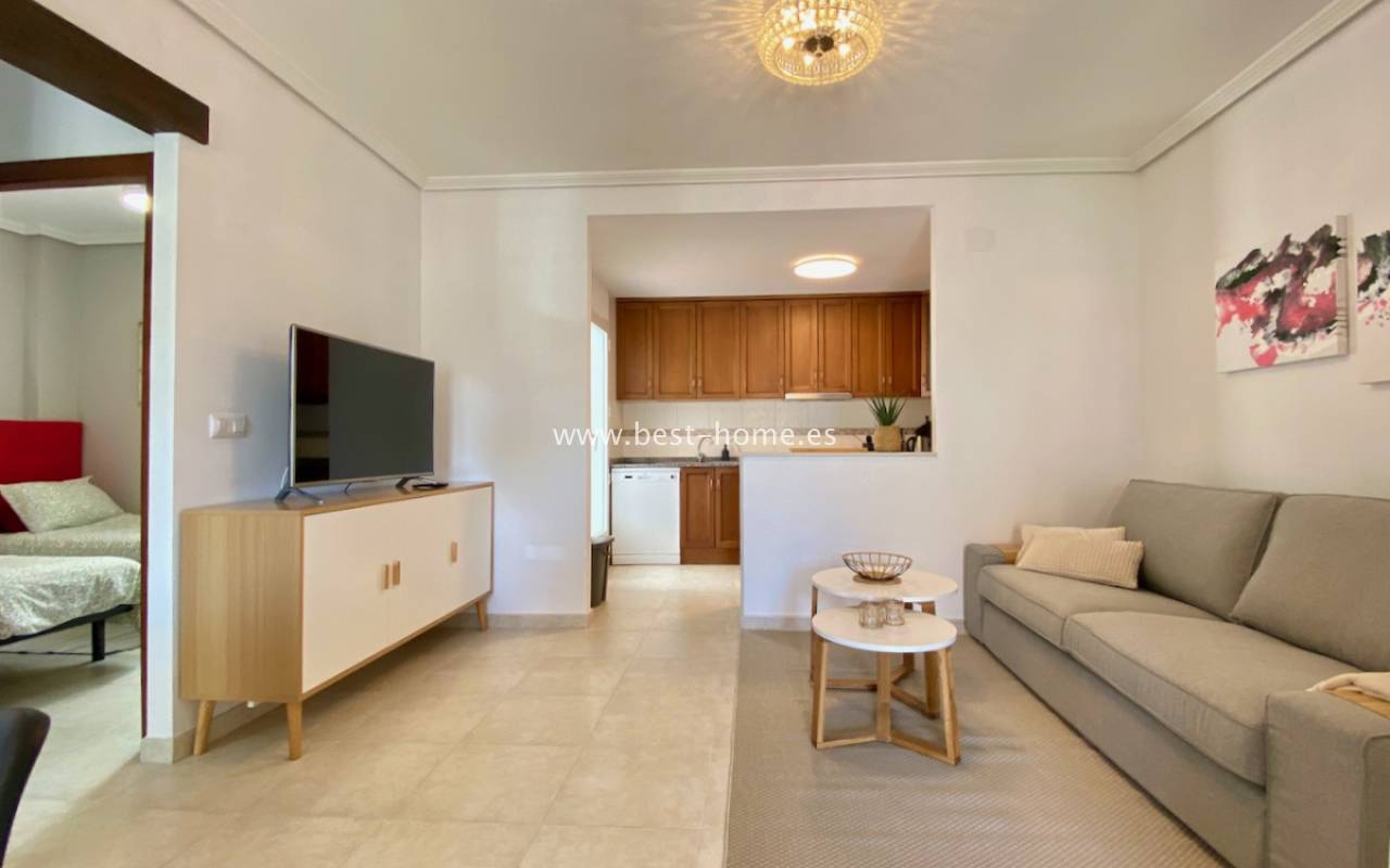 Beautiful ground floor apartment with a picturesque garden, community pool and parking space in the Aguas Nuevas urbanization in Torrevieja. It has a very sunny private garden of 24 m2, through which we get to the bright living room in a Scandinavian arrangement, then we find an American-style kitchen equipped with household appliances, 2 double bedrooms with built-in wardrobes, a bathroom. The apartment is furnished and equipped with air conditioning. In the price of the property we will receive a parking space. Additionally, we will find a large swimming pool, which can be used by residents of the estate.
