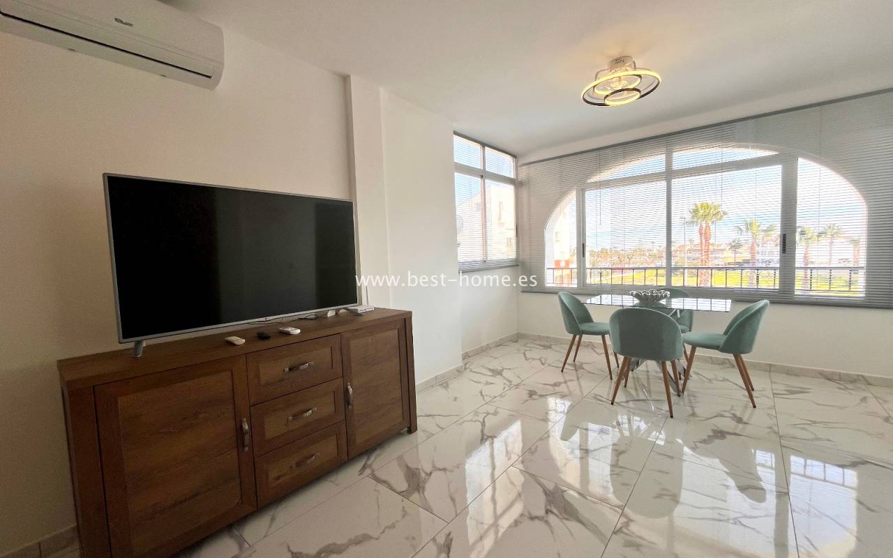 Apartment close to the golf course with a community pool in the picturesque town of Villamartin. It has a living room extended by a terrace, a modern dining room, a kitchen equipped with household appliances, 1 double bedroom with a built-in wardrobe, a bathroom and a utility room. The apartment is furnished and equipped with air conditioning. On the estate there is a swimming pool intended for residents. Ideal property for holiday or long-term rental. Nearby we will find a golf course, a large number of bars, pubs and restaurants.