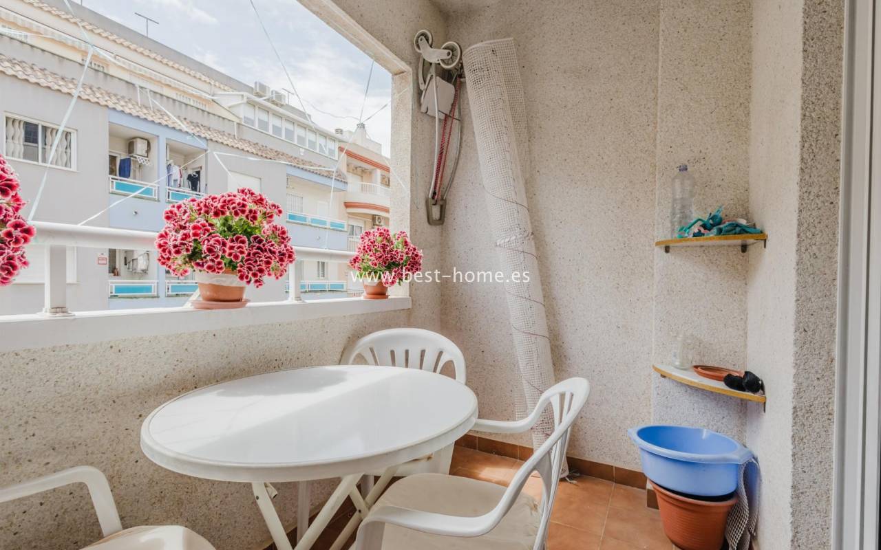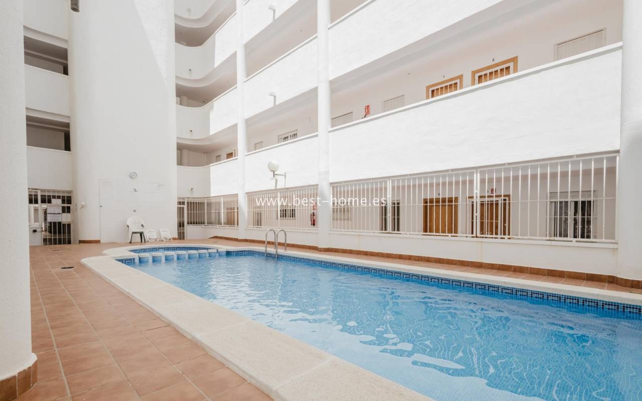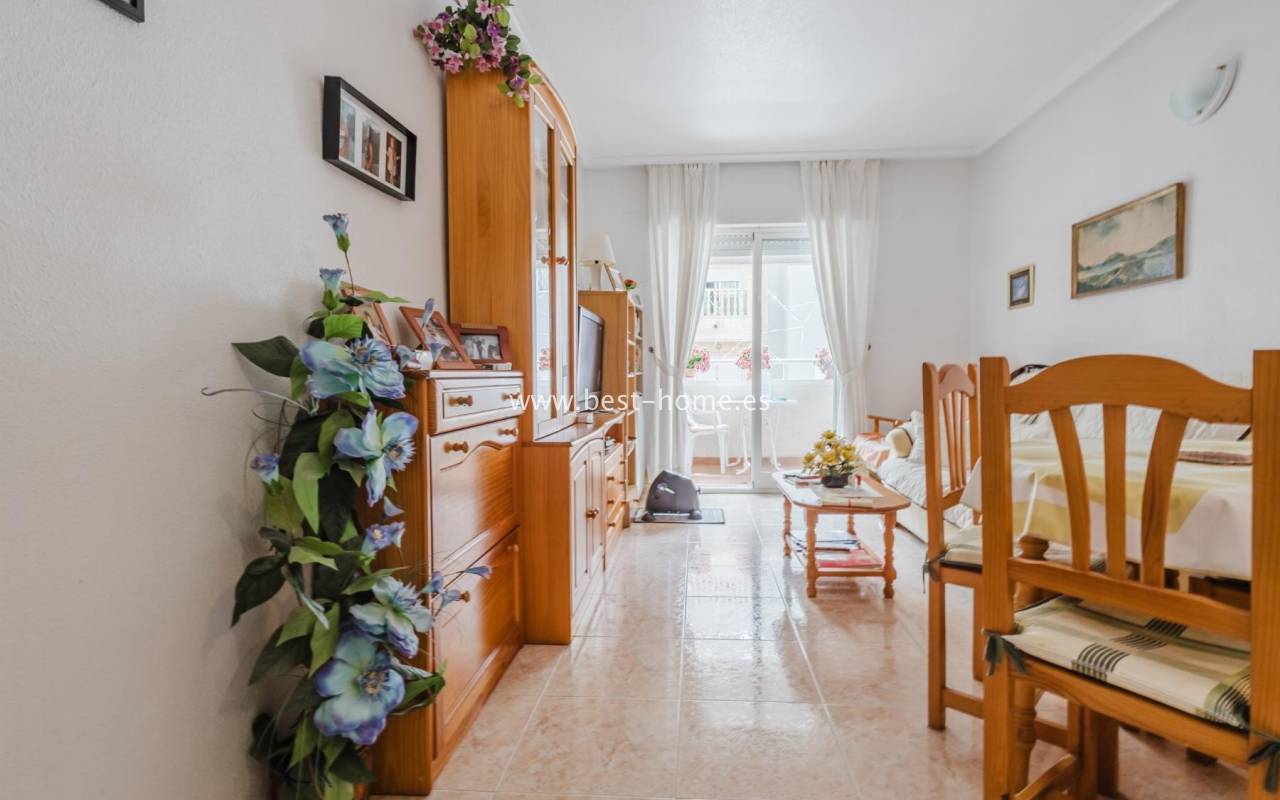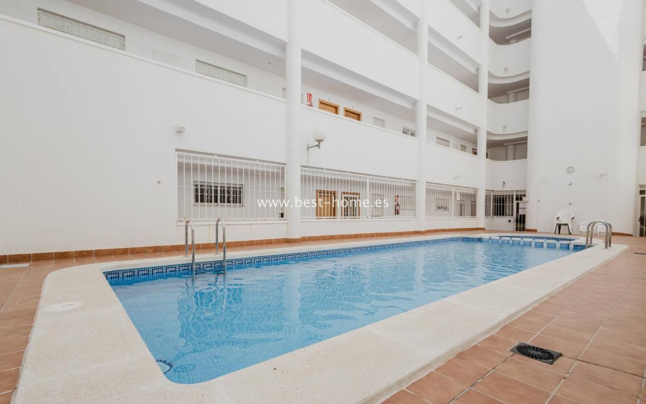 For sale: an apartment located on the third floor of a building with a swimming pool in Torrevieja. The property consists of two bedrooms, one bathroom, a living room with a dining area, and a kitchen. The building is situated in an excellent location, with shops, pharmacies, a school, parks, and other amenities all nearby. An additional advantage is the proximity to the beach – just about 500 meters away on foot. It is an ideal place both for permanent living and as an investment for holiday rentals.