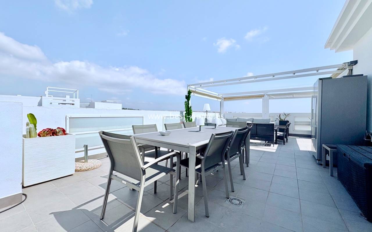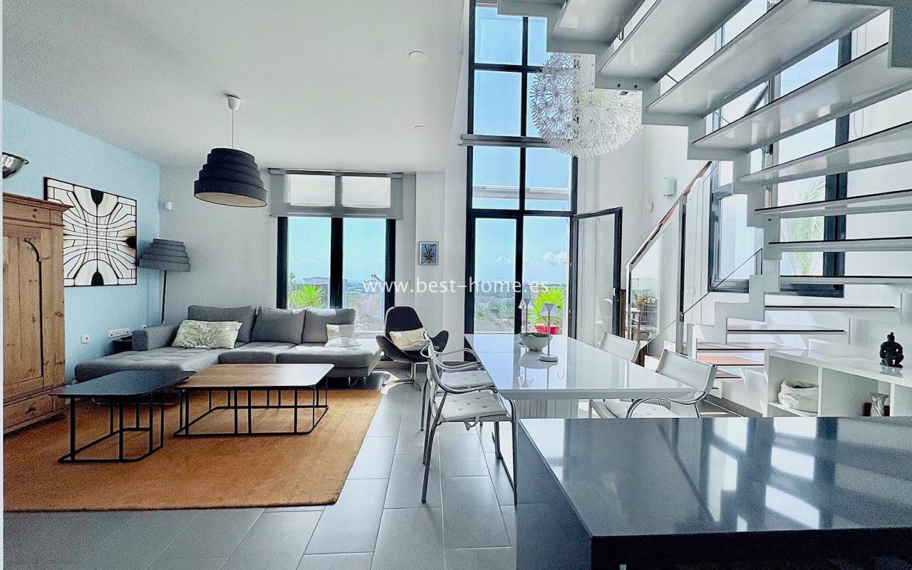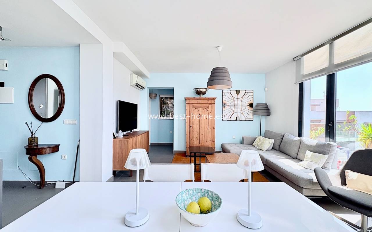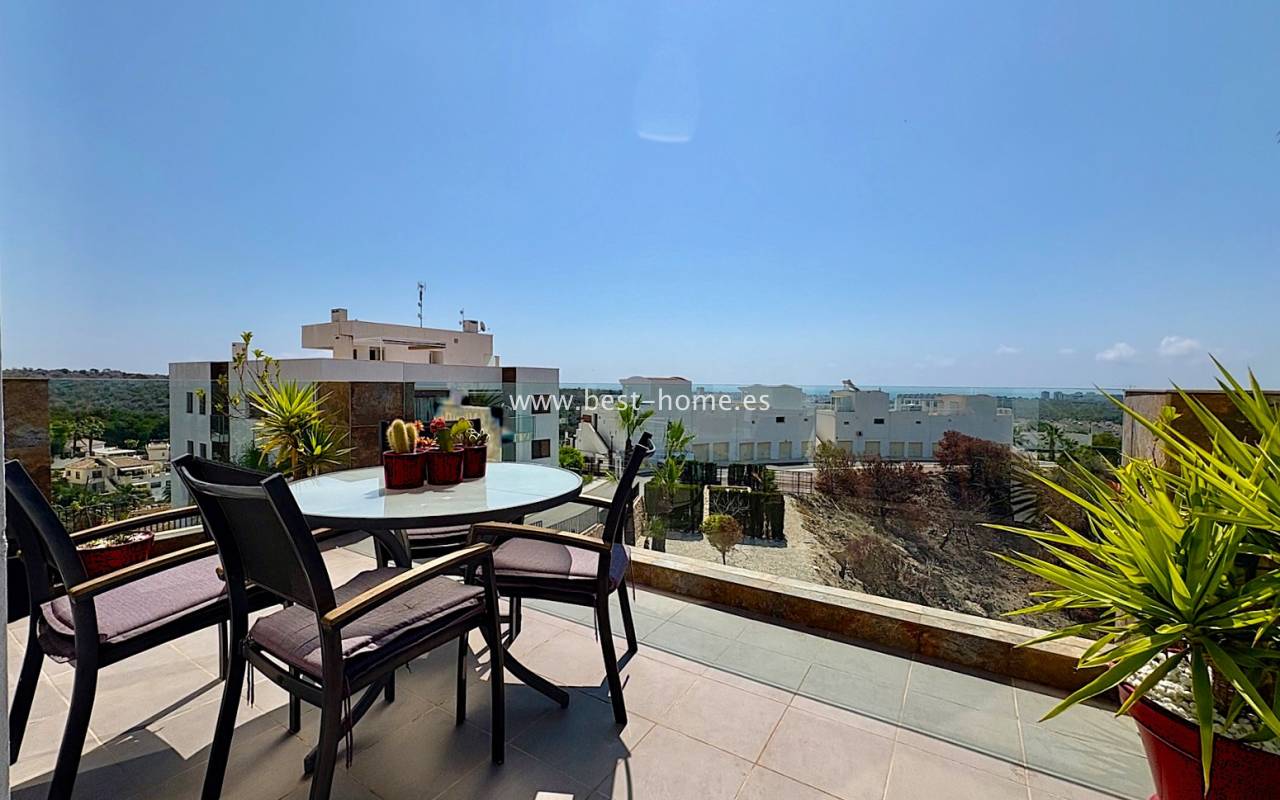 This unique penthouse is located at the highest point of the fantastic Las Ramblas golf course. The main floor features a spacious and bright living-dining room with a fitted kitchen, two bedrooms, and a bathroom. The living room opens onto a terrace (approximately 12 square meters) with fantastic views of Las Ramblas and the surrounding area. A stunning staircase leads to the upper level, where you'll find a third bedroom, a second bathroom, and a huge 78-square-meter terrace. The terrace offers views of the sea, the forest, the communal areas, and the surrounding area. The price includes furniture, appliances, and air conditioning.