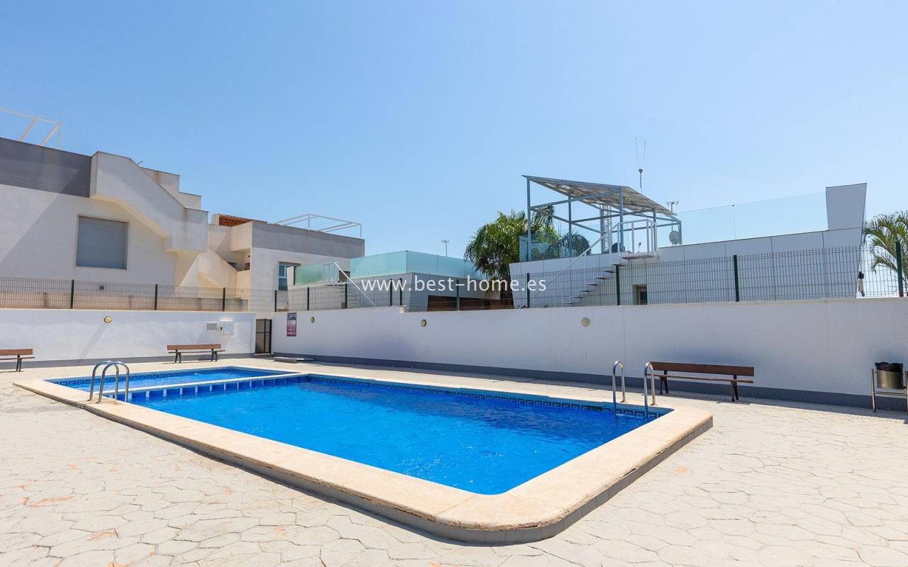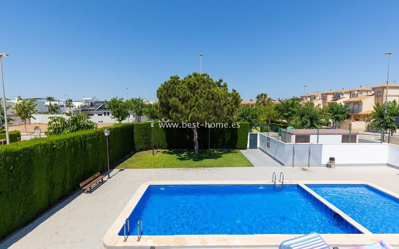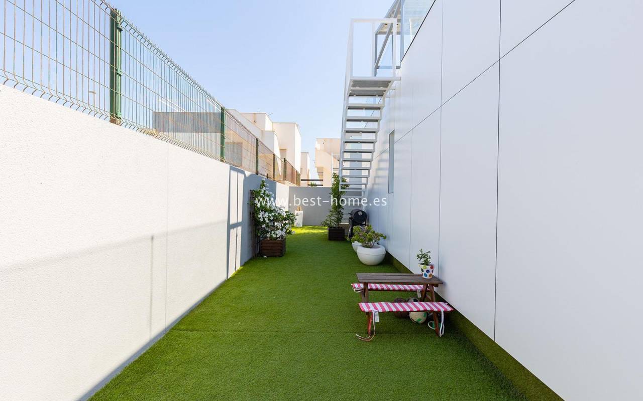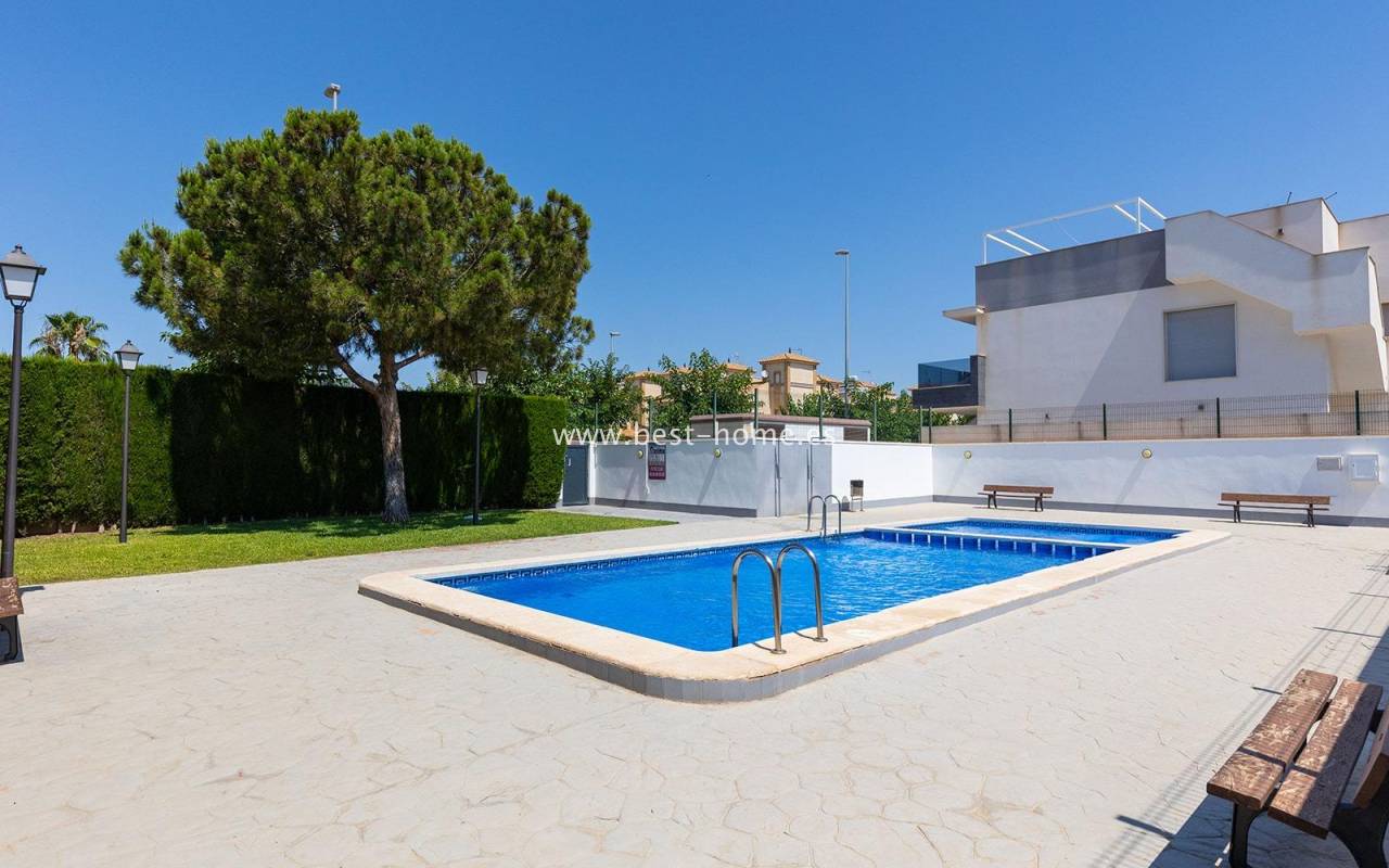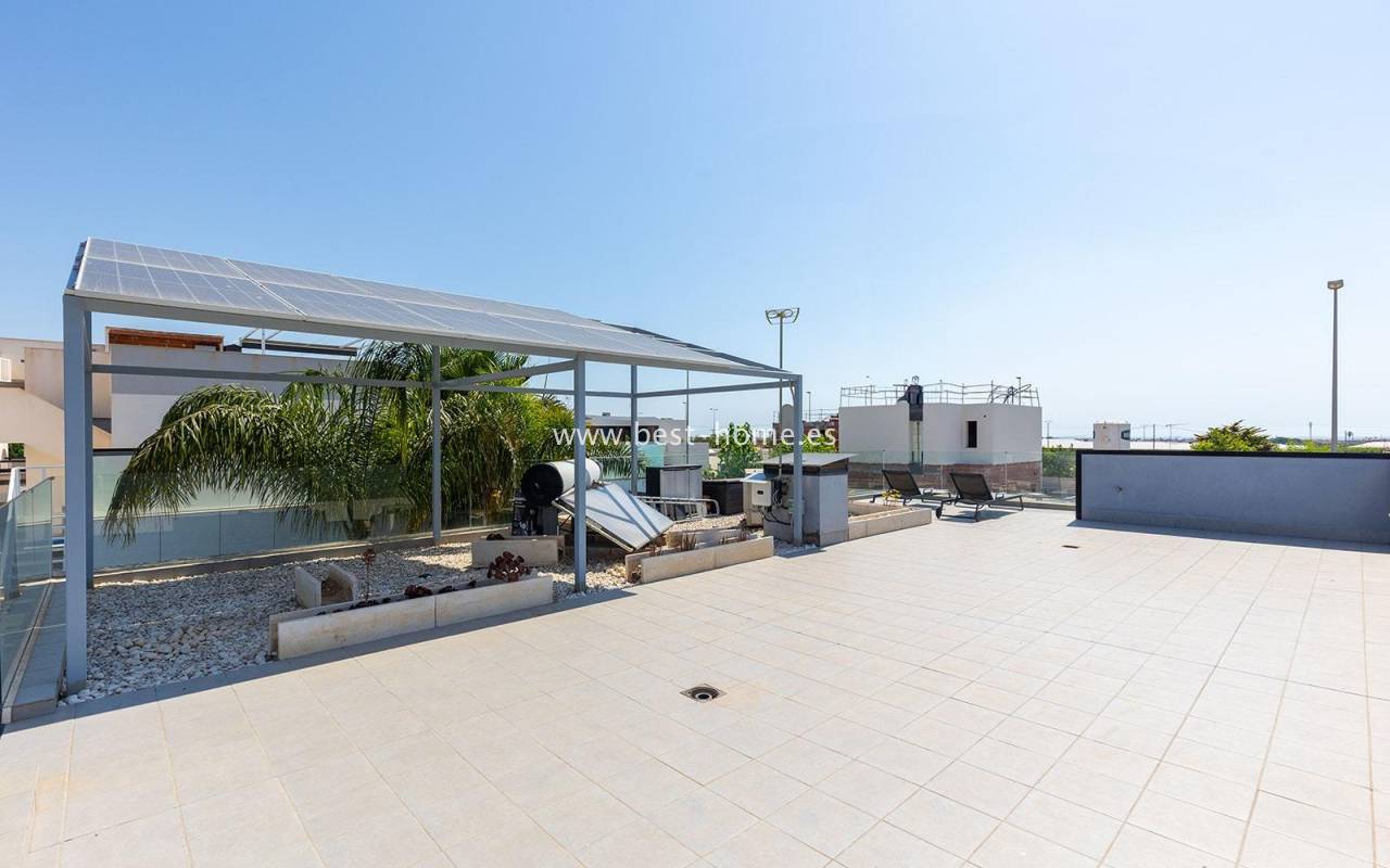 A luxurious corner villa with a solarium, picturesque garden, parking, and community pool in the picturesque village of Pilar de la Horadada. The house features a bright, spacious living room, three bedrooms, including the master with an ensuite bathroom and walk-in closet, two bathrooms, and a large kitchen equipped with appliances, which leads to a utility room. Additionally, the upper floor boasts a large 80m² terrace/solarium with a relaxation area and views of the surrounding area. The villa also boasts a garden with artificial turf, a barbecue area, and parking spaces. The property is equipped with solar panels, making it a very economical option. The community also boasts a swimming pool for residents. The villa is furnished and equipped with central air conditioning. It's an ideal place for a large family in a quiet, peaceful location full of greenery and a Mediterranean climate.