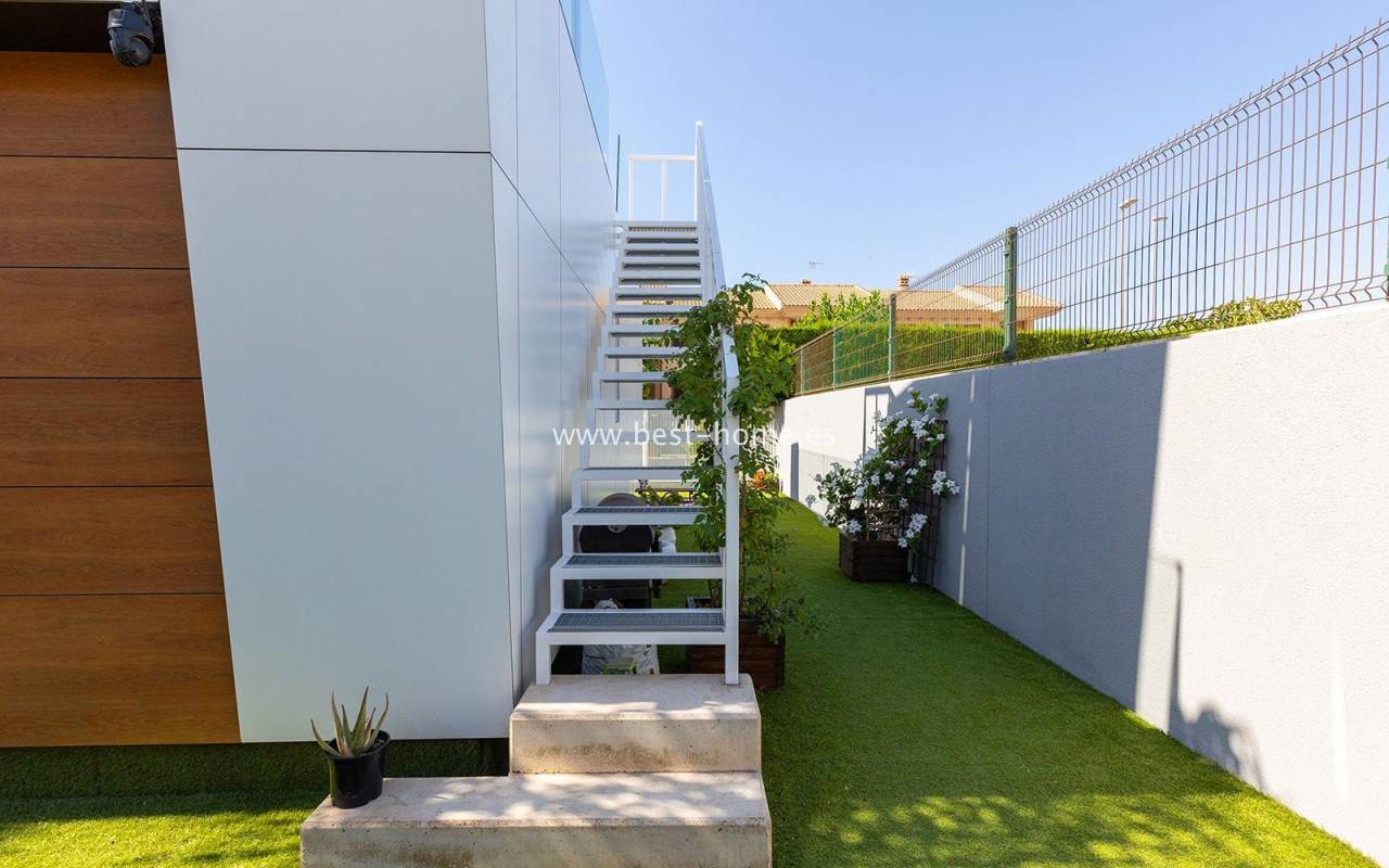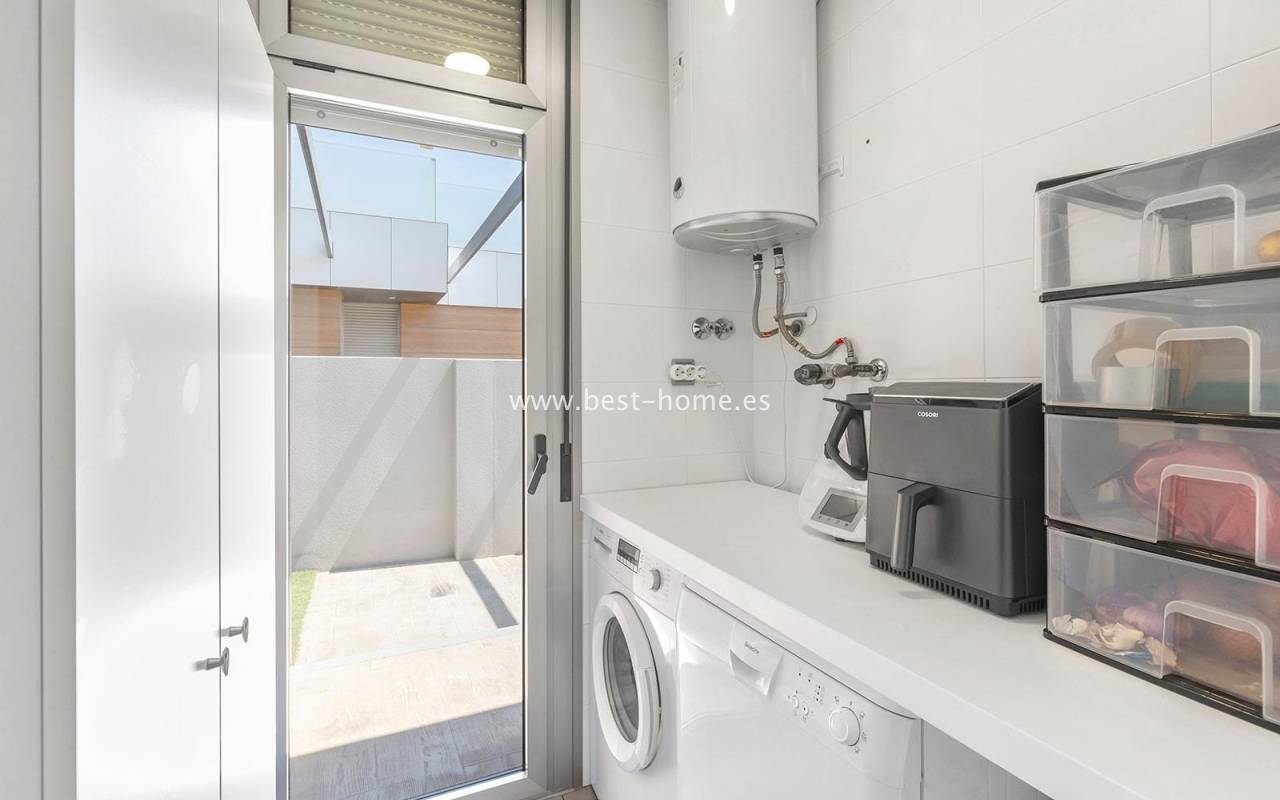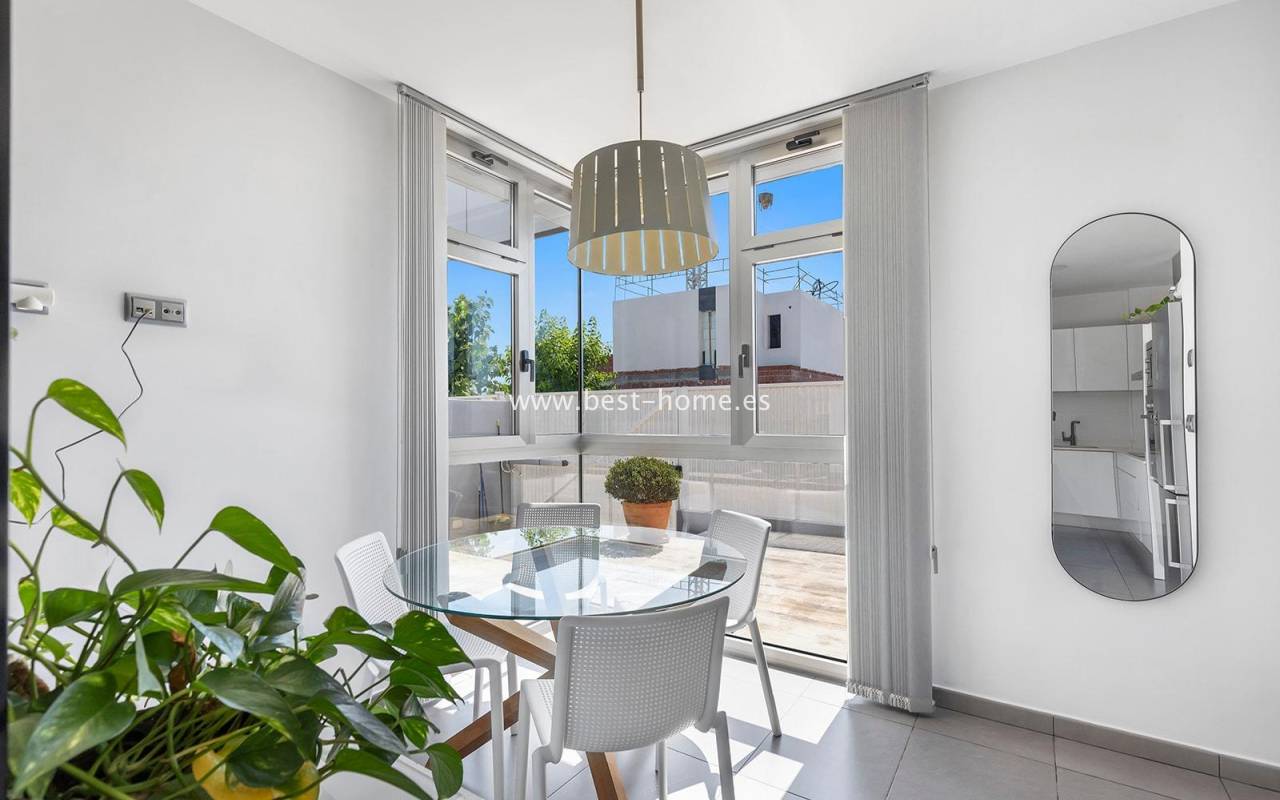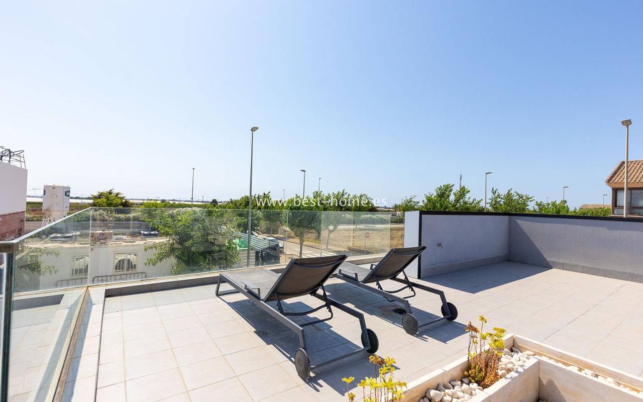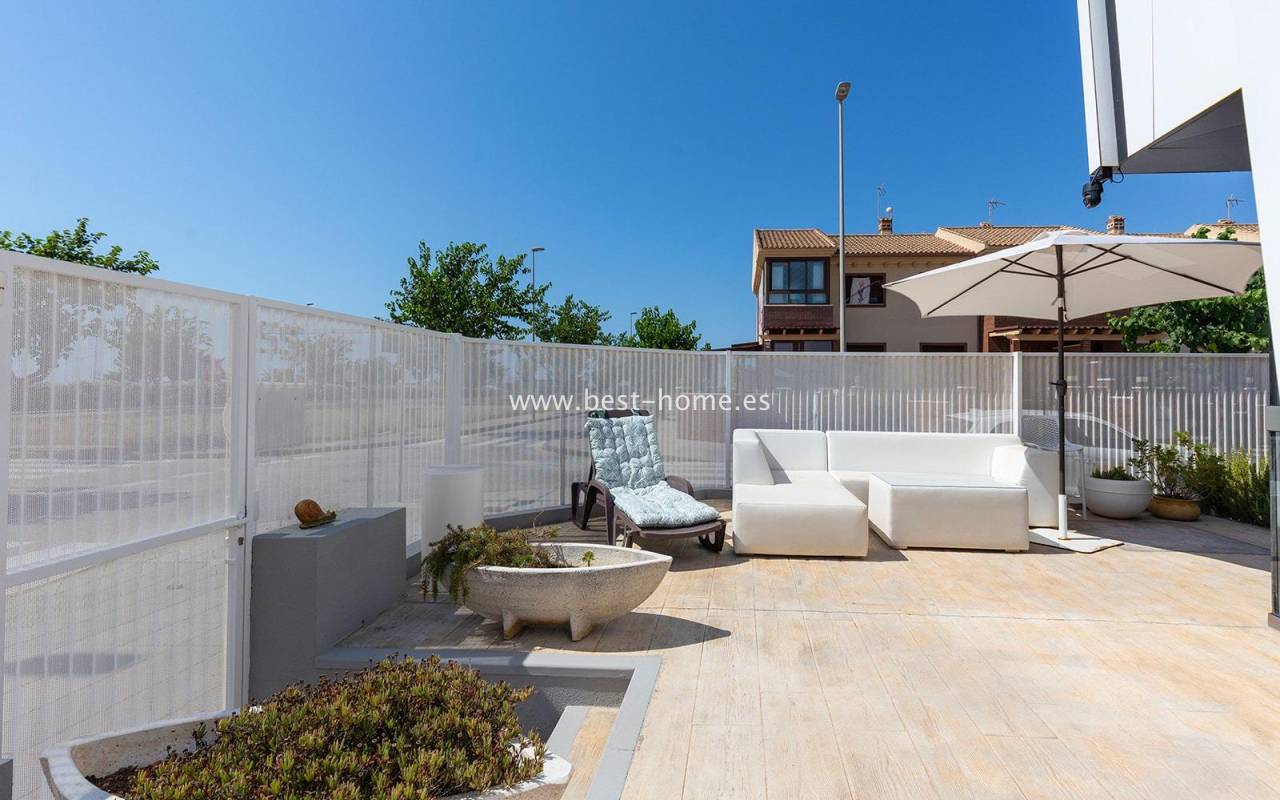 A luxurious corner villa with a solarium, picturesque garden, parking, and community pool in the picturesque village of Pilar de la Horadada. The house features a bright, spacious living room, three bedrooms, including the master with an ensuite bathroom and walk-in closet, two bathrooms, and a large kitchen equipped with appliances, which leads to a utility room. Additionally, the upper floor boasts a large 80m² terrace/solarium with a relaxation area and views of the surrounding area. The villa also boasts a garden with artificial turf, a barbecue area, and parking spaces. The property is equipped with solar panels, making it a very economical option. The community also boasts a swimming pool for residents. The villa is furnished and equipped with central air conditioning. It's an ideal place for a large family in a quiet, peaceful location full of greenery and a Mediterranean climate.