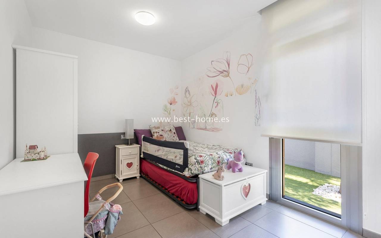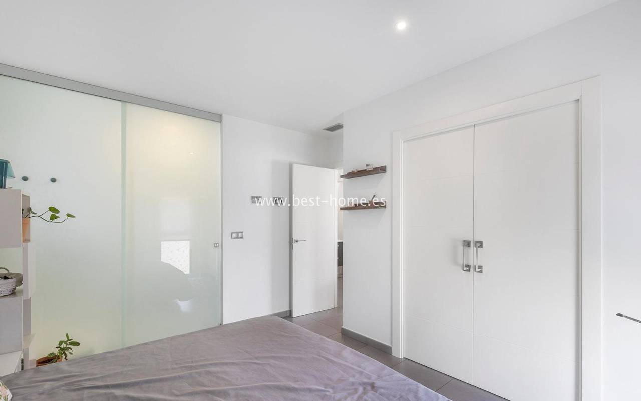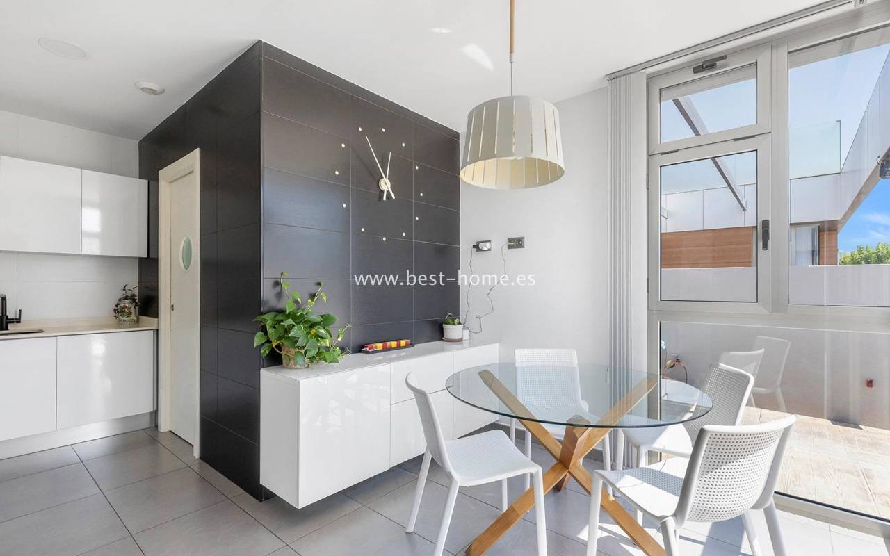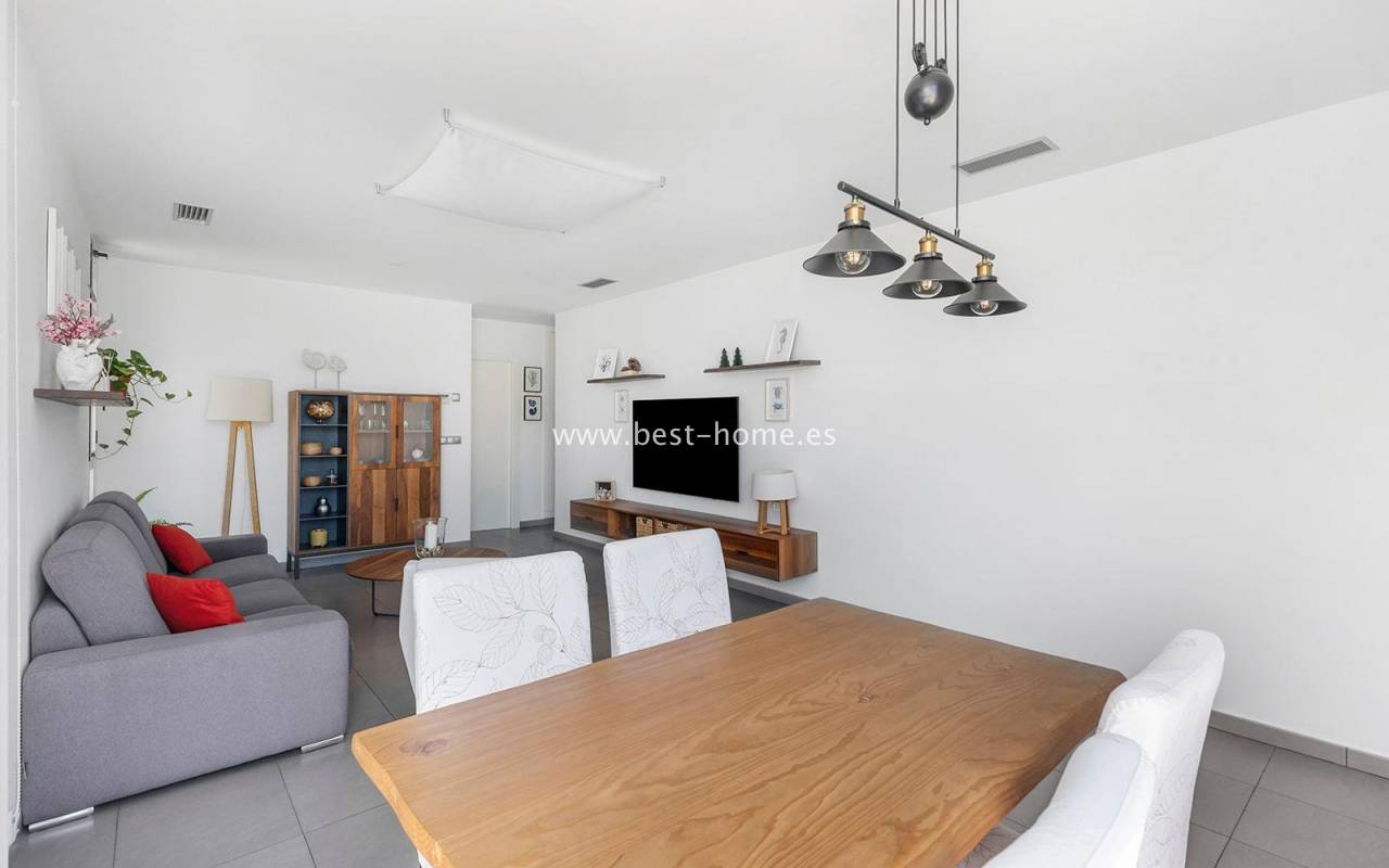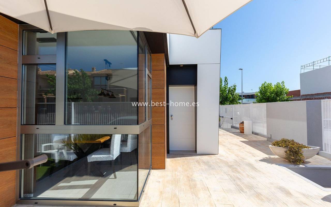 A luxurious corner villa with a solarium, picturesque garden, parking, and community pool in the picturesque village of Pilar de la Horadada. The house features a bright, spacious living room, three bedrooms, including the master with an ensuite bathroom and walk-in closet, two bathrooms, and a large kitchen equipped with appliances, which leads to a utility room. Additionally, the upper floor boasts a large 80m² terrace/solarium with a relaxation area and views of the surrounding area. The villa also boasts a garden with artificial turf, a barbecue area, and parking spaces. The property is equipped with solar panels, making it a very economical option. The community also boasts a swimming pool for residents. The villa is furnished and equipped with central air conditioning. It's an ideal place for a large family in a quiet, peaceful location full of greenery and a Mediterranean climate.
