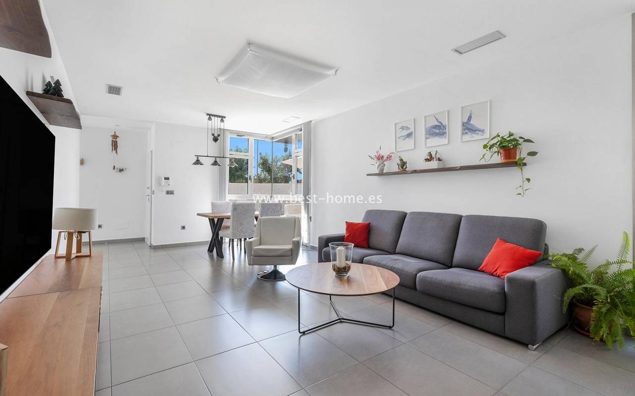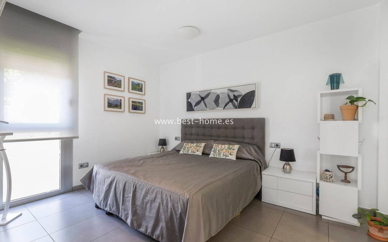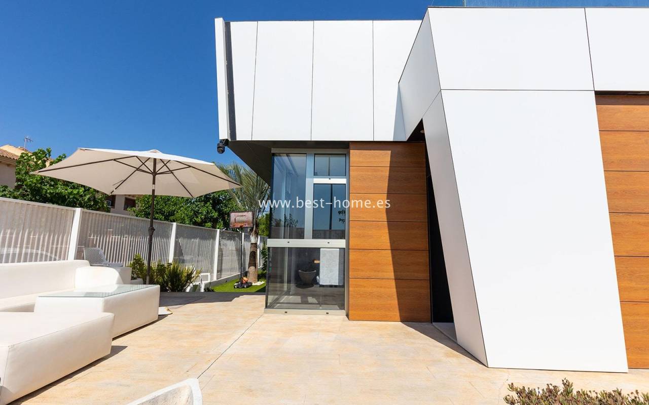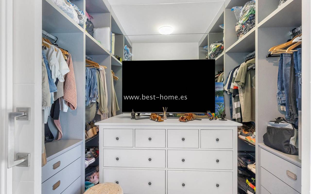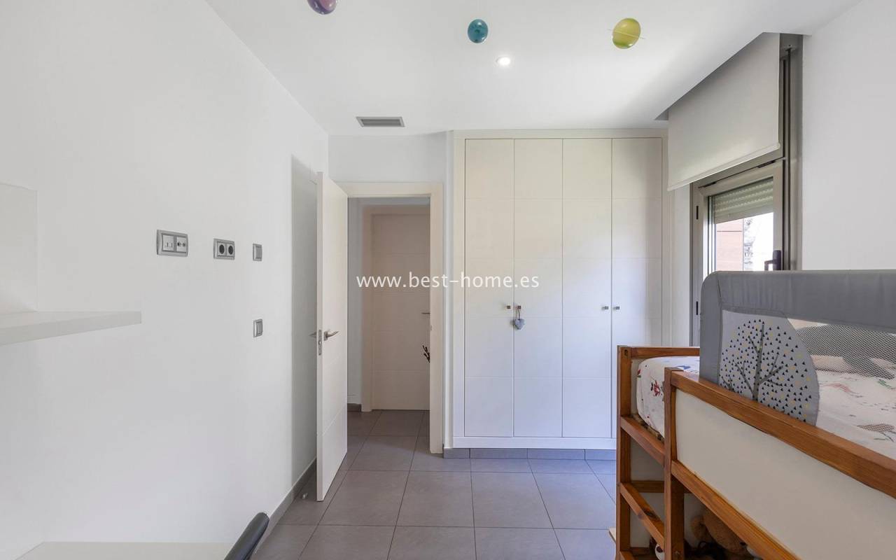 A luxurious corner villa with a solarium, picturesque garden, parking, and community pool in the picturesque village of Pilar de la Horadada. The house features a bright, spacious living room, three bedrooms, including the master with an ensuite bathroom and walk-in closet, two bathrooms, and a large kitchen equipped with appliances, which leads to a utility room. Additionally, the upper floor boasts a large 80m² terrace/solarium with a relaxation area and views of the surrounding area. The villa also boasts a garden with artificial turf, a barbecue area, and parking spaces. The property is equipped with solar panels, making it a very economical option. The community also boasts a swimming pool for residents. The villa is furnished and equipped with central air conditioning. It's an ideal place for a large family in a quiet, peaceful location full of greenery and a Mediterranean climate.
