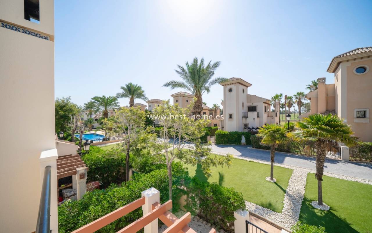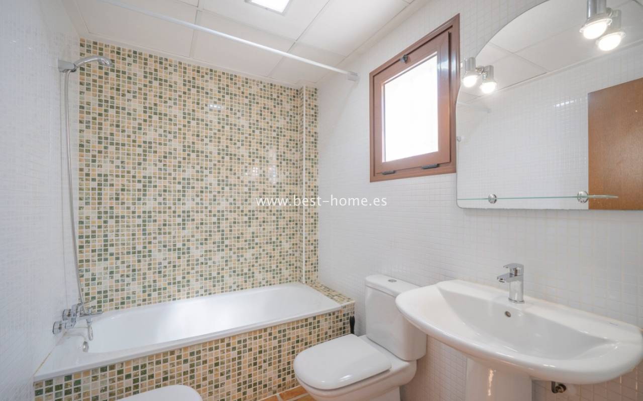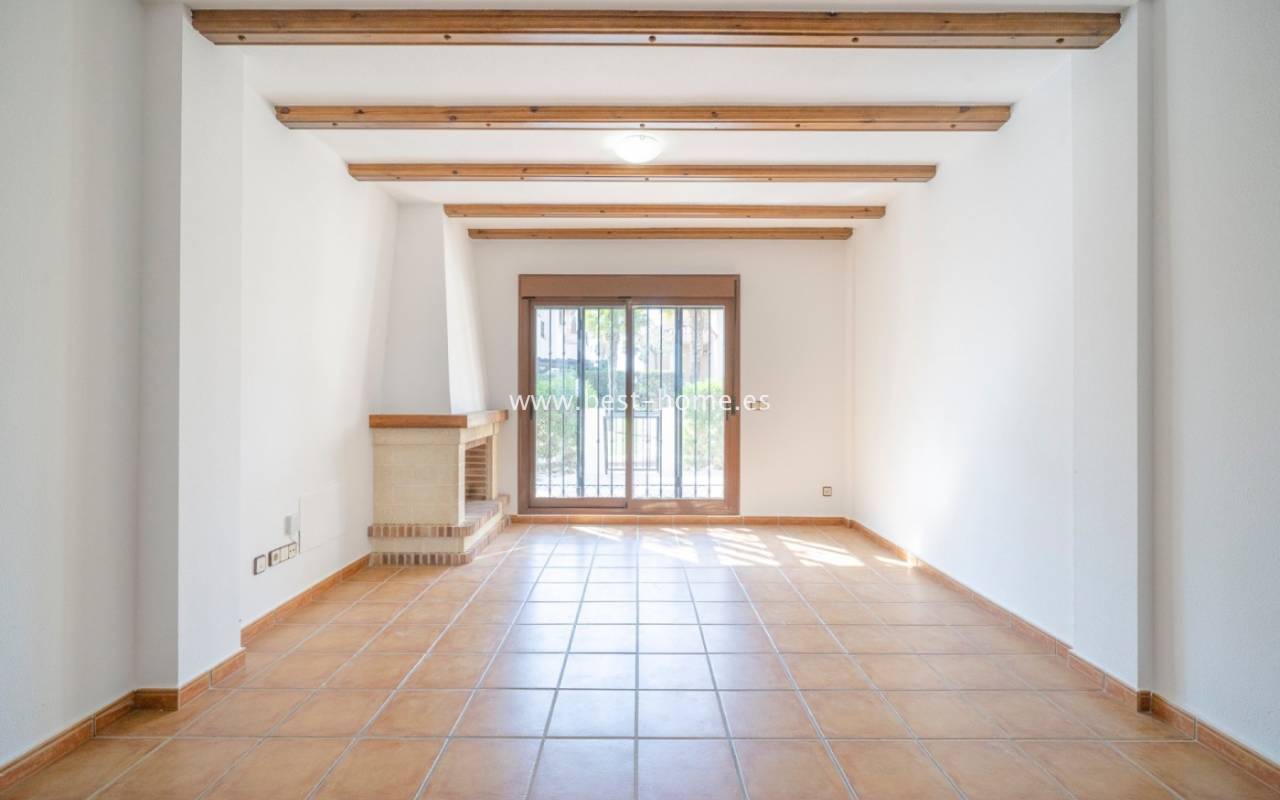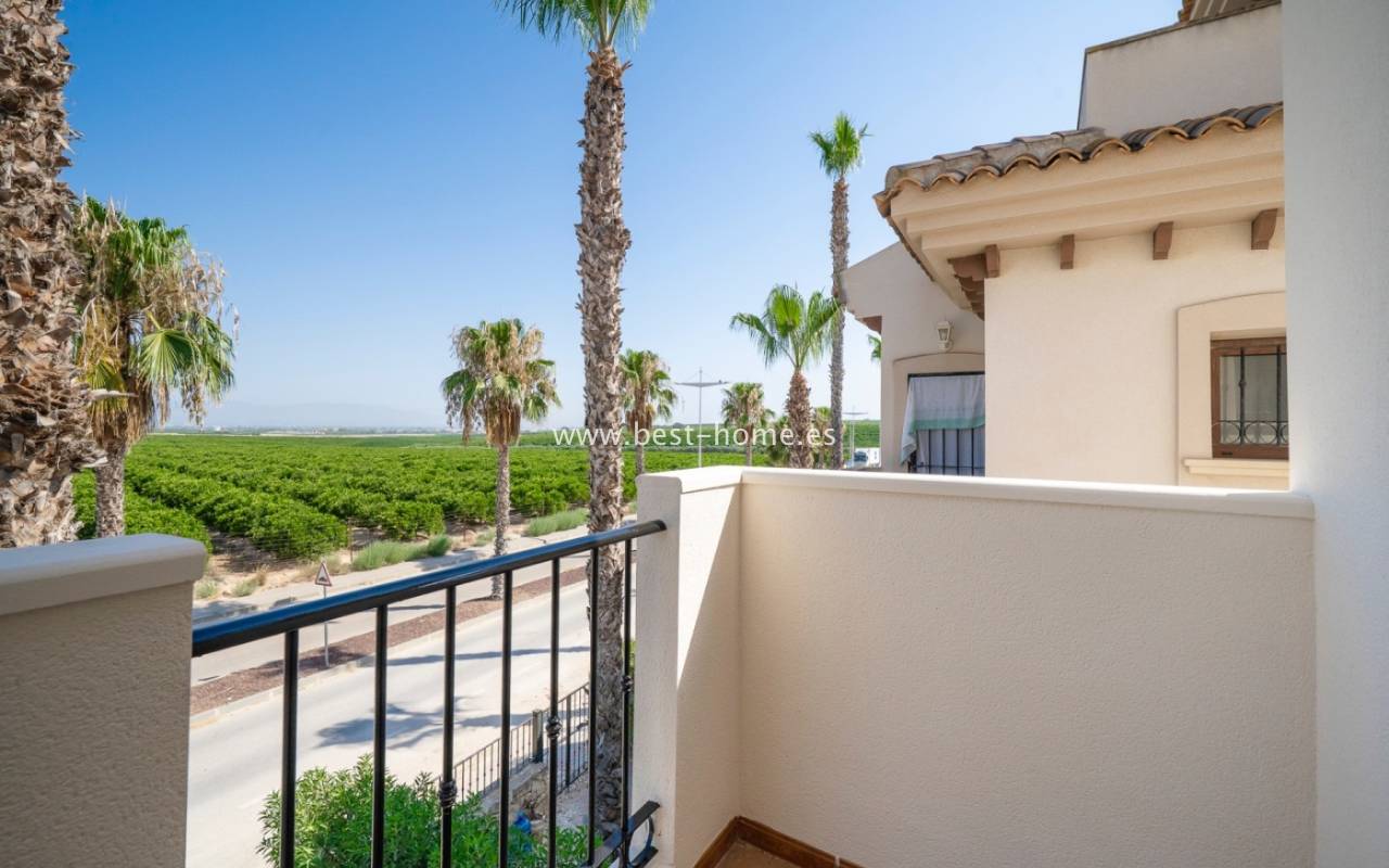 For sale is a semi-detached house located on the La Finca golf course. This secure, monitored complex offers all on-site amenities (restaurants, pharmacy, shops, and a ***** hotel with spa). The property has a front garden with a parking space. The ground floor comprises an entrance hall, a kitchen with a utility room, a bedroom, a bathroom, and a large living room with access to the terrace and garden. The first floor features two bedrooms, each with a terrace, and a family bathroom. The second floor boasts a private solarium with stunning views of the communal grounds, golf course, and orange orchards. The property is situated in a very attractive, quiet neighborhood.