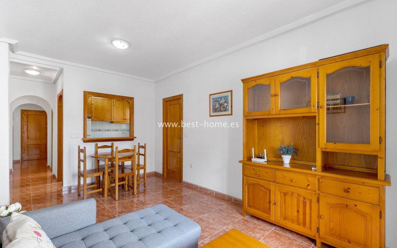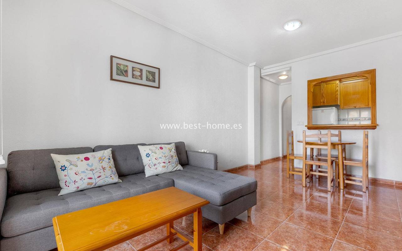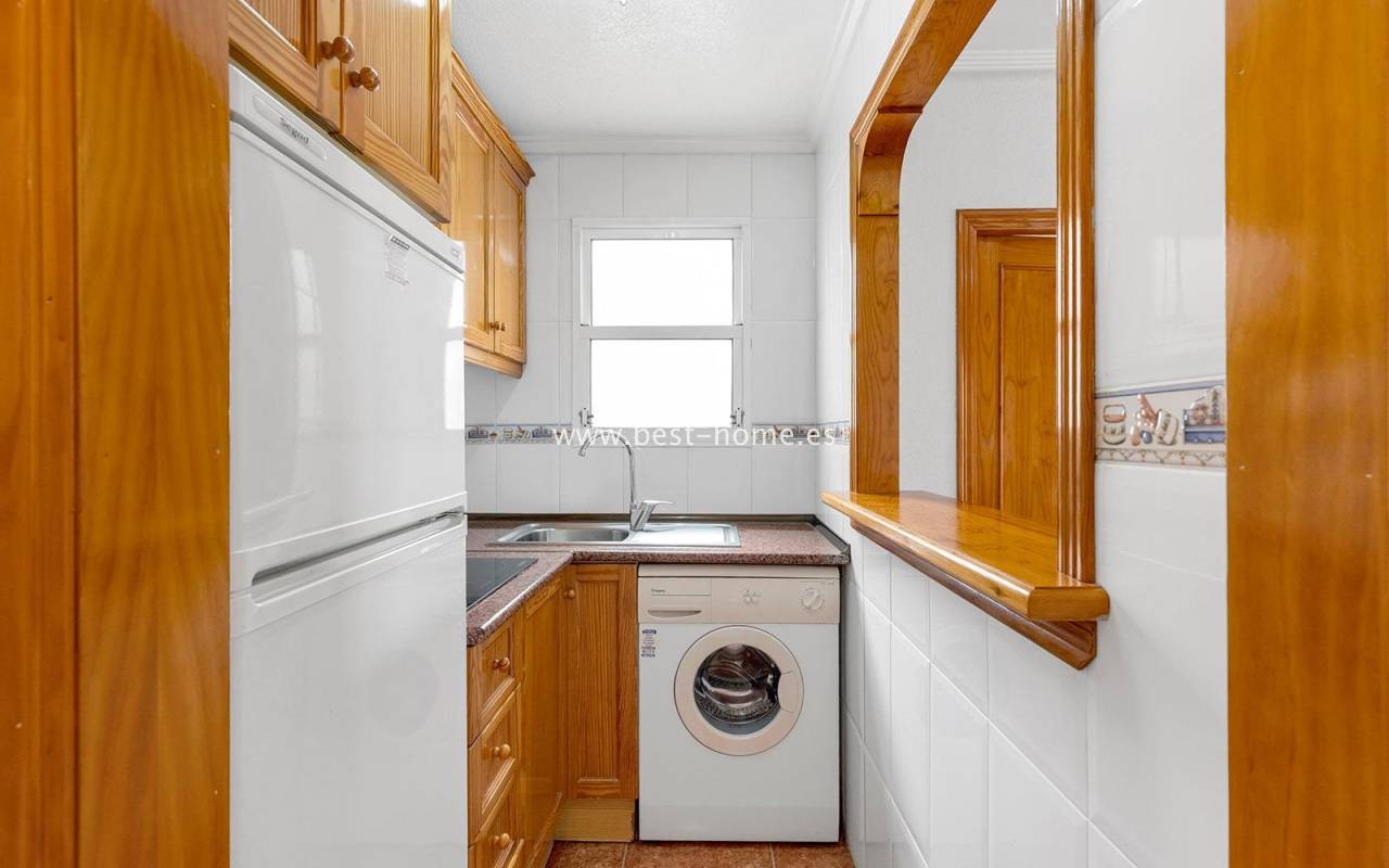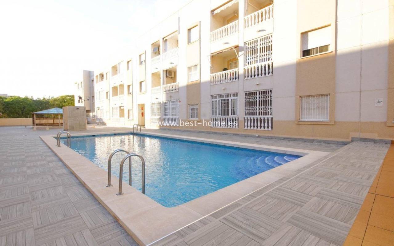 Cozy apartment close to the center of Torrevieja. It features a living room with access to a south-facing sun terrace, an American-style master bedroom with appliances, two double bedrooms, including the master bedroom with a built-in wardrobe, and a bathroom. The apartment is sold with all necessary groceries. The complex also features a swimming pool for residents. Nearby is a large, beautiful park, a children's playground, and numerous bars, restaurants, cafes, and ice cream parlors.