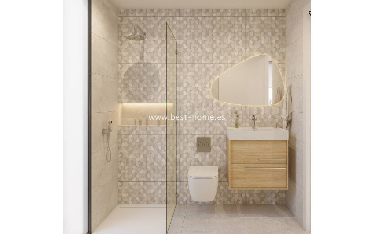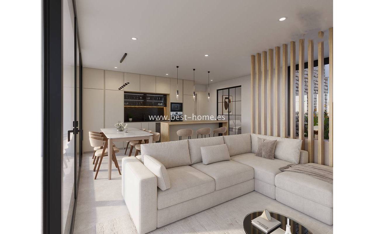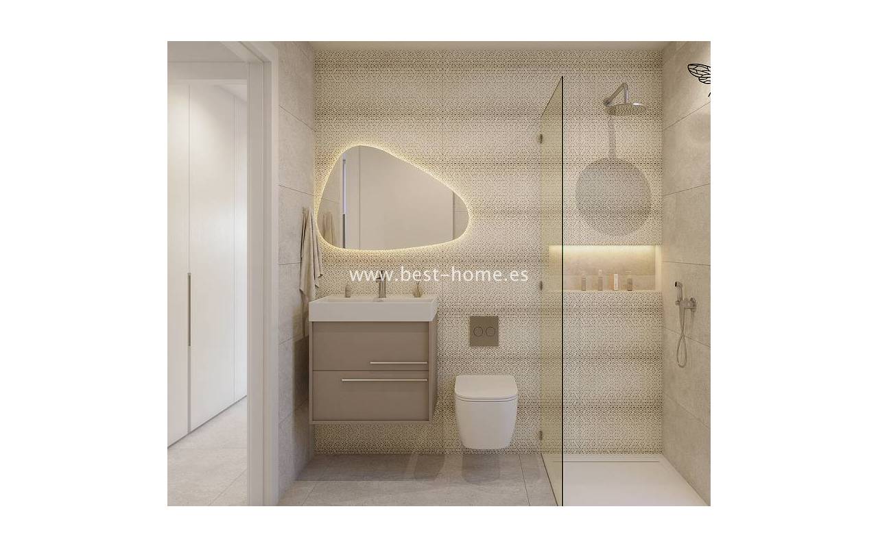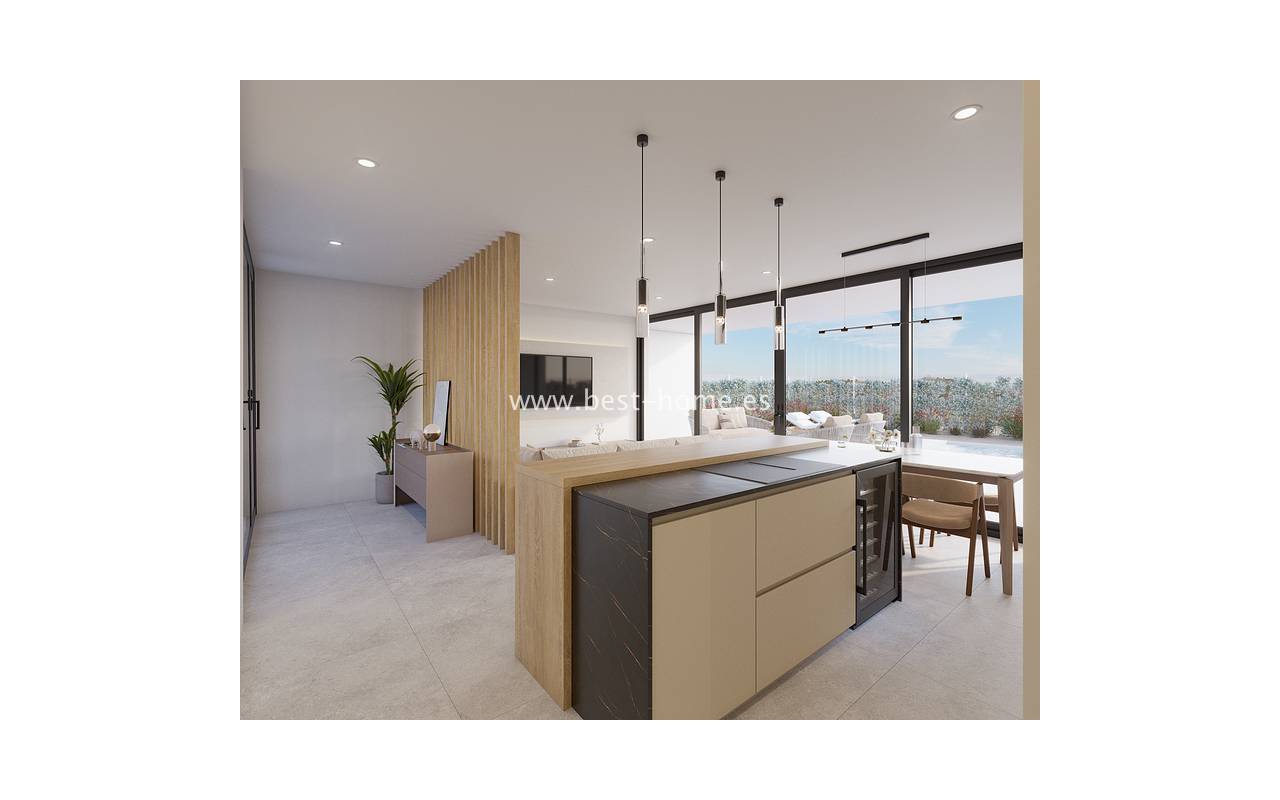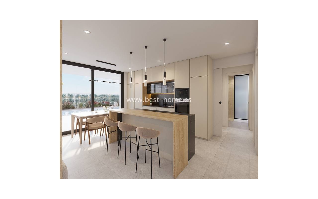 These fantastic new villas are being built within the gated Hacienda del Alamo golf resort. Twenty-three single-story villas are available on plots ranging from 397 m² to 556 m². The 80 m² villas will feature a master bedroom with an en-suite bathroom, two further bedrooms, a second bathroom, a utility room, and a spacious living room with a dining area and a fitted kitchen. The price includes a fitted kitchen with appliances, pre-installed central hot/cold air conditioning, complete bathrooms, a private 3x6 m swimming pool, and a landscaped garden. External stairs lead to a 33 m² solarium/rooftop terrace. The resort also boasts a sports center, a 4-star hotel, and numerous restaurants and bars. Very attractive prices range from €306,000 to €320,400.