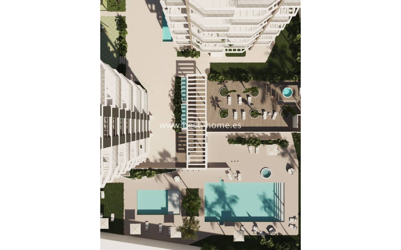 New, superbly located apartments being built in the beautiful town of Calpe. Spacious apartments are available with 3 bedrooms, 2 bathrooms, and a bright living room with a fitted kitchen. The living room opens onto a terrace with unobstructed views of the surrounding area (sea views from the upper floors). The price includes a fitted kitchen with appliances (induction hob, oven, hood, and refrigerator), central hot/cold air conditioning, finished bathrooms, electric exterior shutters, a parking space, and a storage unit in the basement. Residents will have access to two swimming pools with sun loungers surrounded by green areas, a children's playground, a paddle tennis court, and more.