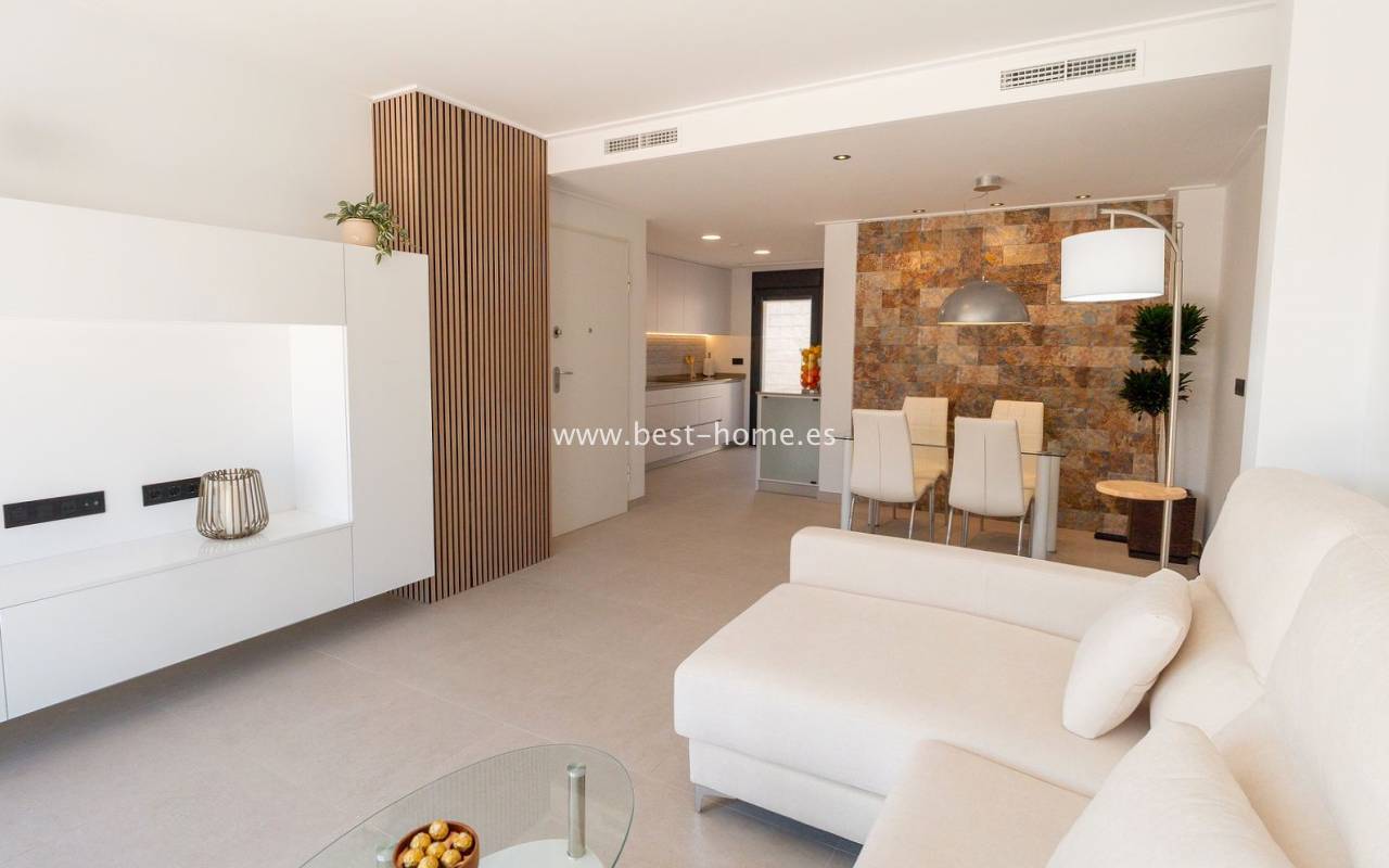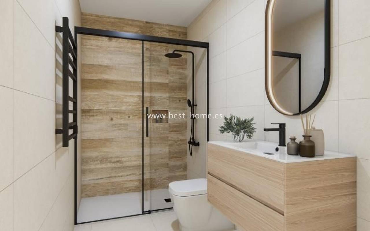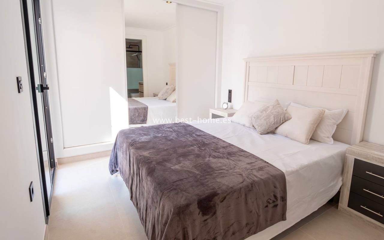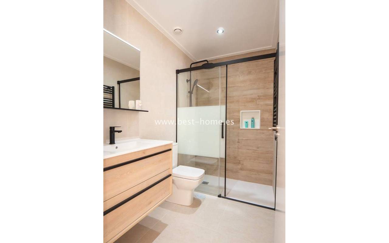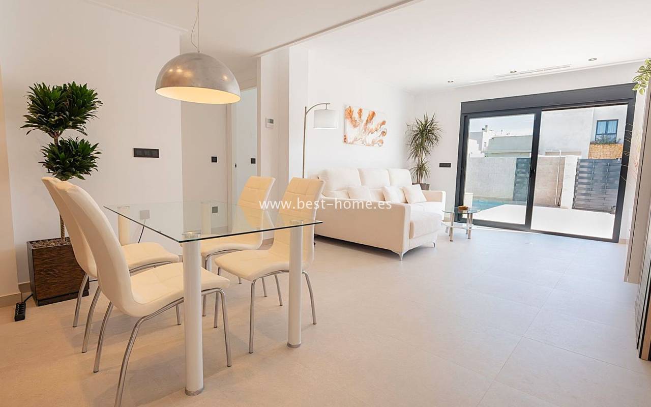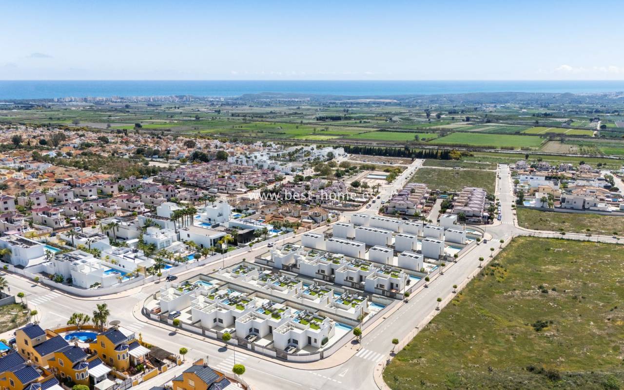 New single-story villas are being built in a quiet location in La Marina. The 90 m² homes will feature 3 bedrooms, 2 bathrooms, a furnished kitchen, and a spacious living/dining room. The living room will have access to the terrace and private pool. External stairs lead to the solarium/rooftop terrace, which can be set up as a jacuzzi and summer kitchen. The price includes a fitted kitchen, central hot/cold air conditioning, complete bathrooms, LED lighting, electric blinds, a private pool, and photovoltaic panels (1.5 kW). Bars and a supermarket are 600 m away, and the beach is 5.8 km away. The homes are certified for energy efficiency.