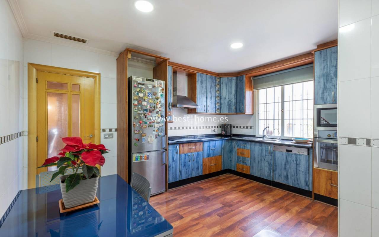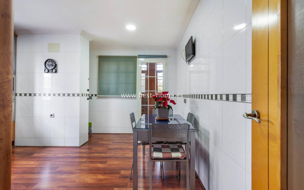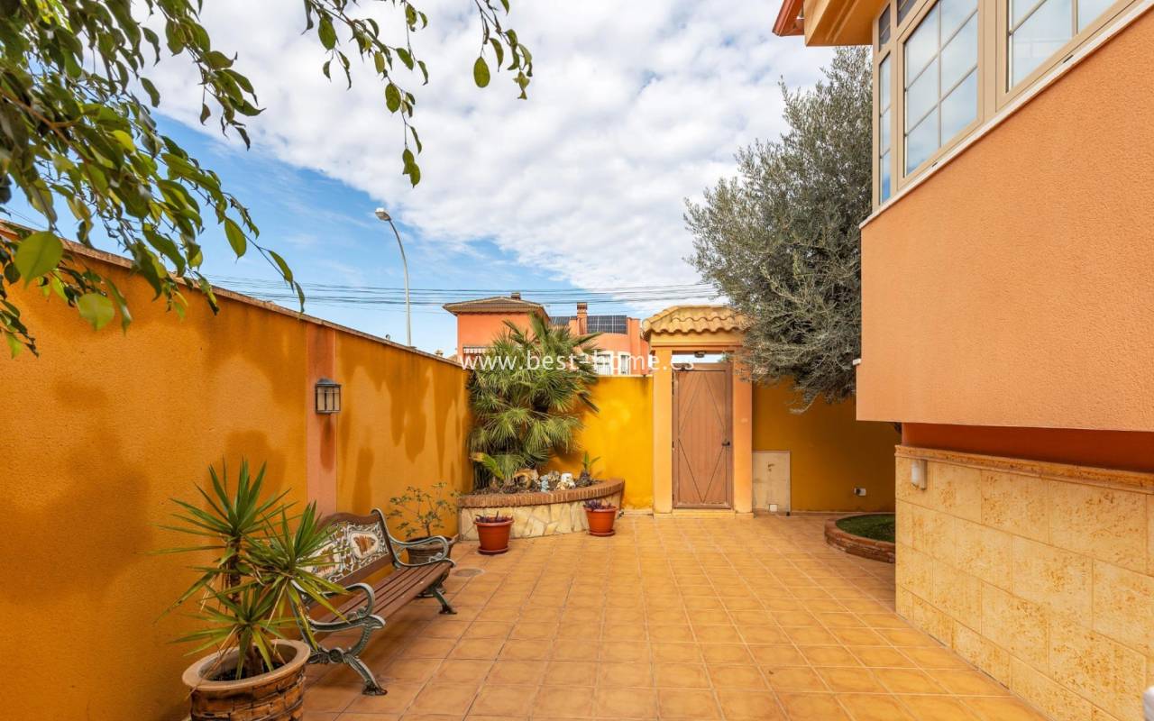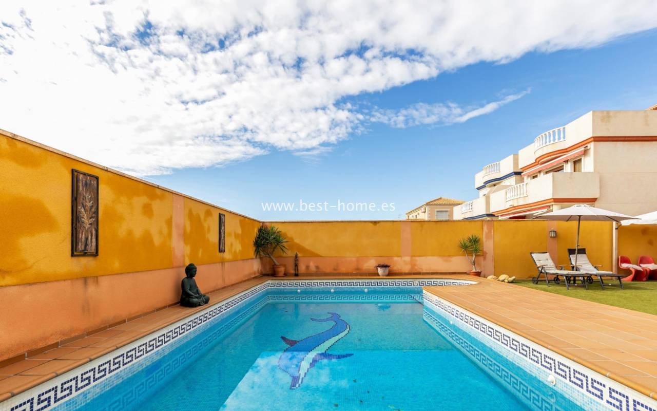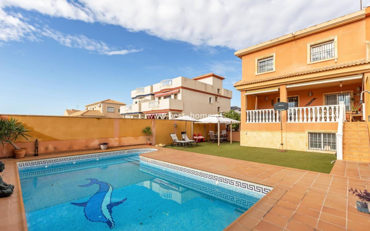 This charming semi-detached house boasts a 433 m² plot and a private pool in the tranquil Aguas Nevas development in Torrevieja. On the ground floor, you'll find a bright, sunny living room, a fully equipped kitchen, a first bedroom converted into an office, and a bathroom. The basement houses three double bedrooms and a second bathroom. Additionally, the property boasts a garage for 3-4 cars, a children's playground, a large private swimming pool, and a brick barbecue with a lounge area. The apartment is furnished and equipped with air conditioning.