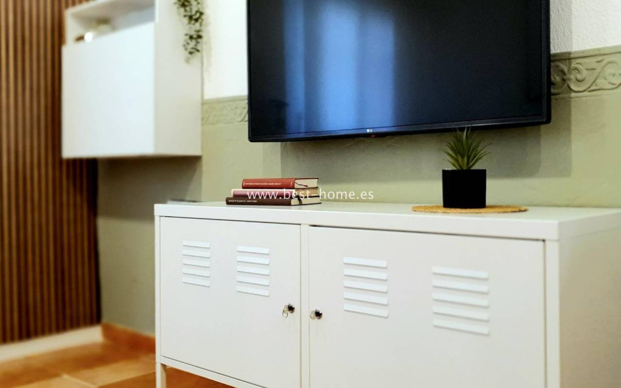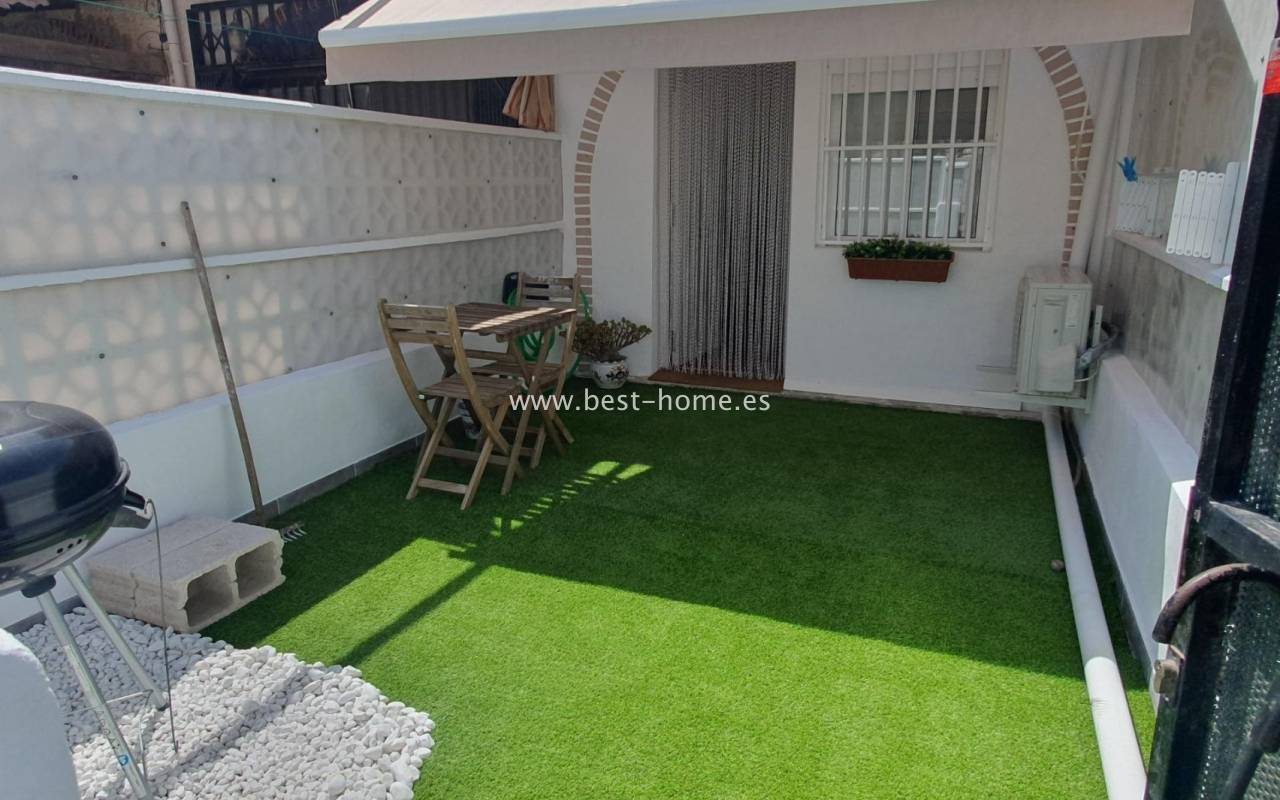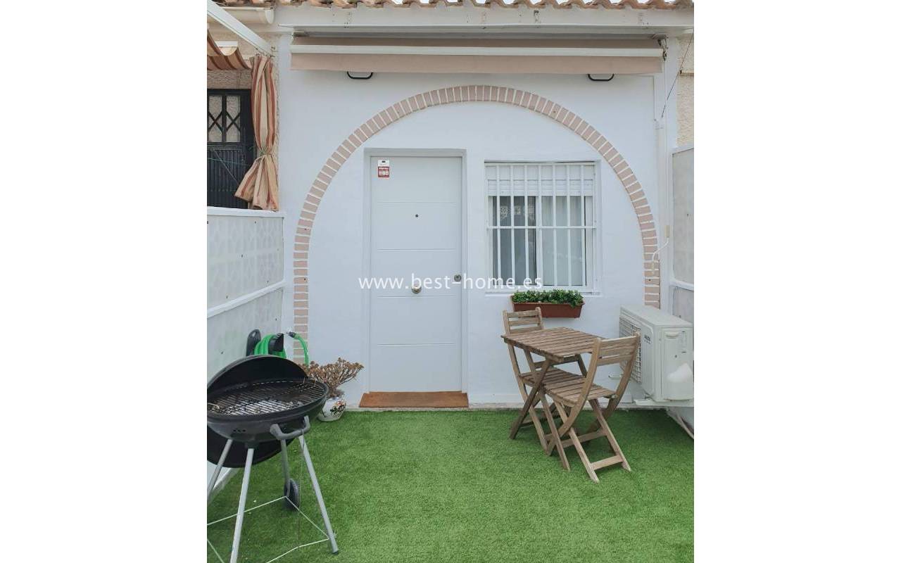 Bungalow with a private garden in the Aguas Nuevas urbanization in Torrevieja. It features a garden with a barbecue, which leads to the living room, which features a sofa, TV, open-plan renovated kitchen equipped with appliances, one double bedroom with a built-in wardrobe, a bathroom, and a utility room. The apartment is cozy, furnished, and ready to move in. Nearby, you'll find a large number of shops, cafes, and restaurants.