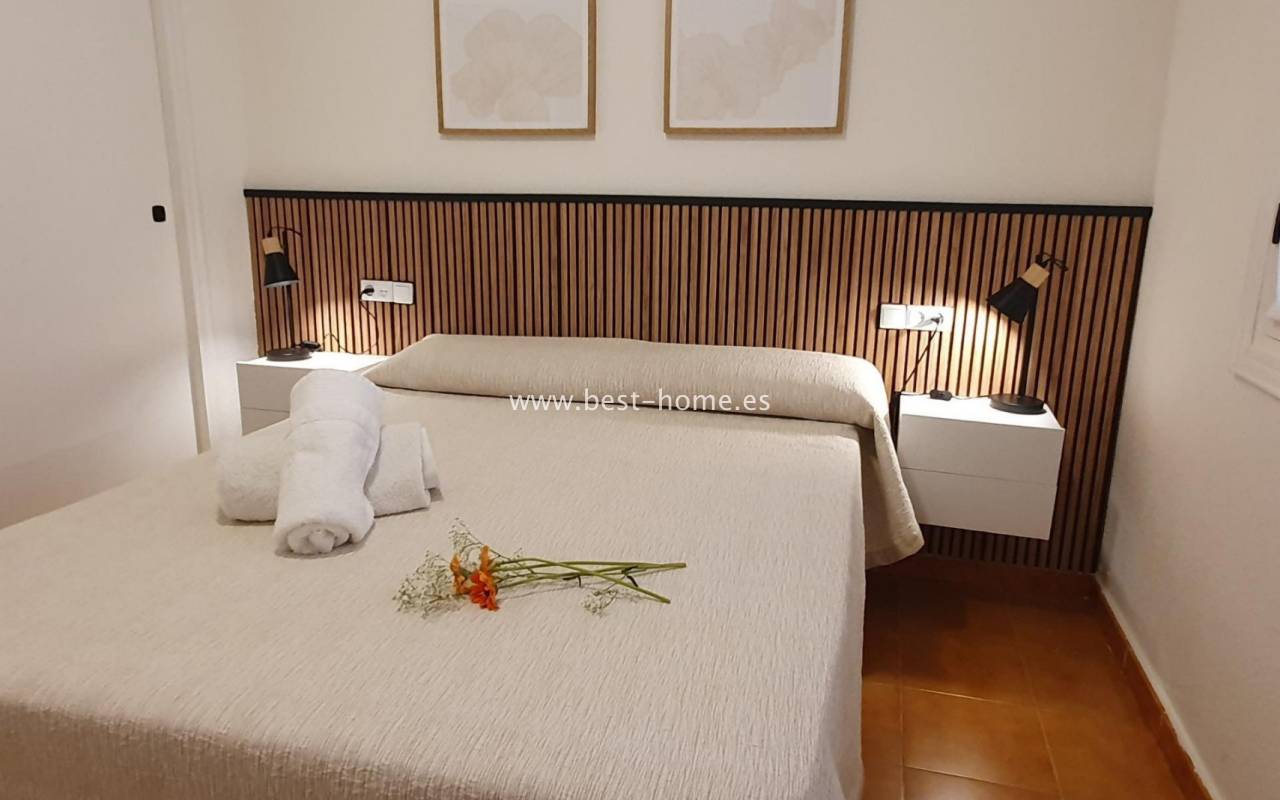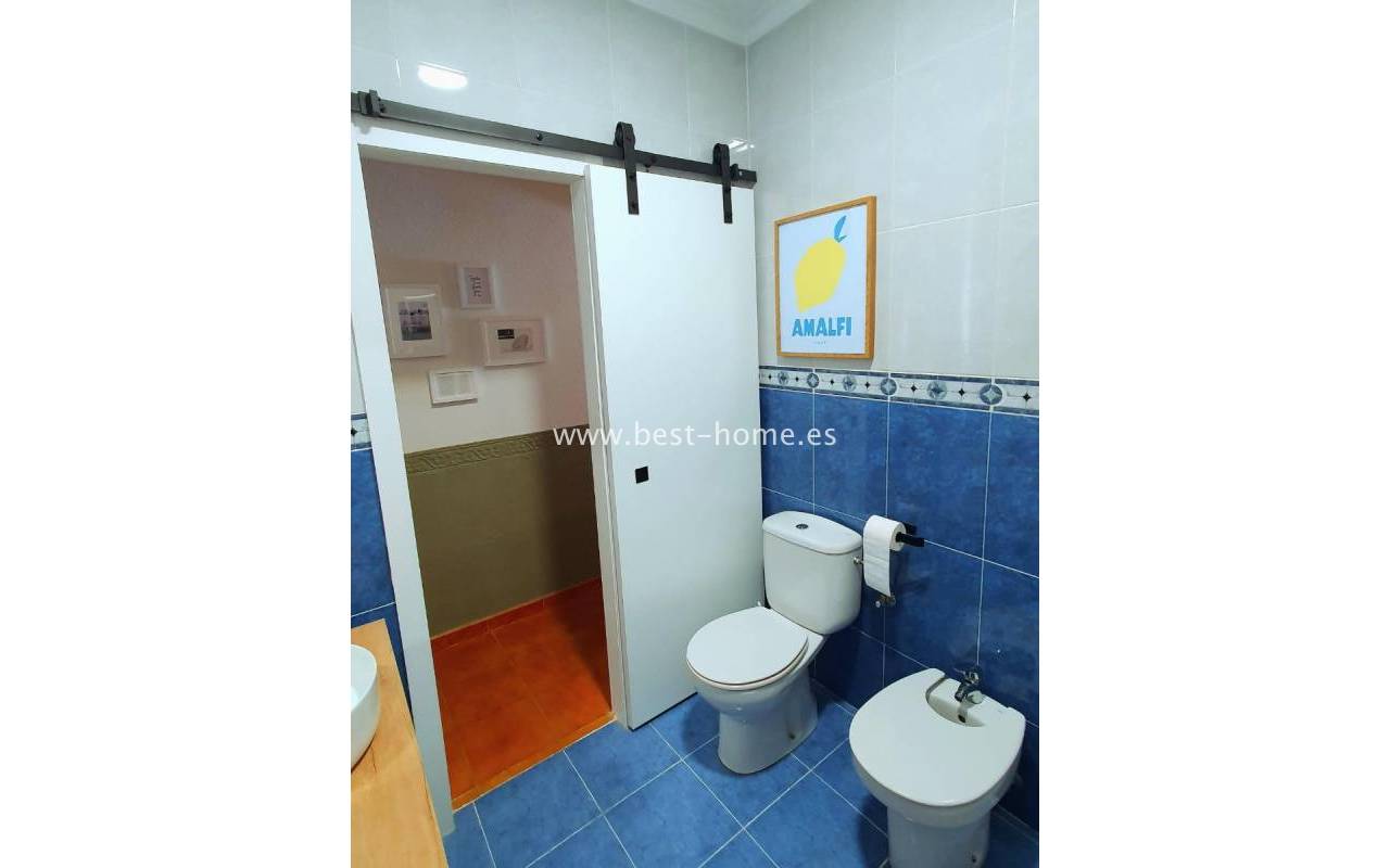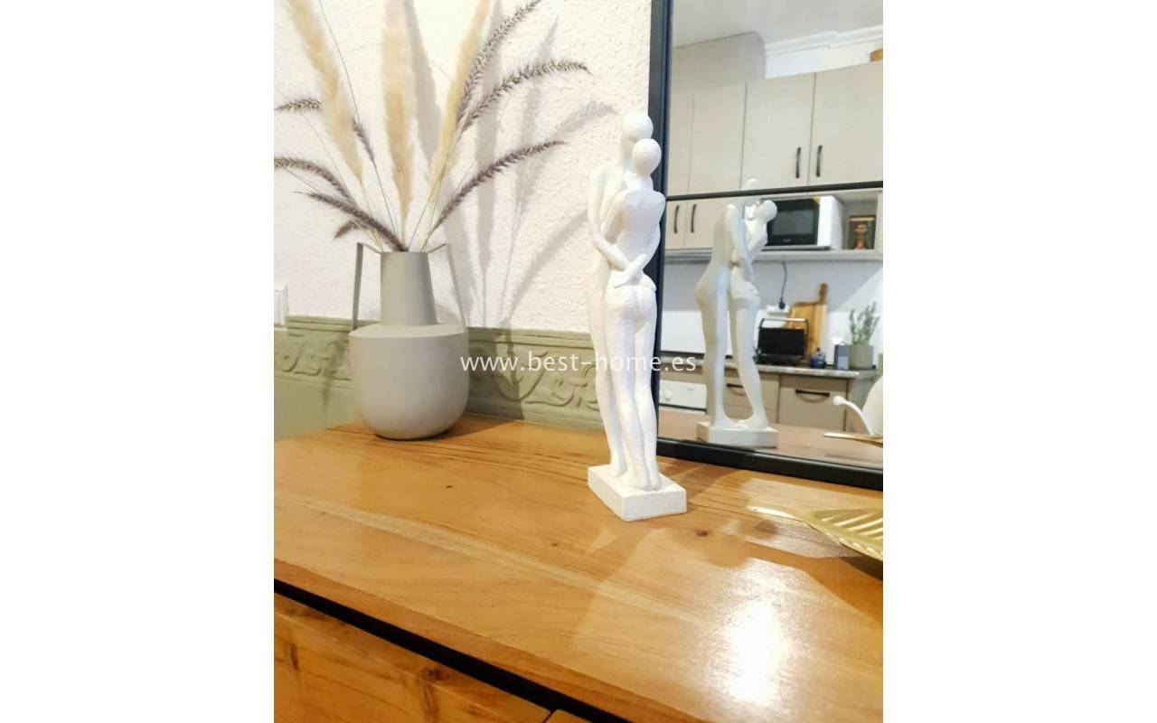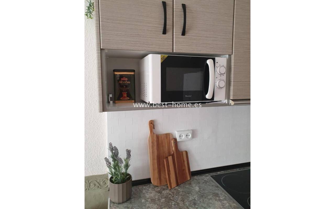 Bungalow with a private garden in the Aguas Nuevas urbanization in Torrevieja. It features a garden with a barbecue, which leads to the living room, which features a sofa, TV, open-plan renovated kitchen equipped with appliances, one double bedroom with a built-in wardrobe, a bathroom, and a utility room. The apartment is cozy, furnished, and ready to move in. Nearby, you'll find a large number of shops, cafes, and restaurants.
