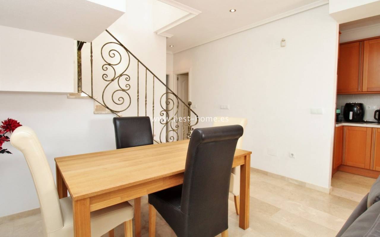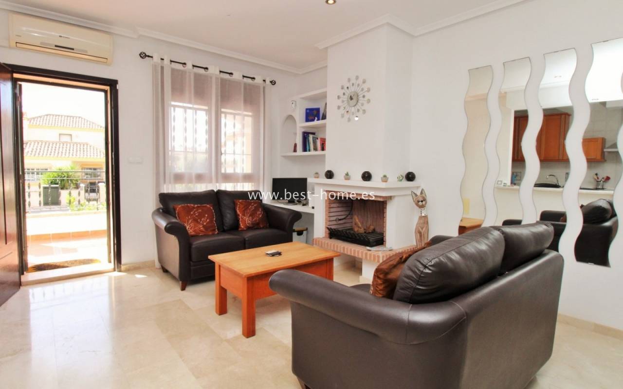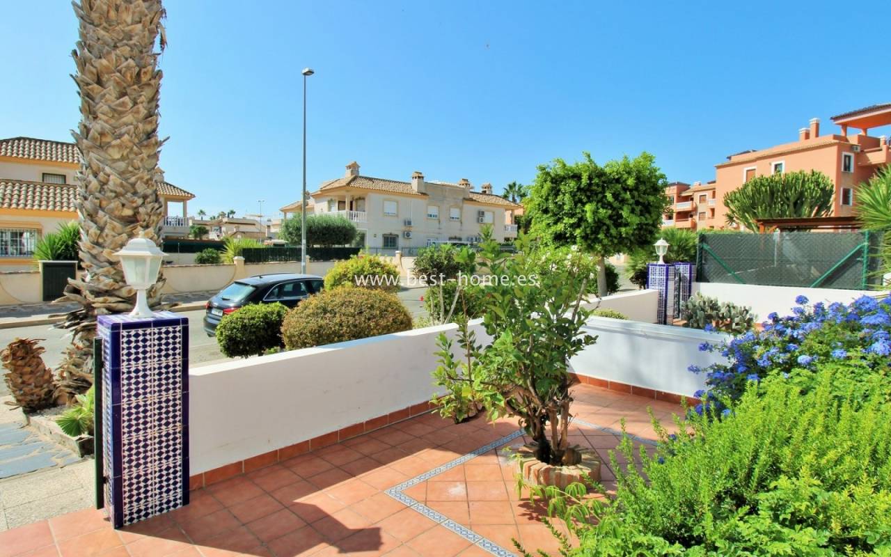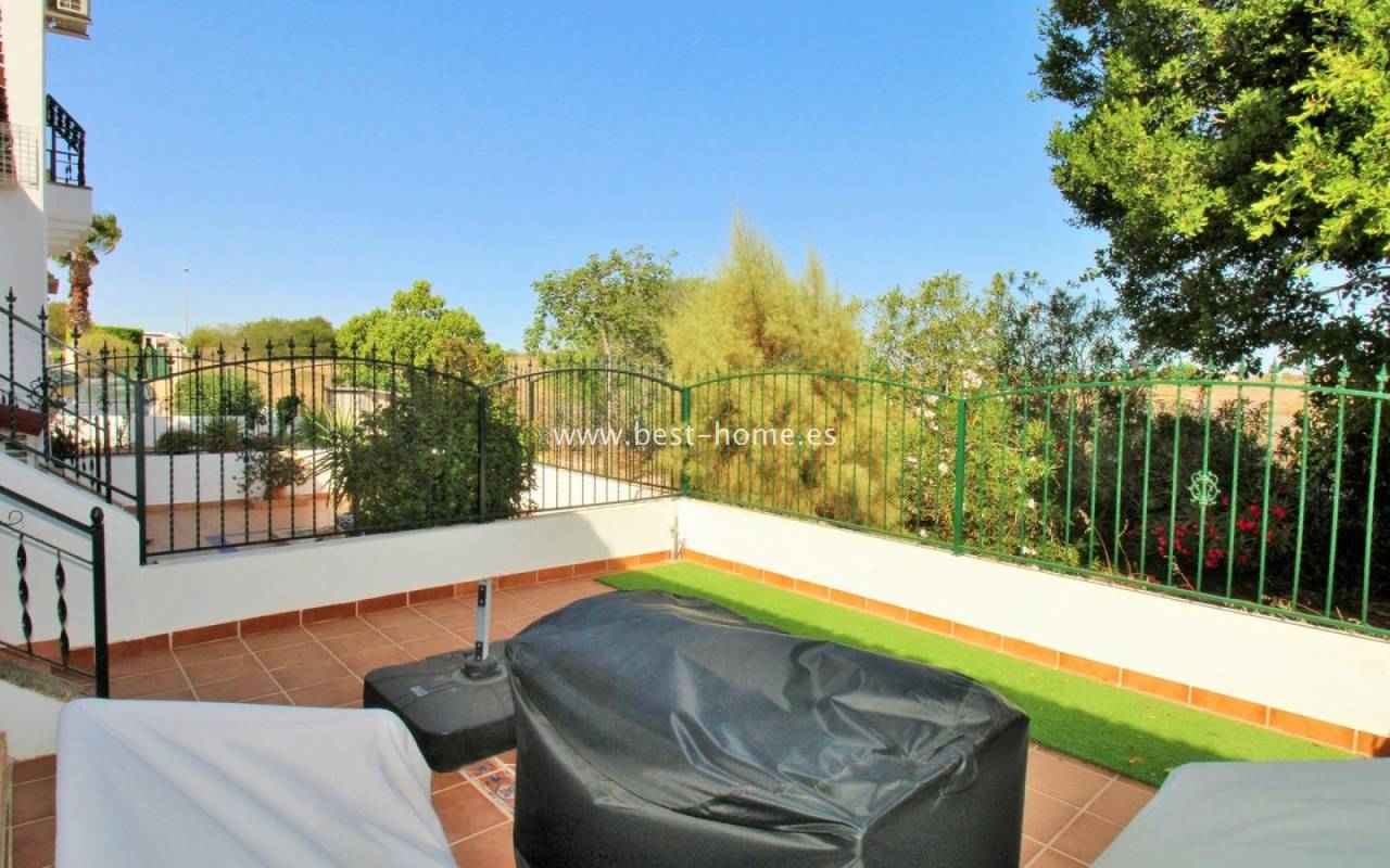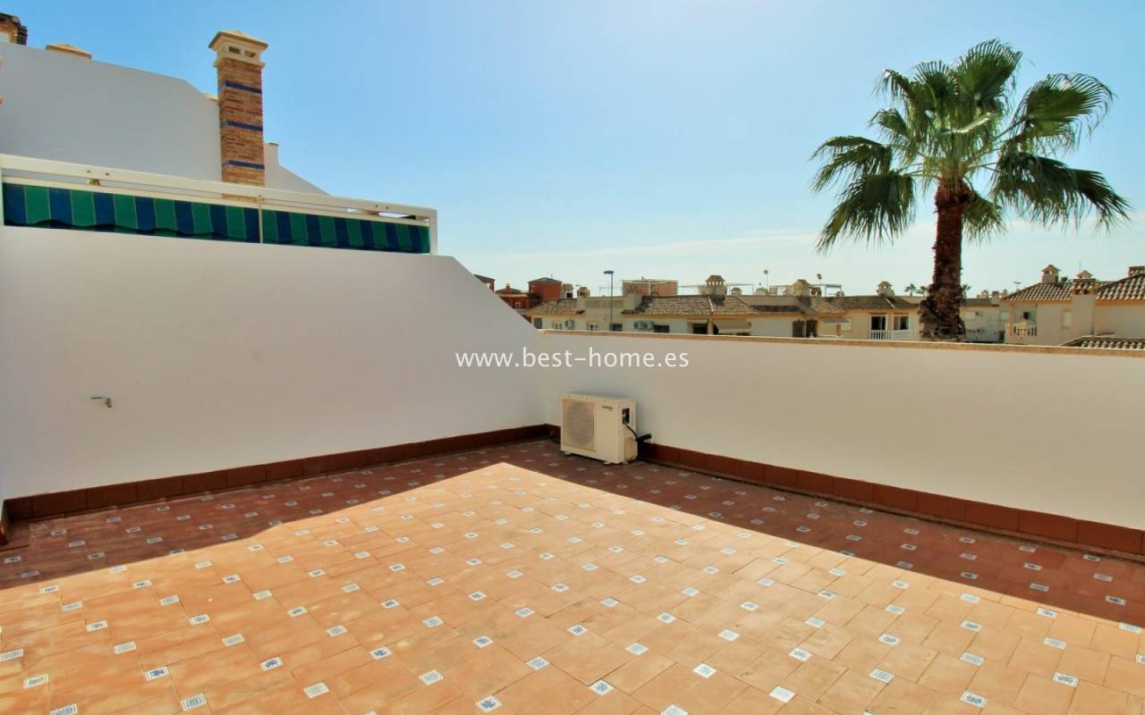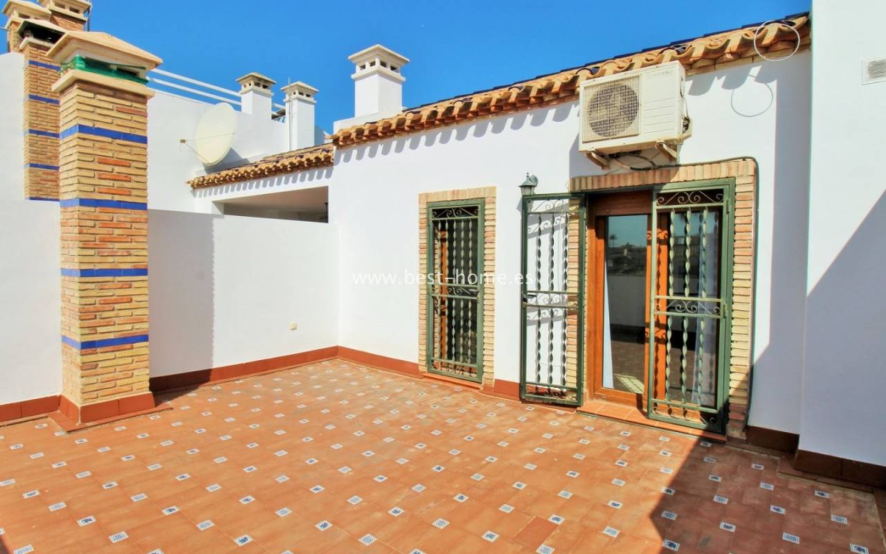 The terraced house in Villamartin is an elegant property with a distinctive Spanish character. It consists of three spacious bedrooms and two bathrooms spread over two floors, ensuring a comfortable layout for the whole family. At the front and back of the house there are gardens that invite relaxation and provide a private outdoor space, while an additional advantage is the upstairs terrace, perfect for enjoying breakfast in the morning or unwinding in the afternoon. Built in 2005, the house stands out for its high-quality finishes, including marble floors that emphasize the elegance of the interiors. The entire residential complex is designed in a traditional Spanish style, and residents have access to a community swimming pool, adding charm and comfort to everyday life.