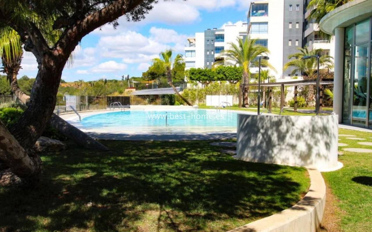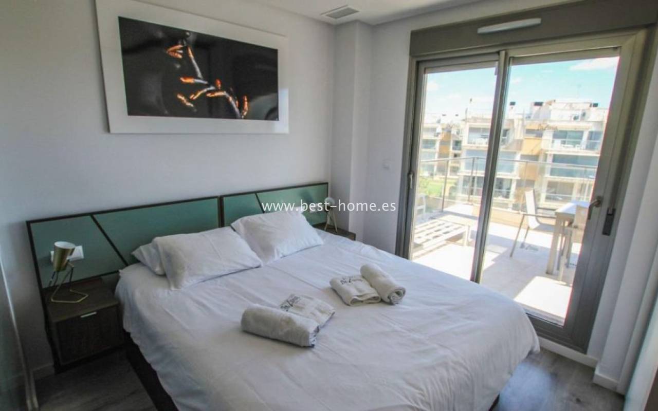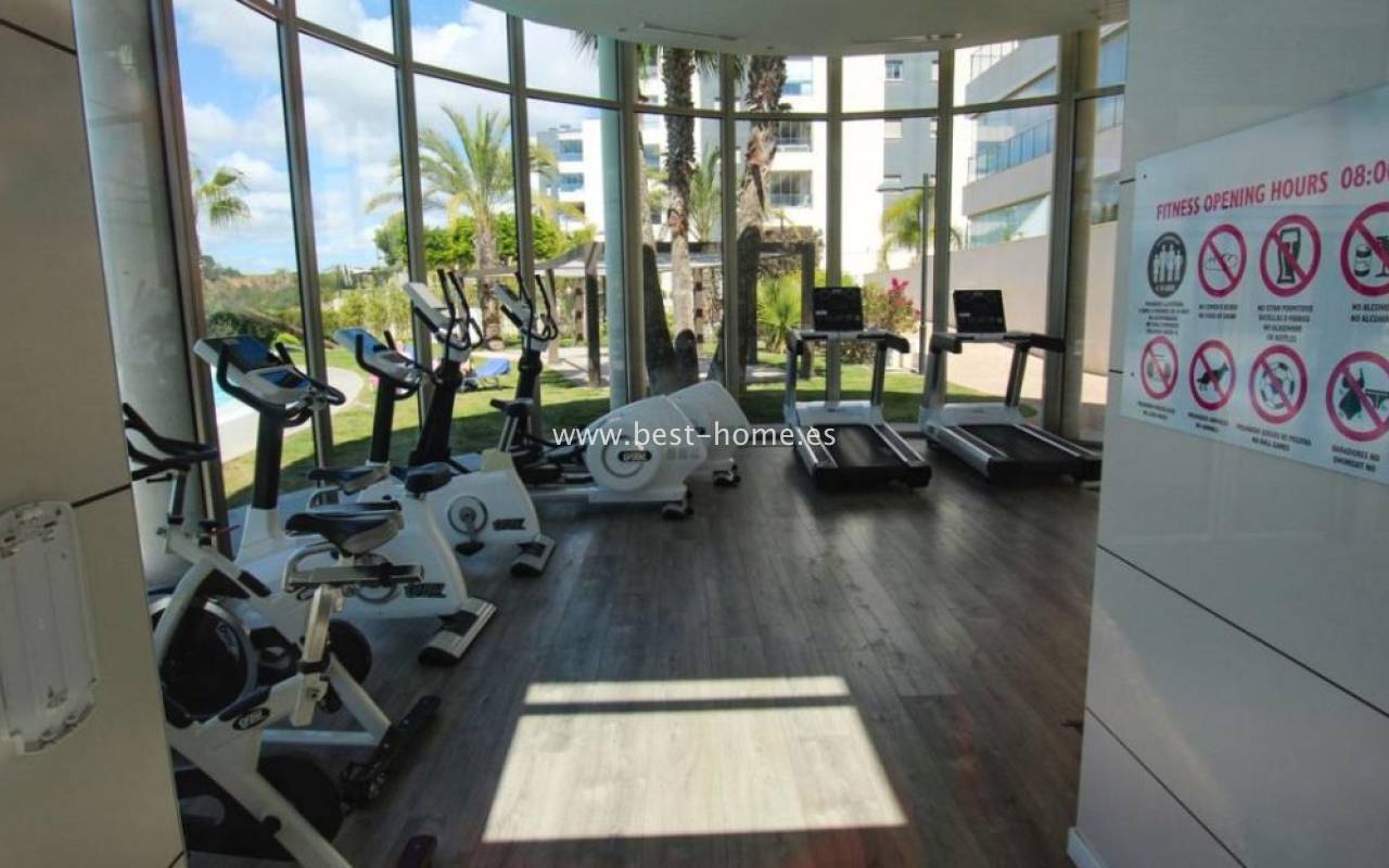 A penthouse in a new gated community offering residents two outdoor pools, a heated indoor pool, a sauna, and a gym.