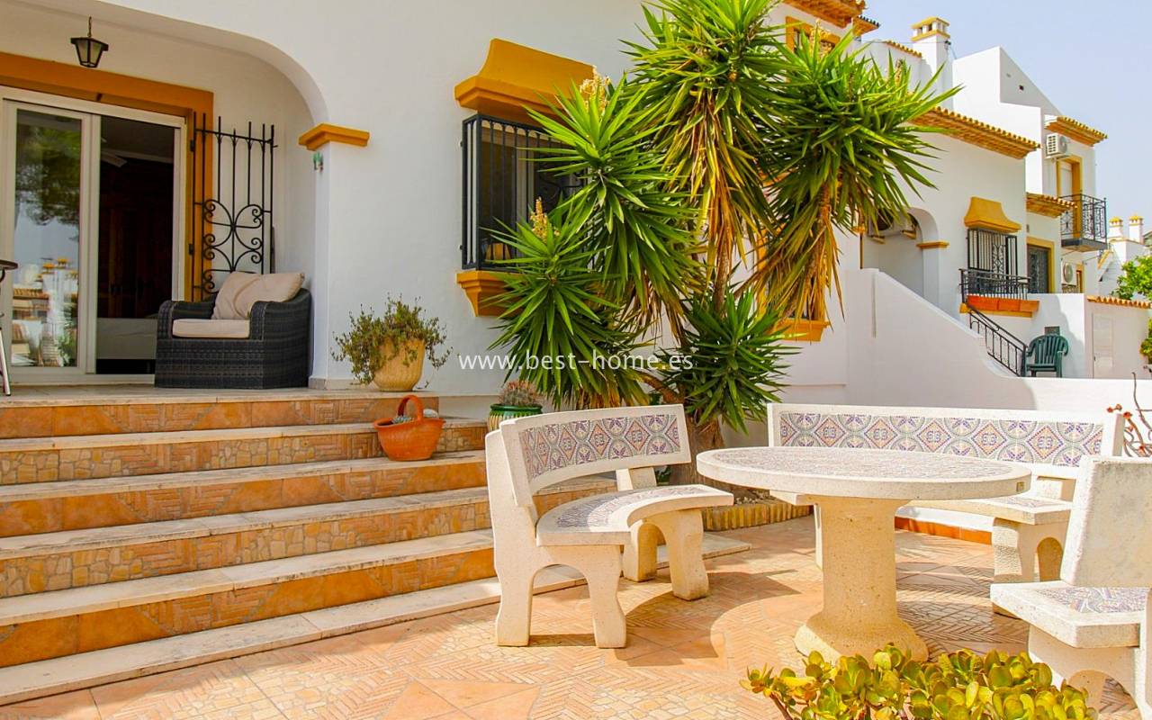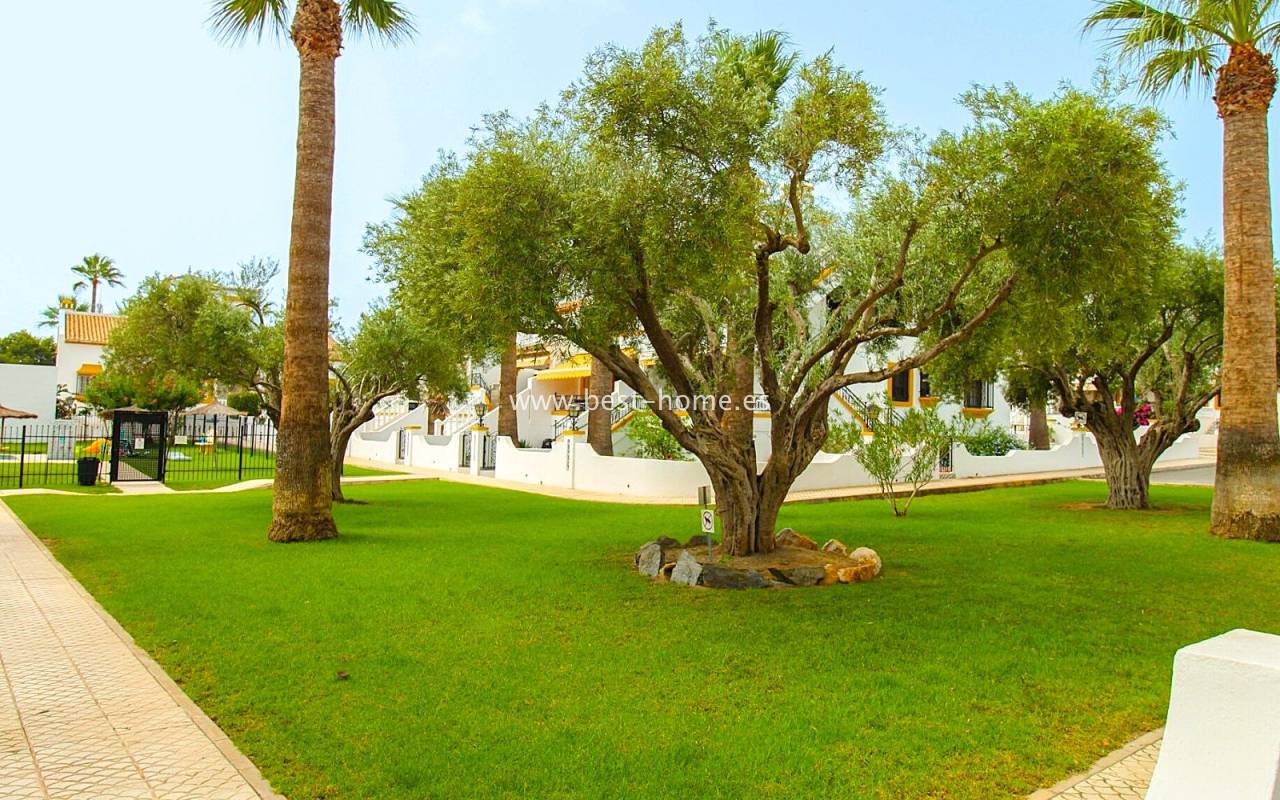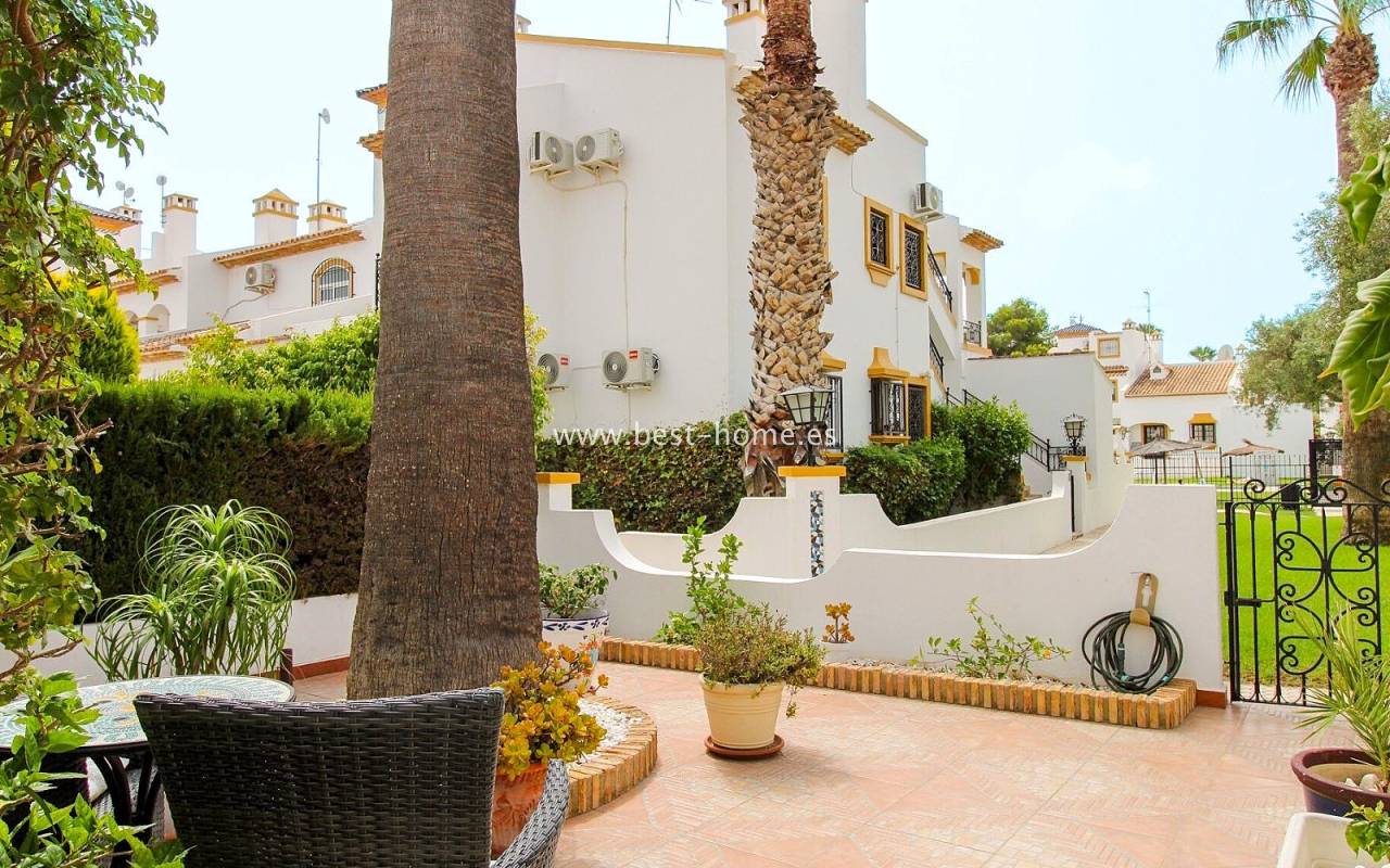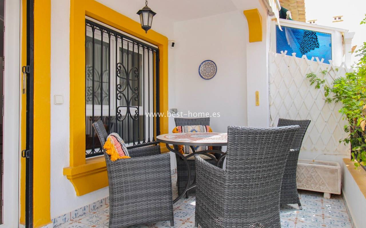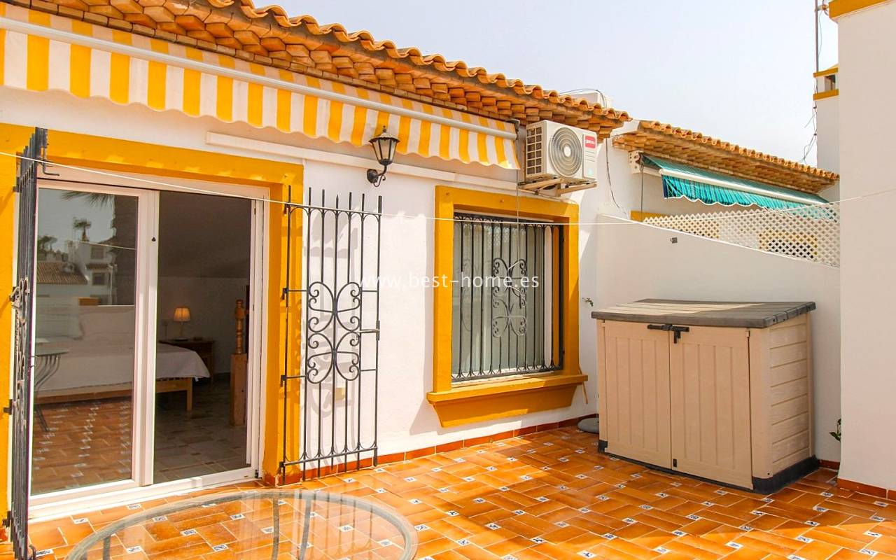 This terraced house is located in the beautiful, quiet, and leafy Valencia urbanization in Villamértin. The property boasts a front garden with a palm tree, a raised entrance terrace, a living room with a fireplace, a fitted kitchen with a utility room, two bedrooms, and a renovated bathroom. The master bedroom opens onto the rear terrace/garden and a wonderful communal courtyard. On the first floor, you'll find a third bedroom with a bathroom and a terrace. The price includes partial furniture, appliances, and air conditioning. The swimming pool is just 50 meters away, and nearby are restaurants, tennis courts, and walking trails. The property has both south and north orientations.