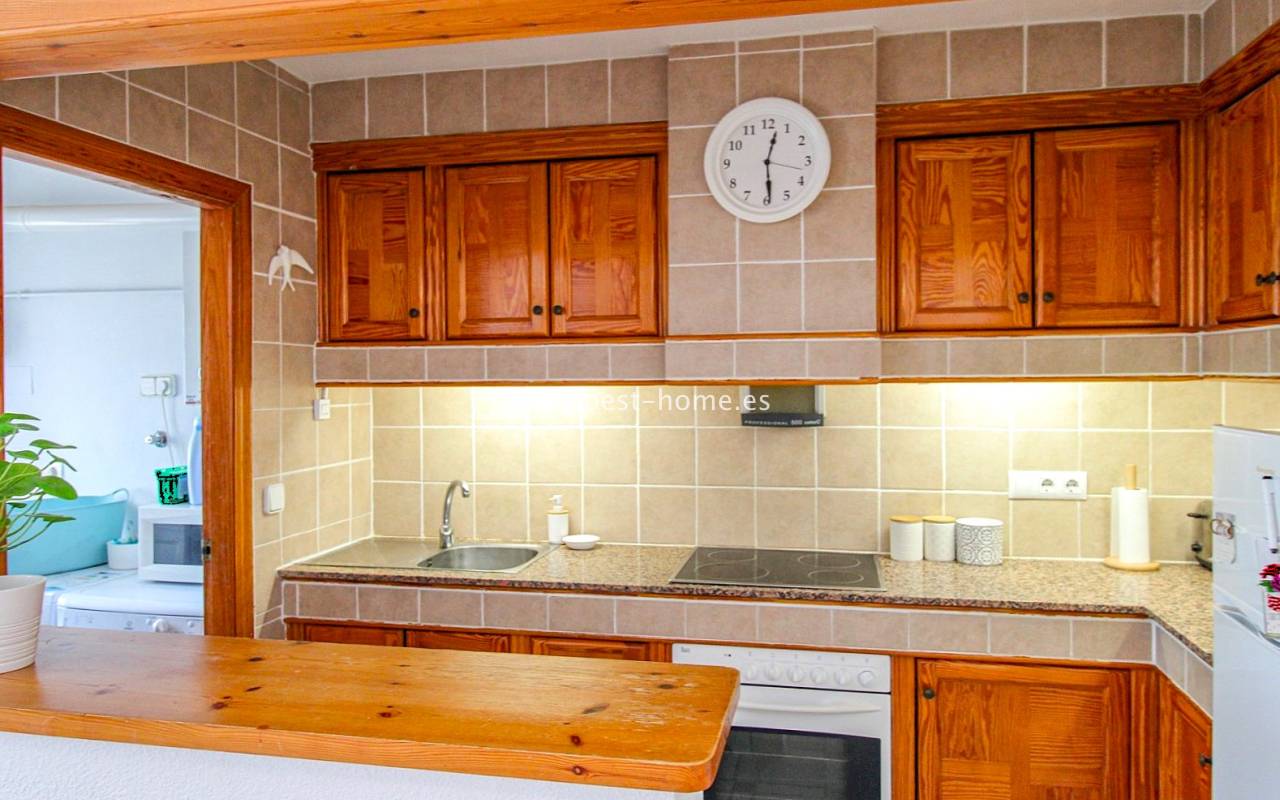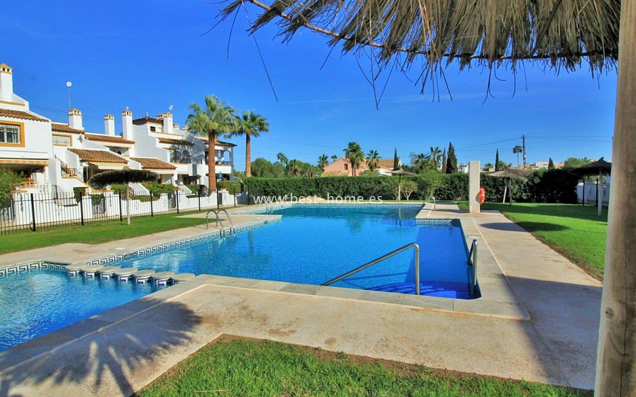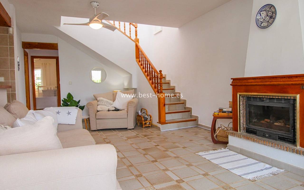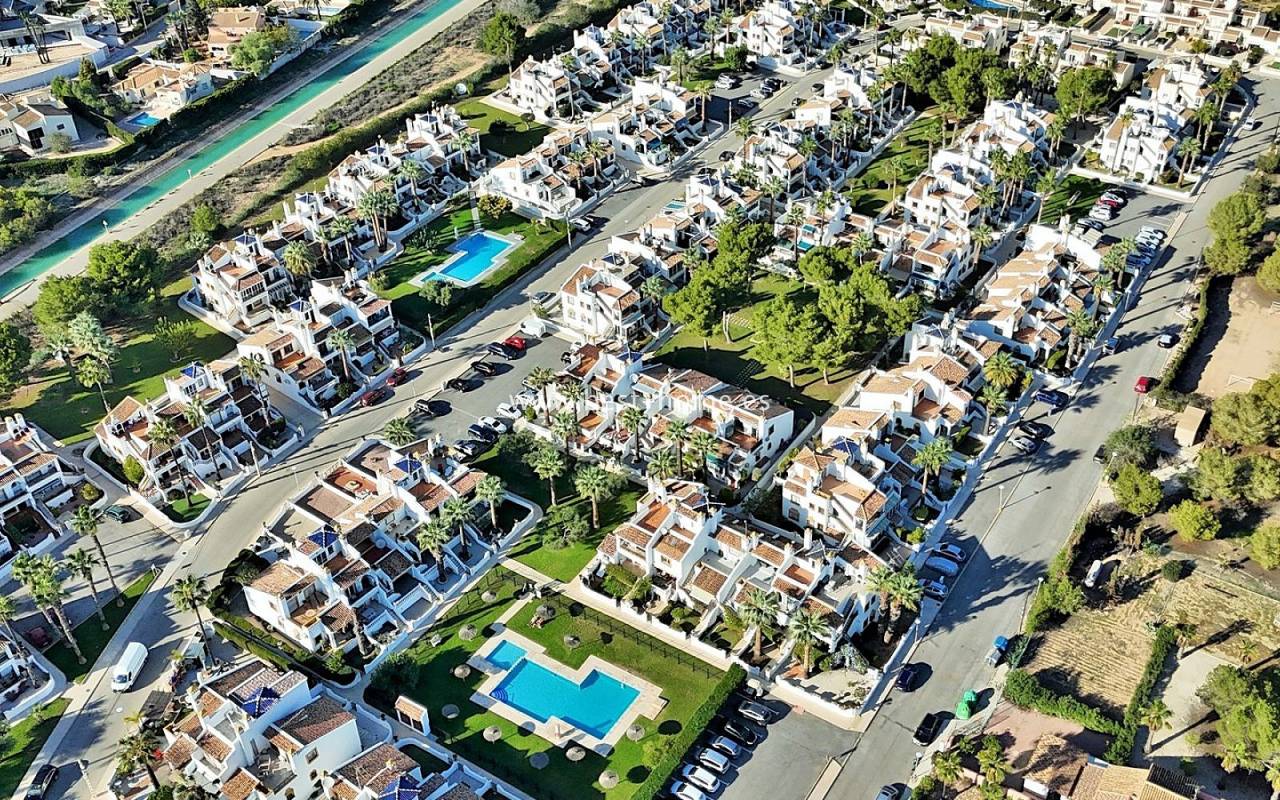 This terraced house is located in the beautiful, quiet, and leafy Valencia urbanization in Villamértin. The property boasts a front garden with a palm tree, a raised entrance terrace, a living room with a fireplace, a fitted kitchen with a utility room, two bedrooms, and a renovated bathroom. The master bedroom opens onto the rear terrace/garden and a wonderful communal courtyard. On the first floor, you'll find a third bedroom with a bathroom and a terrace. The price includes partial furniture, appliances, and air conditioning. The swimming pool is just 50 meters away, and nearby are restaurants, tennis courts, and walking trails. The property has both south and north orientations.