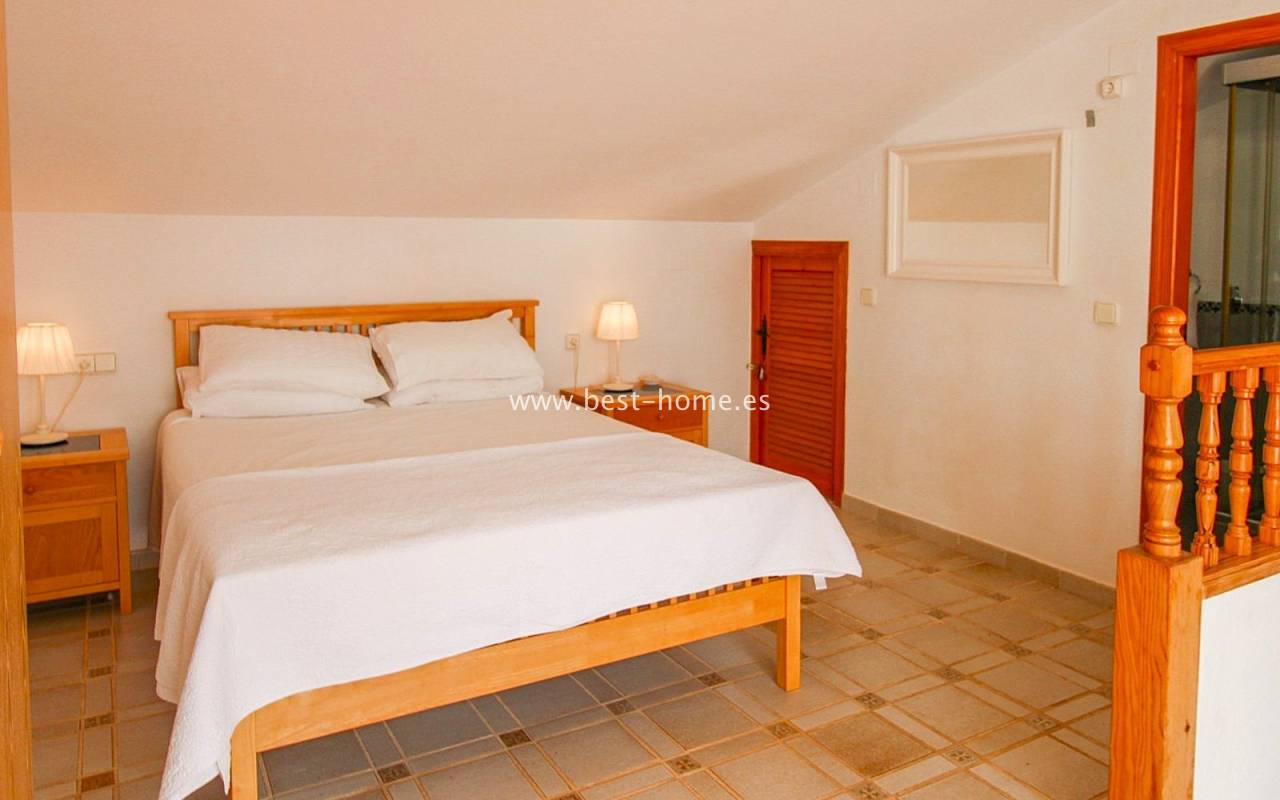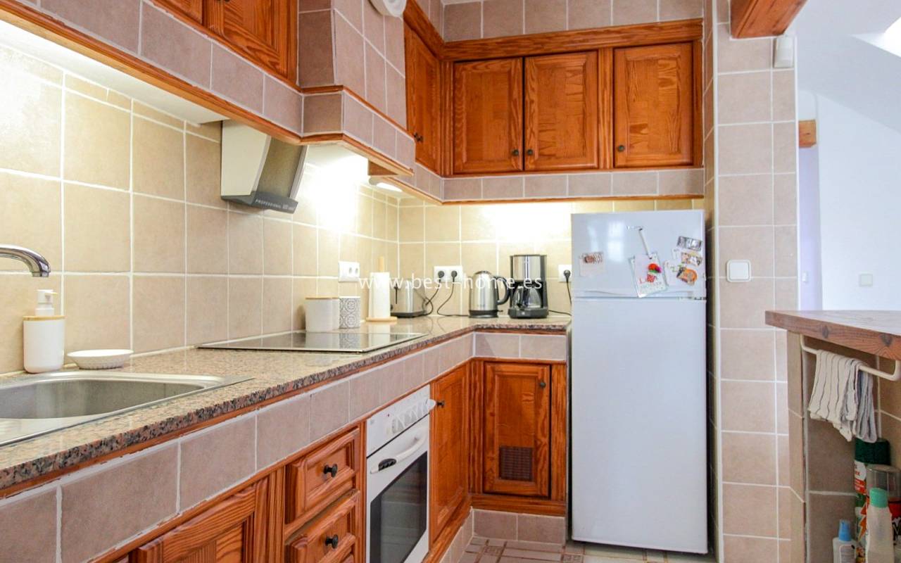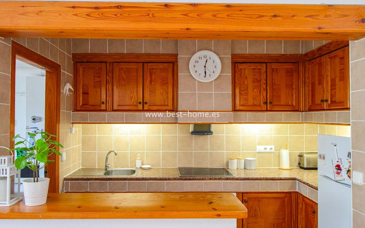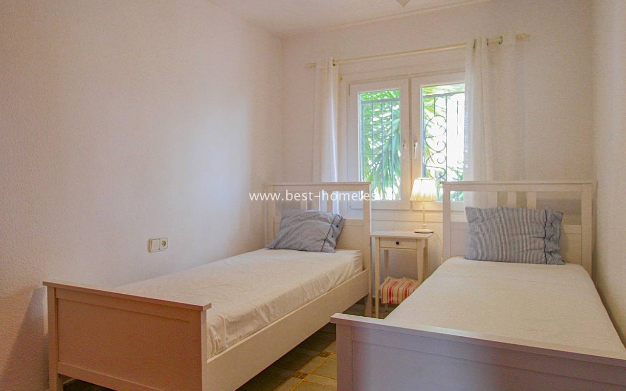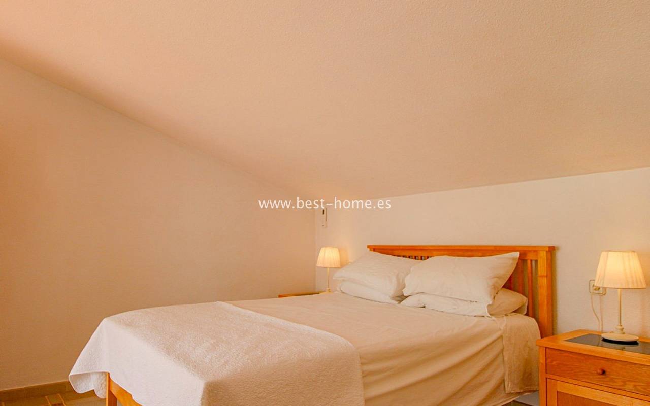 This terraced house is located in the beautiful, quiet, and leafy Valencia urbanization in Villamértin. The property boasts a front garden with a palm tree, a raised entrance terrace, a living room with a fireplace, a fitted kitchen with a utility room, two bedrooms, and a renovated bathroom. The master bedroom opens onto the rear terrace/garden and a wonderful communal courtyard. On the first floor, you'll find a third bedroom with a bathroom and a terrace. The price includes partial furniture, appliances, and air conditioning. The swimming pool is just 50 meters away, and nearby are restaurants, tennis courts, and walking trails. The property has both south and north orientations.